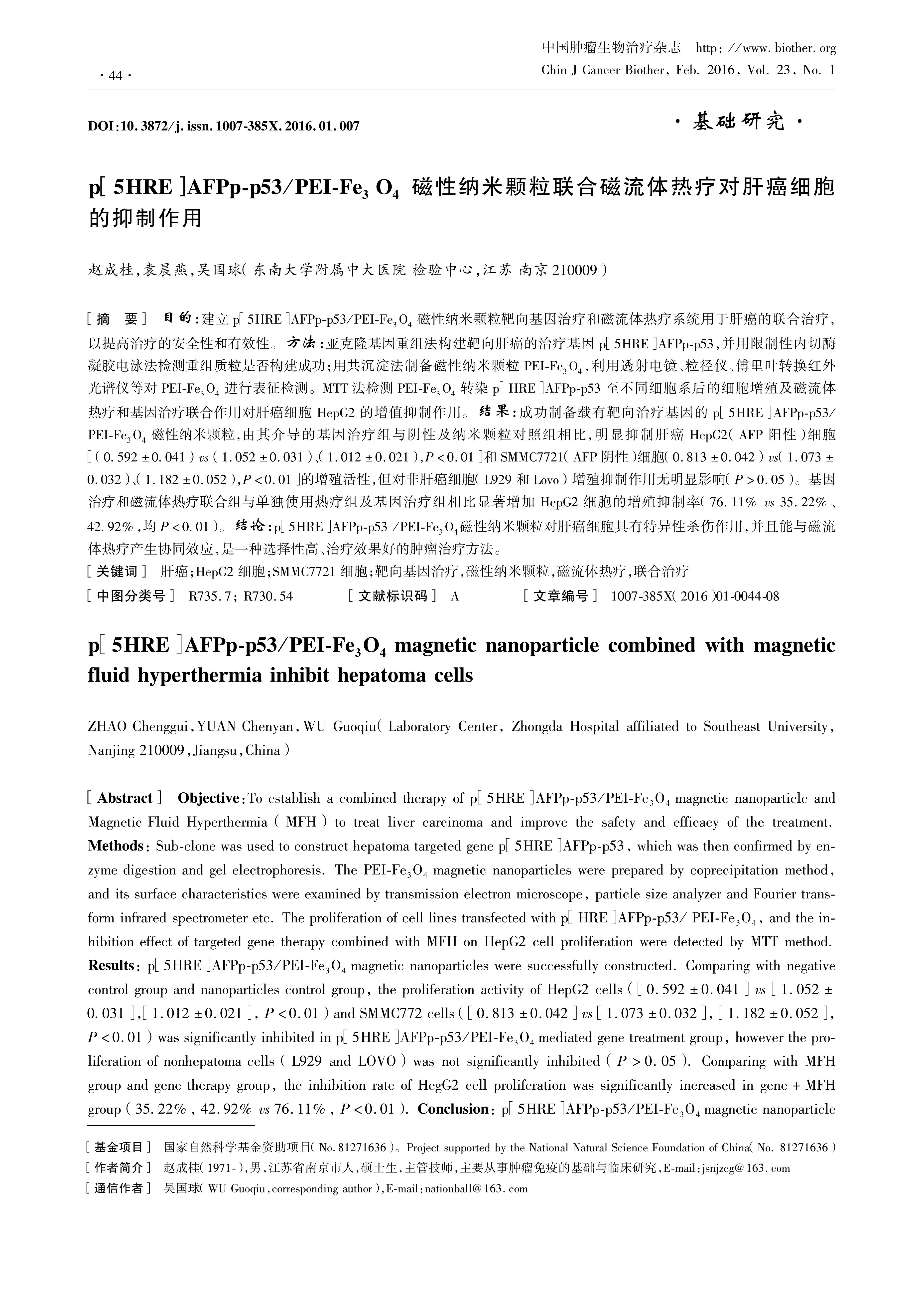 Objective:To establish a combined therapy of p[5HRE]AFPp-p53/PEI-Fe3O4 magnetic nanoparticle and Magnetic Fluid Hyperthermia (MFH) to treat liver carcinoma and improve the safety and efficacy of the treatment. Methods:Sub-clone was used to construct hepatoma targeted gene p[5HRE]AFPp-p53, which was then confirmed by enzyme digestion and gel electrophoresis. The PEI-Fe3O4 magnetic nanoparticles were prepared by coprecipitation method, and its surface characteristics were examined by transmission electron microscope, particle size analyzer and Fourier transform infrared spectrometer etc. The proliferation of cell lines transfected with p[HRE]AFPp-p53/ PEI-Fe3O4, and the inhibition effect of targeted gene therapy combined with MFH on HepG2 cell proliferation were detected by MTT method. Results: p[5HRE]AFPp-p53/PEI-Fe3O4 magnetic nanoparticles were successfully constructed. Comparing with negative control group and nanoparticles control group, the proliferation activity of HepG2 cells ([0.592±0.041] vs [1.052±0031],[1.012±0.021], P<0.01) and SMMC772 cells ([0.813±0.042] vs [1.073±0.032], [1.182±0.052], P<0.01) was significantly inhibited in p[5HRE]AFPp-p53/PEI-Fe3O4 mediated gene treatment group, however the proliferation of nonhepatoma cells (L929 and LOVO) was not significantly inhibited (P>0.05). Comparing with MFH group and gene therapy group, the inhibition rate of HegG2 cell proliferation was significantly increased in gene+MFH group (3522%, 42.92% vs 76.11%, P<0.01).Conclusion: p[5HRE]AFPp-p53/PEI-Fe3O4 magnetic nanoparticle has specific killing effect on liver carcinoma cells; it will have synergistic effect when combined with MFH; the combined therapy is an anti-tumor treatment with high selection and good therapeutic effect.