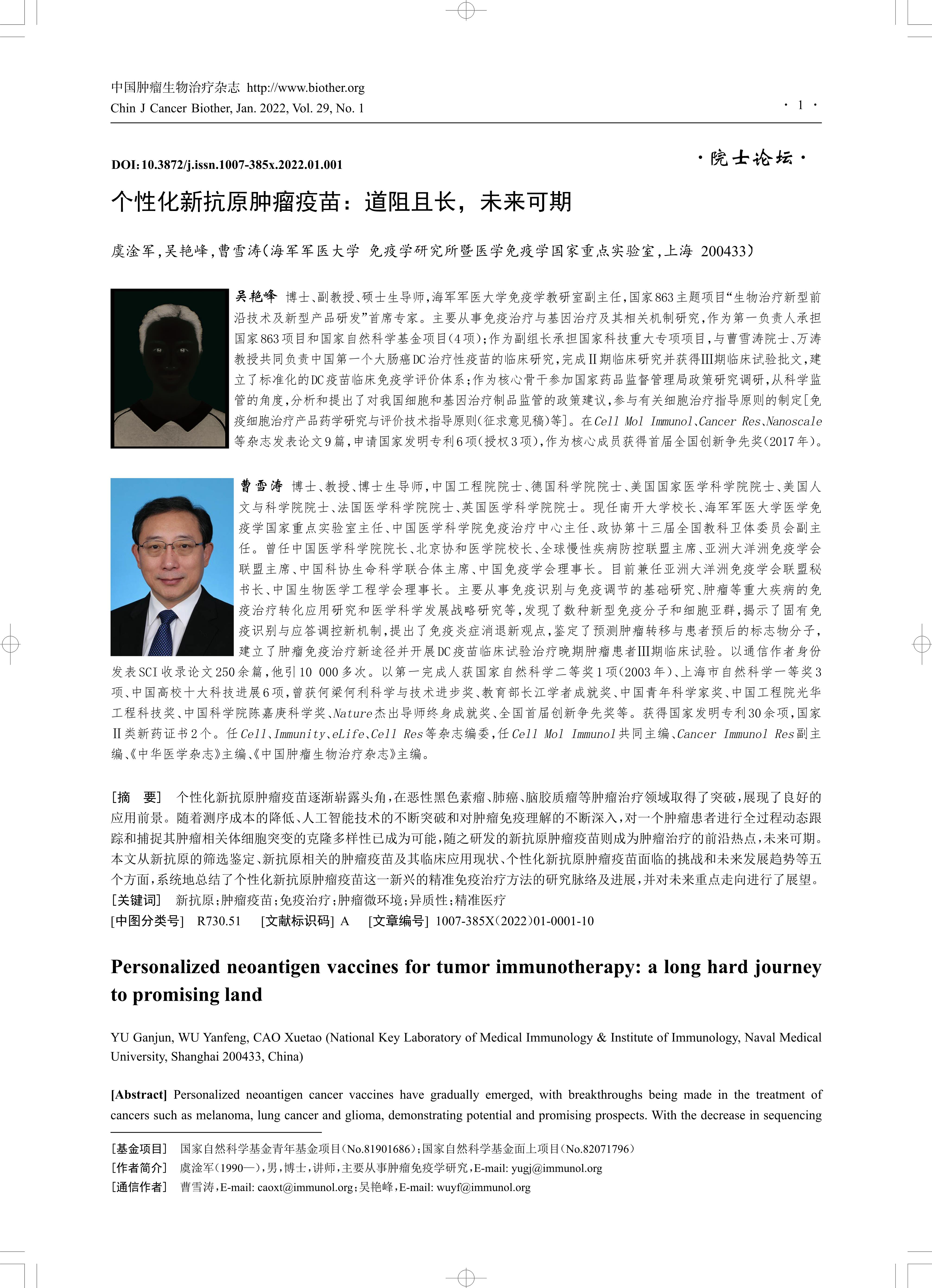 个性化新抗原肿瘤疫苗逐渐崭露头角,在恶性黑色素瘤、肺癌、脑胶质瘤等肿瘤治疗领域取得了突破,展现了良好的 应用前景。随着测序成本的降低、人工智能技术的不断突破和对肿瘤免疫理解的不断深入,对一个肿瘤患者进行全过程动态跟 踪和捕捉其肿瘤相关体细胞突变的克隆多样性已成为可能,随之研发的新抗原肿瘤疫苗则成为肿瘤治疗的前沿热点,未来可期。 本文从新抗原的筛选鉴定、新抗原相关的肿瘤疫苗及其临床应用现状、个性化新抗原肿瘤疫苗面临的挑战和未来发展趋势等五 个方面,系统地总结了个性化新抗原肿瘤疫苗这一新兴的精准免疫治疗方法的研究脉络及进展,并对未来重点走向进行了展望。