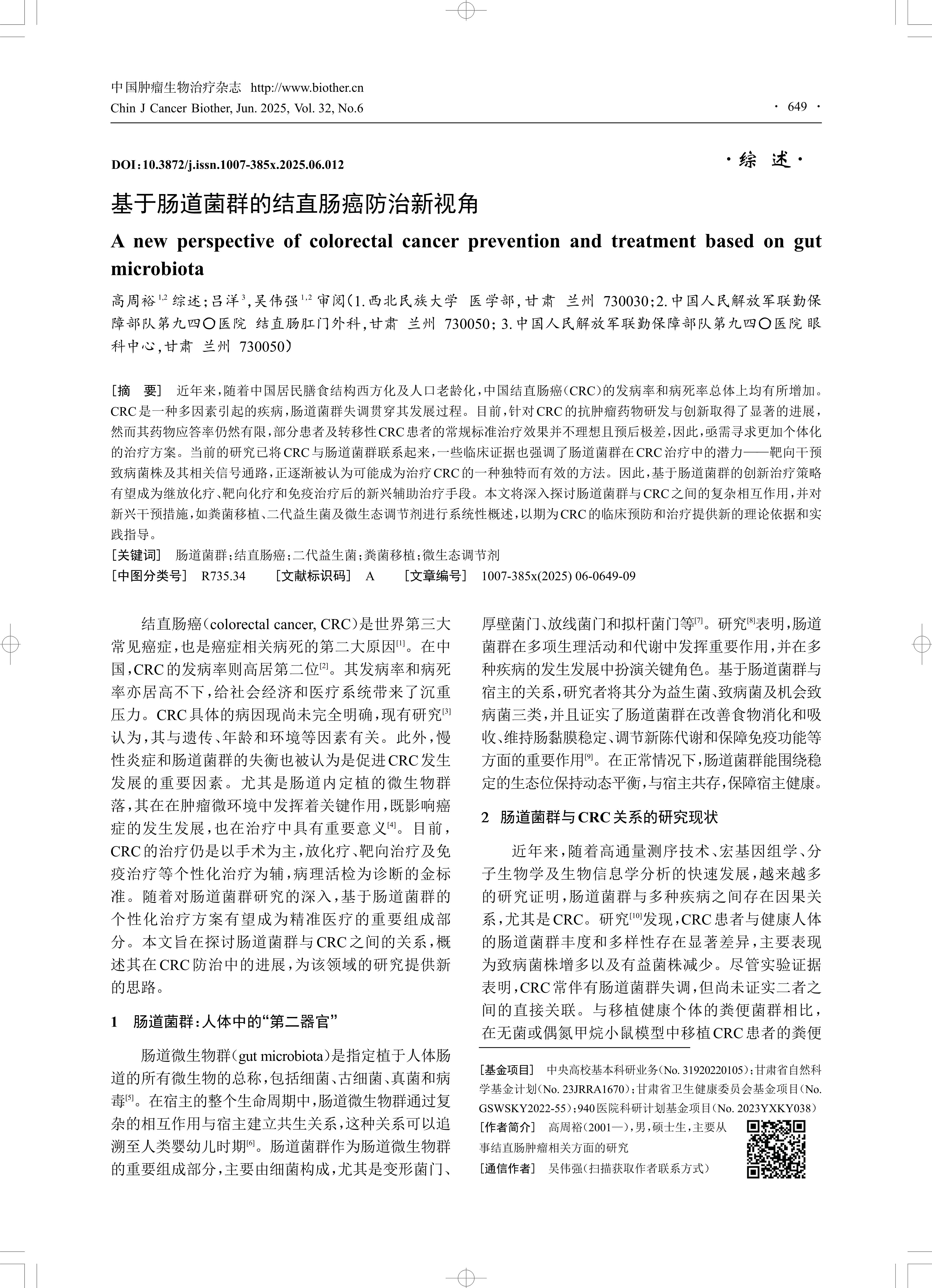 [摘 要] 近年来,随着中国居民膳食结构西方化及人口老龄化,中国结直肠癌(CRC)的发病率和病死率总体上均有所增加。 CRC是一种多因素引起的疾病,肠道菌群失调贯穿其发展过程。目前,针对CRC的抗肿瘤药物研发与创新取得了显著的进展, 然而其药物应答率仍然有限,部分患者及转移性CRC患者的常规标准治疗效果并不理想且预后极差,因此,亟需寻求更加个体化 的治疗方案。当前的研究已将CRC与肠道菌群联系起来,一些临床证据也强调了肠道菌群在CRC治疗中的潜力——靶向干预 致病菌株及其相关信号通路,正逐渐被认为可能成为治疗CRC的一种独特而有效的方法。因此,基于肠道菌群的创新治疗策略 有望成为继放化疗、靶向化疗和免疫治疗后的新兴辅助治疗手段。本文将深入探讨肠道菌群与CRC之间的复杂相互作用,并对 新兴干预措施,如粪菌移植、二代益生菌及微生态调节剂进行系统性概述,以期为CRC的临床预防和治疗提供新的理论依据和实 践指导。