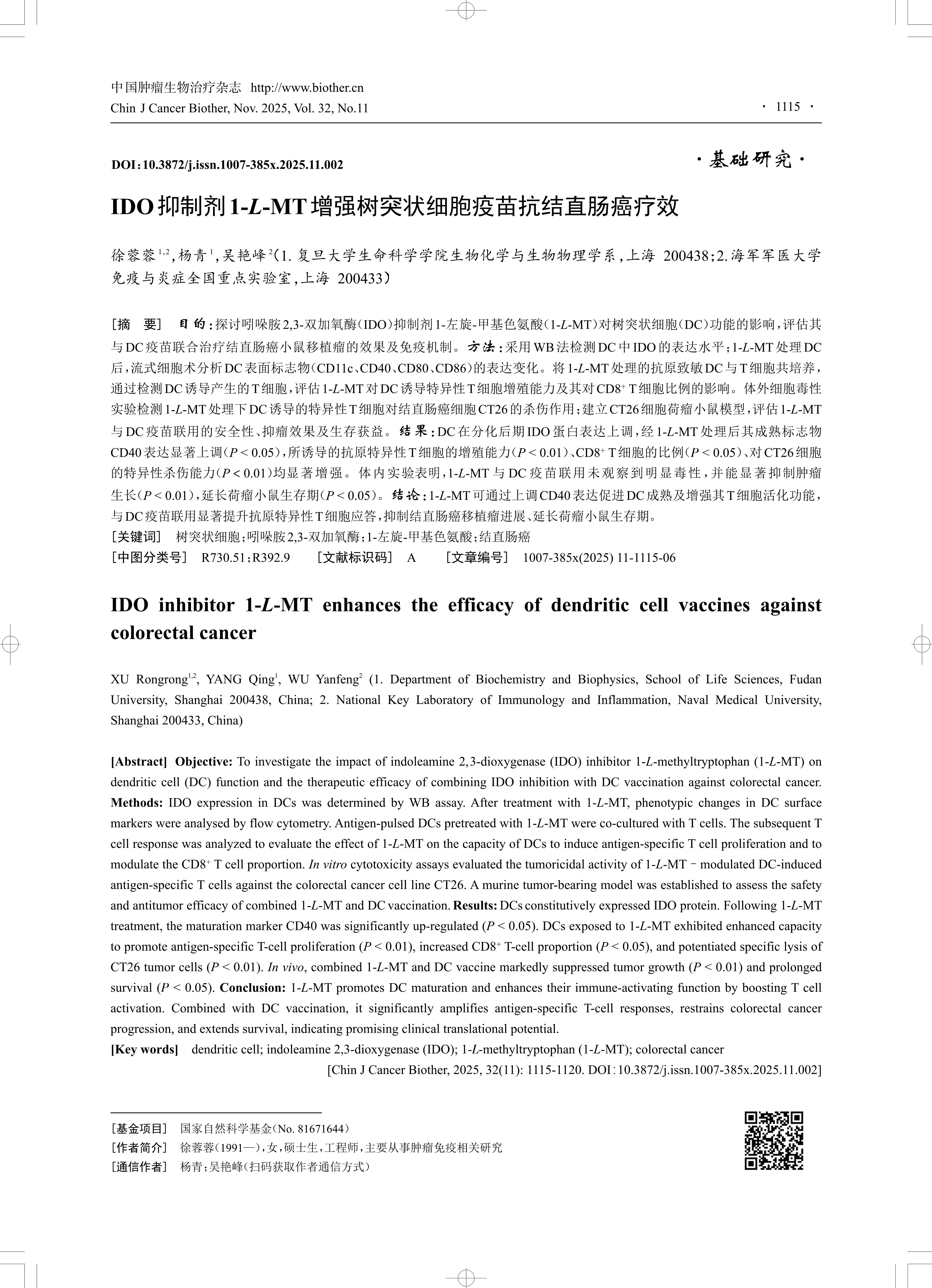 [Abstract] Objective: To investigate the impact of indoleamine 2,3-dioxygenase (IDO) inhibitor 1-L-methyltryptophan (1-L-MT) on dendritic cell (DC) function and the therapeutic efficacy of combining IDO inhibition with DC vaccination against colorectal cancer. Methods: IDO expression in DCs was determined by WB assay. After treatment with 1-L-MT, phenotypic changes in DC surface markers were analysed by flow cytometry. Antigen-pulsed DCs pretreated with 1-L-MT were co-cultured with T cells. The subsequent T cell response was analyzed to evaluate the effect of 1-L-MT on the capacity of DCs to induce antigen-specific T cell proliferation and to modulate the CD8? T cell proportion. In vitro cytotoxicity assays evaluated the tumoricidal activity of 1-L-MT–modulated DC-induced antigen-specific T cells against the colorectal cancer cell line CT26. A murine tumor-bearing model was established to assess the safety and antitumor efficacy of combined 1-L-MT and DC vaccination. Results: DCs constitutively expressed IDO protein. Following 1-L-MT treatment, the maturation marker CD40 was significantly up-regulated (P < 0.05). DCs exposed to 1-L-MT exhibited enhanced capacity to promote antigen-specific T-cell proliferation (P < 0.01), increased CD8? T-cell proportion (P < 0.05), and potentiated specific lysis of CT26 tumor cells (P < 0.01). In vivo, combined 1-L-MT and DC vaccine markedly suppressed tumor growth (P < 0.01) and prolonged survival (P < 0.05). Conclusion: 1-L-MT promotes DC maturation and enhances their immune-activating function by boosting T cell activation. Combined with DC vaccination, it significantly amplifies antigen-specific T-cell responses, restrains colorectal cancer progression, and extends survival, indicating promising clinical translational potential.