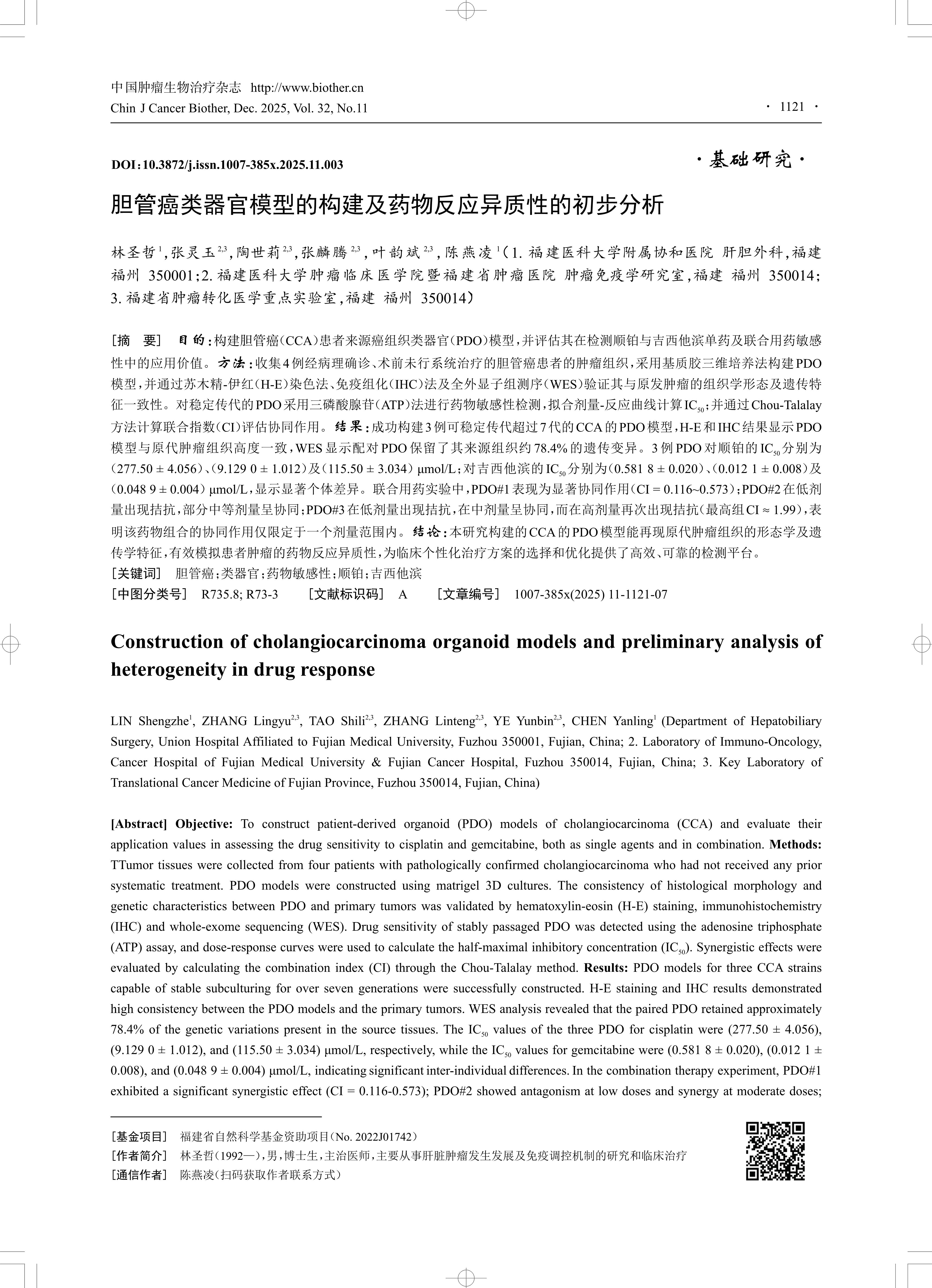 [摘 要] 目的:构建胆管癌(CCA)患者来源癌组织类器官(PDO)模型,并评估其在检测顺铂与吉西他滨单药及联合用药敏感 性中的应用价值。方法:收集4例经病理确诊、术前未行系统治疗的胆管癌患者的肿瘤组织,采用基质胶三维培养法构建PDO 模型,并通过苏木精-伊红(H-E)染色法、免疫组化(IHC)法及全外显子组测序(WES)验证其与原发肿瘤的组织学形态及遗传特 征一致性。对稳定传代的PDO采用三磷酸腺苷(ATP)法进行药物敏感性检测,拟合剂量-反应曲线计算IC50 ;并通过Chou-Talalay 方法计算联合指数(CI)评估协同作用。结果:成功构建3例可稳定传代超过7代的CCA的PDO模型,H-E和IHC结果显示PDO 模型与原代肿瘤组织高度一致,WES显示配对PDO保留了其来源组织约78.4%的遗传变异。3例PDO对顺铂的IC50 分别为 (277.50 ± 4.056)、 (9.129 0 ± 1.012)及(115.50 ± 3.034) μmol/L;对吉西他滨的IC50 分别为(0.581 8 ± 0.020)、 (0.012 1 ± 0.008)及 (0.048 9 ± 0.004) μmol/L,显示显著个体差异。联合用药实验中,PDO#1表现为显著协同作用(CI = 0.116~0.573);PDO#2在低剂 量出现拮抗,部分中等剂量呈协同;PDO#3在低剂量出现拮抗,在中剂量呈协同,而在高剂量再次出现拮抗(最高组CI ≈ 1.99),表 明该药物组合的协同作用仅限定于一个剂量范围内。结论:本研究构建的CCA的PDO模型能再现原代肿瘤组织的形态学及遗 传学特征,有效模拟患者肿瘤的药物反应异质性,为临床个性化治疗方案的选择和优化提供了高效、可靠的检测平台。