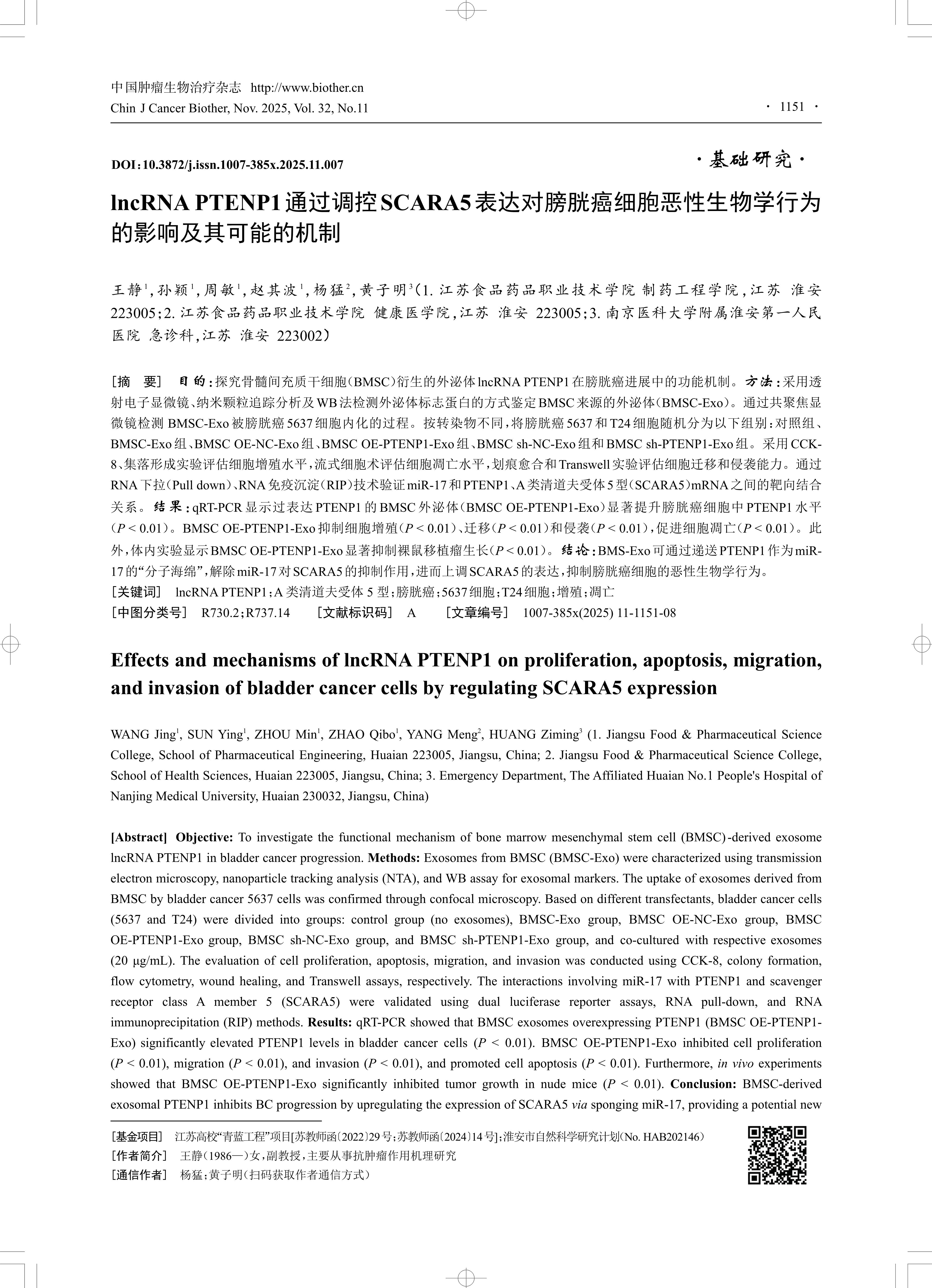 [Abstract] Objective: To investigate the functional mechanism of bone marrow mesenchymal stem cell (BMSC)-derived exosome lncRNA PTENP1 in bladder cancer progression. Methods: Exosomes from BMSC (BMSC-Exo) were characterized using transmission electron microscopy, nanoparticle tracking analysis (NTA), and WB assay for exosomal markers. The uptake of exosomes derived from BMSC by bladder cancer 5637 cells was confirmed through confocal microscopy. Based on different transfectants, bladder cancer cells (5637 and T24) were divided into groups: control group (no exosomes), BMSC-Exo group, BMSC OE-NC-Exo group, BMSC OE-PTENP1-Exo group, BMSC sh-NC-Exo group, and BMSC sh-PTENP1-Exo group, and co-cultured with respective exosomes (20 μg/mL). The evaluation of cell proliferation, apoptosis, migration, and invasion was conducted using CCK-8, colony formation, flow cytometry, wound healing, and Transwell assays, respectively. The interactions involving miR-17 with PTENP1 and scavenger receptor class A member 5 (SCARA5) were validated using dual luciferase reporter assays, RNA pull-down, and RNA immunoprecipitation (RIP) methods. Results: qRT-PCR showed that BMSC exosomes overexpressing PTENP1 (BMSC OE-PTENP1 Exo) significantly elevated PTENP1 levels in bladder cancer cells (P < 0.01). BMSC OE-PTENP1-Exo inhibited cell proliferation (P < 0.01), migration (P < 0.01), and invasion (P < 0.01), and promoted cell apoptosis (P < 0.01). Furthermore, in vivo experiments showed that BMSC OE-PTENP1-Exo significantly inhibited tumor growth in nude mice (P < 0.01). Conclusion: BMSC-derived exosomal PTENP1 inhibits BC progression by upregulating the expression of SCARA5 via sponging miR-17, providing a potential new therapeutic target for bladder cancer bladder cancer treatment.