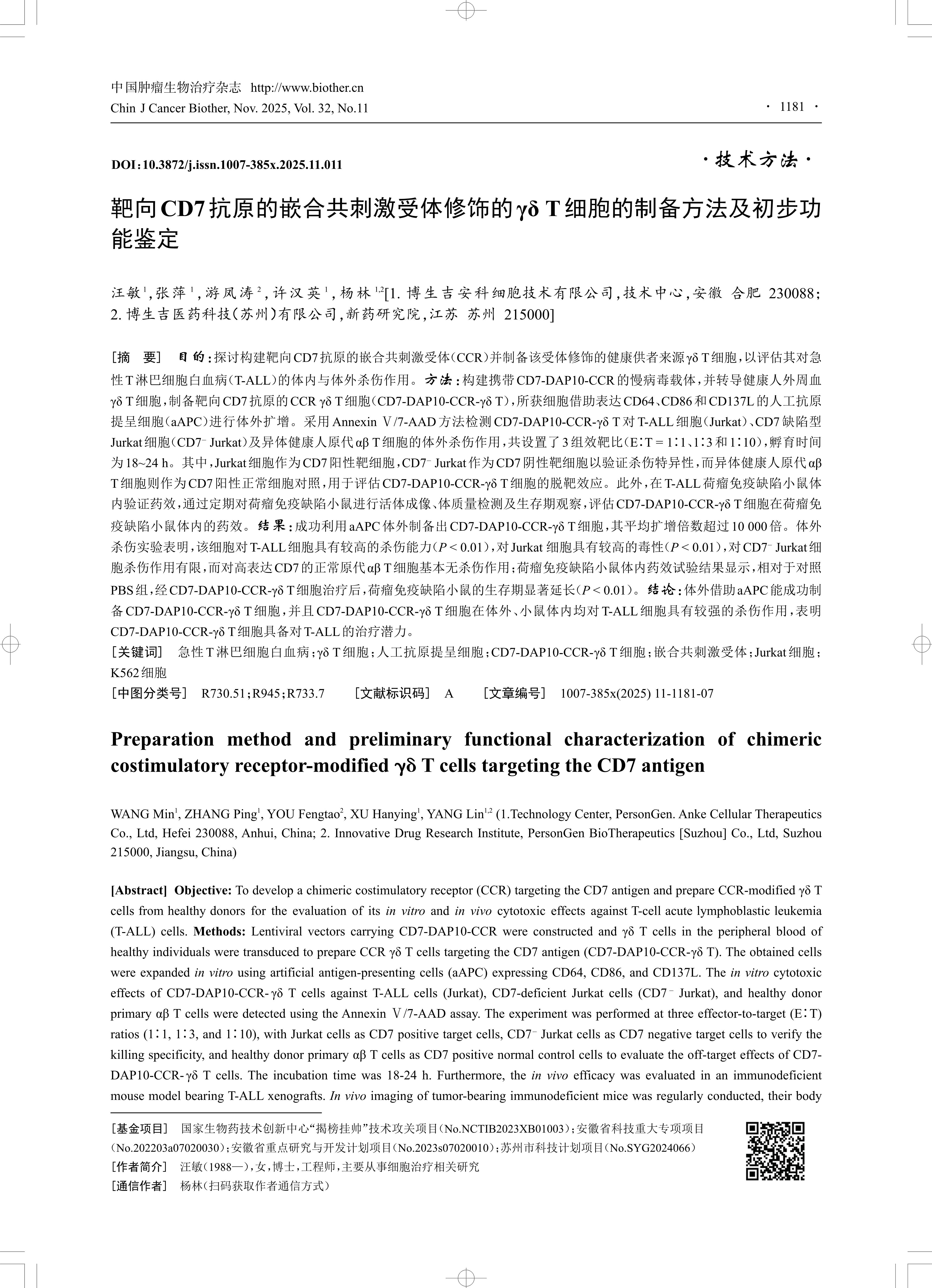 [摘 要] 目的:探讨构建靶向CD7抗原的嵌合共刺激受体(CCR)并制备该受体修饰的健康供者来源γδ T细胞,以评估其对急 性T淋巴细胞白血病(T-ALL)的体内与体外杀伤作用。方法:构建携带CD7-DAP10-CCR的慢病毒载体,并转导健康人外周血 γδ T细胞,制备靶向CD7抗原的CCR γδ T细胞(CD7-DAP10-CCR-γδ T),所获细胞借助表达CD64、CD86和CD137L的人工抗原 提呈细胞(aAPC)进行体外扩增。采用Annexin Ⅴ/7-AAD方法检测CD7-DAP10-CCR-γδ T对T-ALL细胞(Jurkat)、CD7缺陷型 Jurkat细胞(CD7? Jurkat)及异体健康人原代αβ T细胞的体外杀伤作用,共设置了3组效靶比(E∶T = 1∶1、1∶3和1∶10),孵育时间 为18~24 h。其中,Jurkat细胞作为CD7阳性靶细胞,CD7? Jurkat作为CD7阴性靶细胞以验证杀伤特异性,而异体健康人原代αβ T细胞则作为CD7阳性正常细胞对照,用于评估CD7-DAP10-CCR-γδ T细胞的脱靶效应。此外,在T-ALL荷瘤免疫缺陷小鼠体 内验证药效,通过定期对荷瘤免疫缺陷小鼠进行活体成像、体质量检测及生存期观察,评估CD7-DAP10-CCR-γδ T细胞在荷瘤免 疫缺陷小鼠体内的药效。结果:成功利用aAPC体外制备出CD7-DAP10-CCR-γδ T细胞,其平均扩增倍数超过10 000倍。体外 杀伤实验表明,该细胞对T-ALL细胞具有较高的杀伤能力(P < 0.01),对Jurkat 细胞具有较高的毒性(P < 0.01),对CD7? Jurkat细 胞杀伤作用有限,而对高表达CD7的正常原代αβ T细胞基本无杀伤作用;荷瘤免疫缺陷小鼠体内药效试验结果显示,相对于对照 PBS组,经CD7-DAP10-CCR-γδ T细胞治疗后,荷瘤免疫缺陷小鼠的生存期显著延长(P < 0.01)。结论:体外借助aAPC能成功制 备CD7-DAP10-CCR-γδ T细胞,并且CD7-DAP10-CCR-γδ T细胞在体外、小鼠体内均对T-ALL细胞具有较强的杀伤作用,表明 CD7-DAP10-CCR-γδ T细胞具备对T-ALL的治疗潜力。