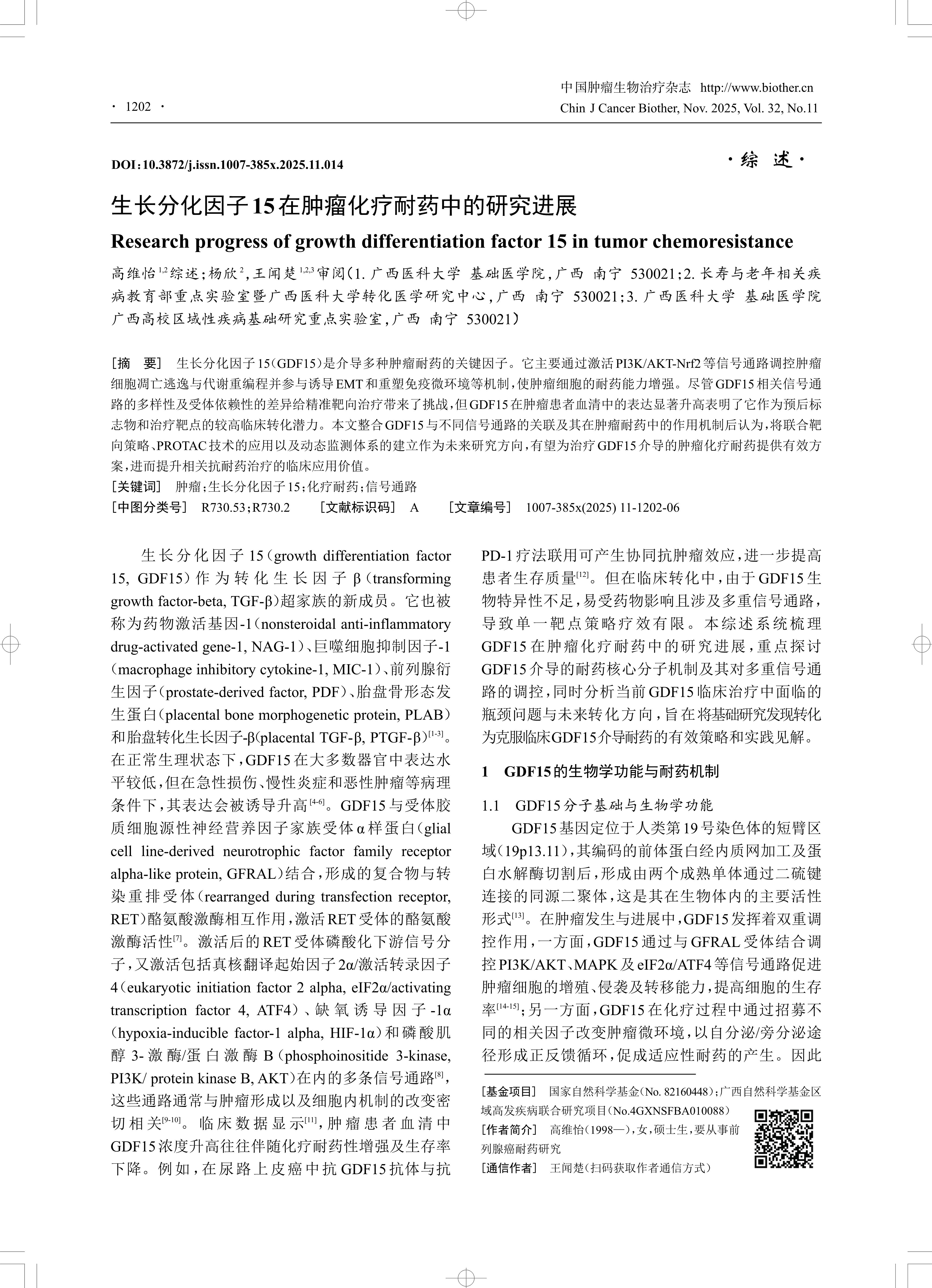 [摘 要] 生长分化因子15(GDF15)是介导多种肿瘤耐药的关键因子。它主要通过激活PI3K/AKT-Nrf2等信号通路调控肿瘤 细胞凋亡逃逸与代谢重编程并参与诱导EMT和重塑免疫微环境等机制,使肿瘤细胞的耐药能力增强。尽管GDF15相关信号通 路的多样性及受体依赖性的差异给精准靶向治疗带来了挑战,但GDF15在肿瘤患者血清中的表达显著升高表明了它作为预后标 志物和治疗靶点的较高临床转化潜力。本文整合GDF15与不同信号通路的关联及其在肿瘤耐药中的作用机制后认为,将联合靶 向策略、PROTAC技术的应用以及动态监测体系的建立作为未来研究方向,有望为治疗GDF15介导的肿瘤化疗耐药提供有效方 案,进而提升相关抗耐药治疗的临床应用价值。