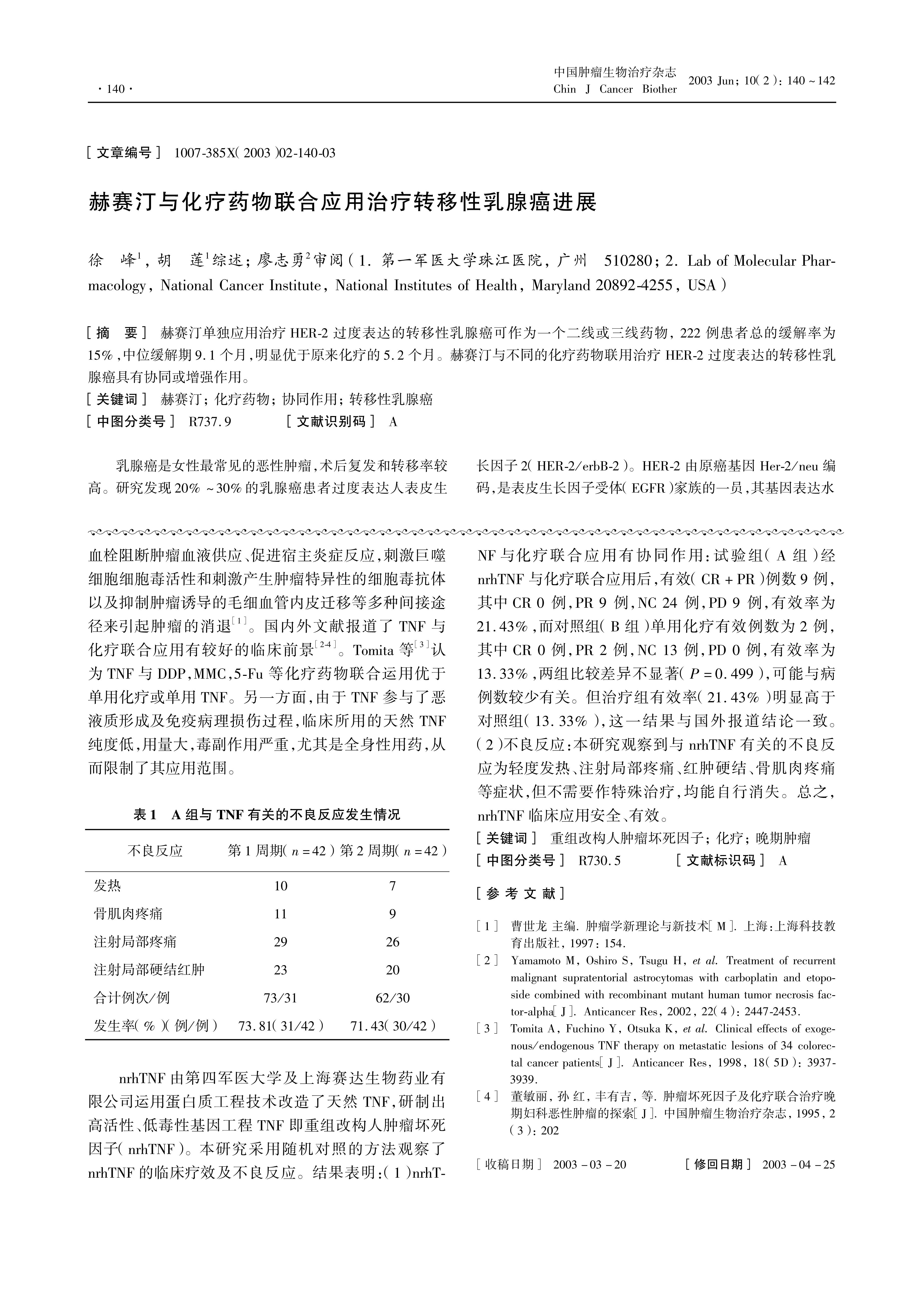 徐 峰,胡 莲,廖志勇, et al. 赫赛汀与化疗药物联合应用治疗转移性乳腺癌进展[J].中国肿瘤生物治疗杂志, 2003, 10(2): 140-142. DOI:10.3872/j. issn.1007-385X.2003.2.017.