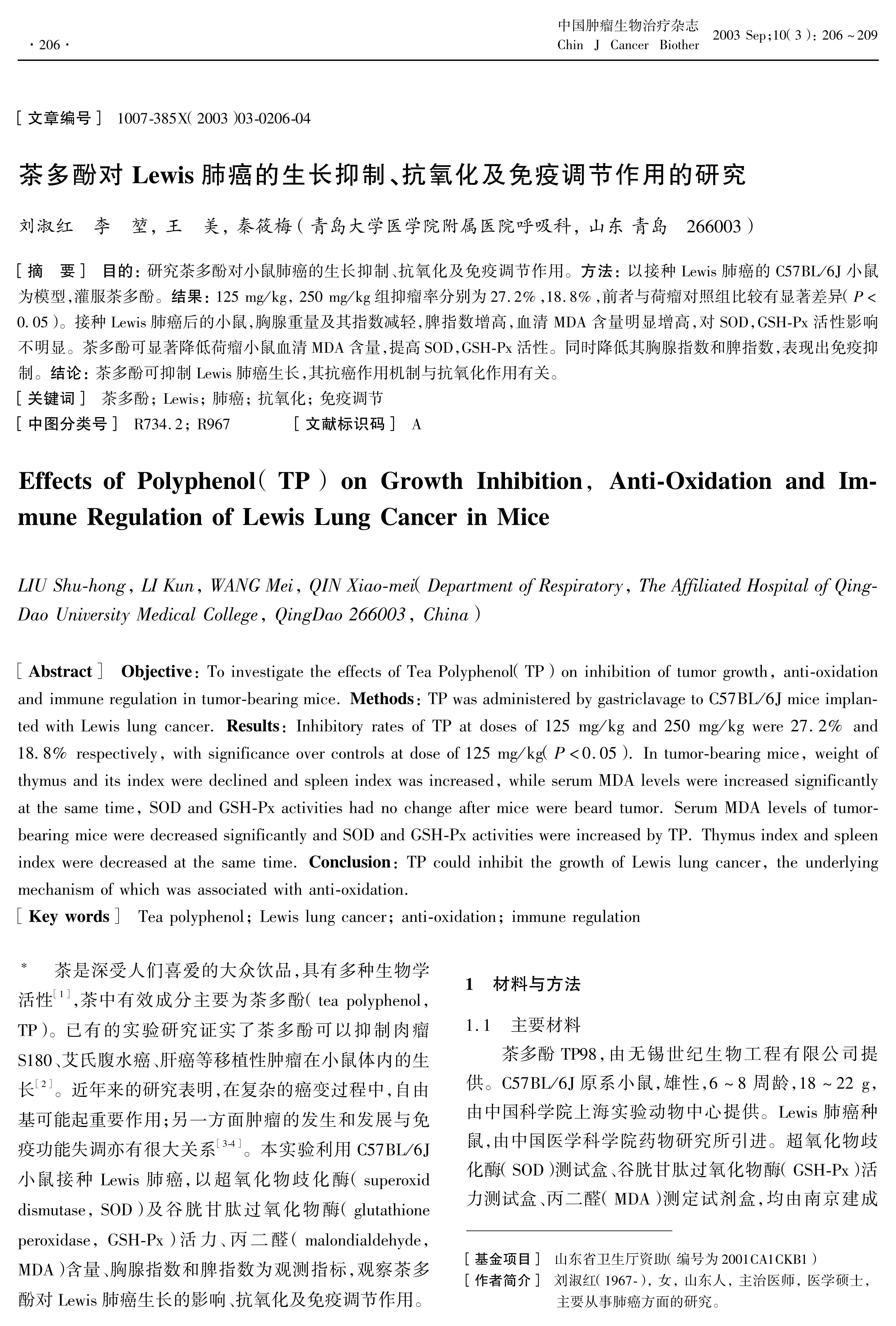 目的:研究茶多酚对小鼠肺癌的生长抑制、抗氧化及免疫调节作用。方法:以接种Lewis肺癌的C57BL/6J小鼠为模型,灌服茶多酚。结果:125 mg/kg, 250 mg/kg组抑瘤率分别为27.2%,18.8%,前者与荷瘤对照组比较有显著差异(P<005)。接种Lewis肺癌后的小鼠,胸腺重量及其指数减轻,脾指数增高,血清MDA含量明显增高,对SOD,GSH-Px活性影响不明显。茶多酚可显著降低荷瘤小鼠血清MDA含量,提高SOD,GSH-Px活性。同时降低其胸腺指数和脾指数,表现出免疫抑制。结论:茶多酚可抑制Lewis肺癌生长,其抗癌作用机制与抗氧化作用有关。