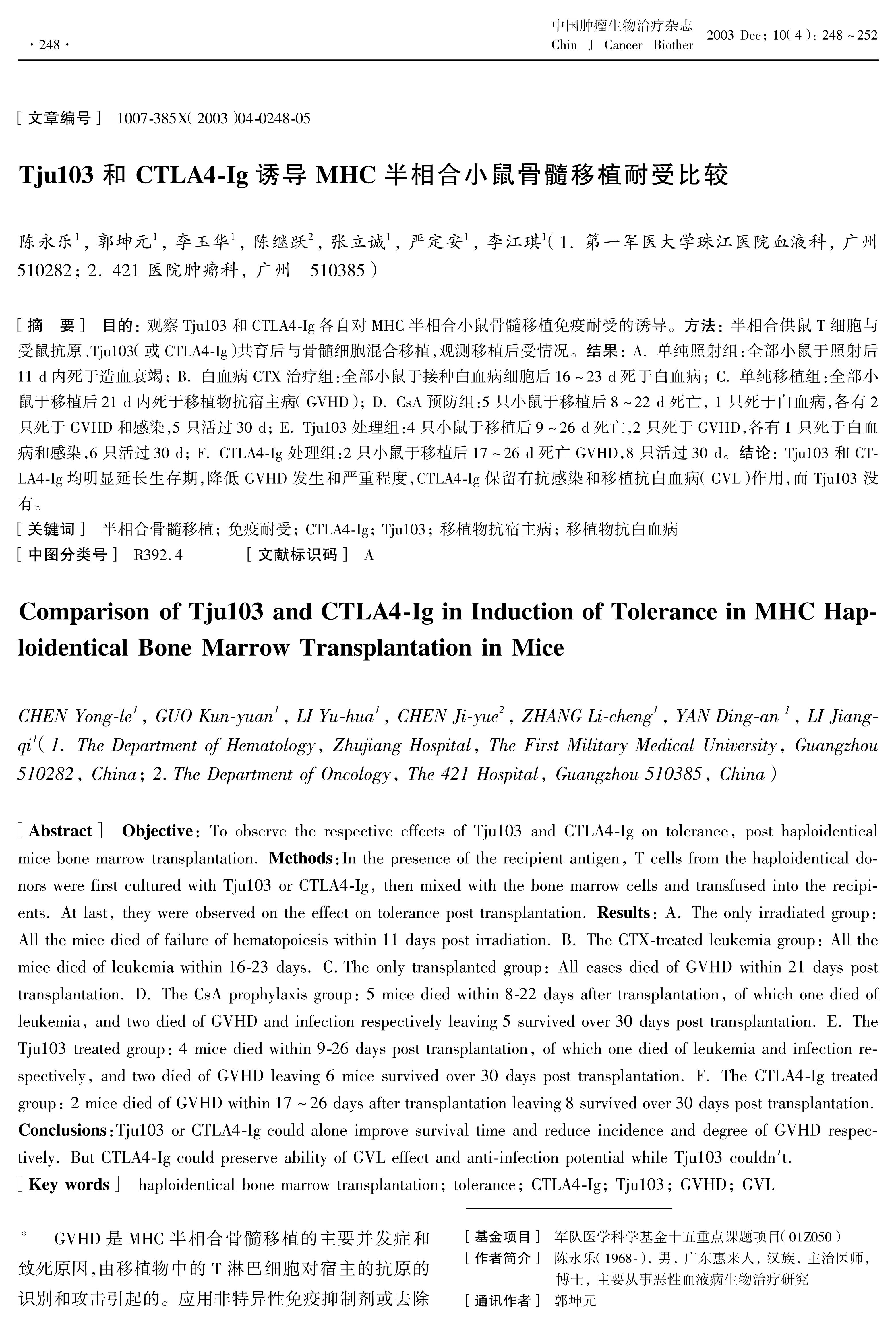 Objective:To observe the respective effects of Tju103 and CTLA4-Ig on tolerance, post haploidentical mice bone marrow transplantation. Methods:In the presence of the recipient antigen, T cells from the haploidentical donors were first cultured with Tju103 or CTLA4-Ig, then mixed with the bone marrow cells and transfused into the recipients. At last, they were observed on the effect on tolerance post transplantation. Results: A. The only irradiated group: All the mice died of failure of hematopoiesis within 11 days post irradiation. B. The CTX-treated leukemia group: All the mice died of leukemia within 16-23 days. C.The only transplanted group: All cases died of GVHD within 21 days post transplantation. D. The CsA prophylaxis group: 5 mice died within 8-22 days after transplantation, of which one died of leukemia, and two died of GVHD and infection respectively leaving 5 survived over 30 days post transplantation. E. The Tju103 treated group: 4 mice died within 9-26 days post transplantation, of which one died of leukemia and infection respectively, and two died of GVHD leaving 6 mice survived over 30 days post transplantation. F. The CTLA4-Ig treated group: 2 mice died of GVHD within 17~26 days after transplantation leaving 8 survived over 30 days post transplantation. Conclusions:Tju103 or CTLA4-Ig could alone improve survival time and reduce incidence and degree of GVHD respectively. But CTLA4-Ig could preserve ability of GVL effect and anti-infection potential while Tju103 couldn′t.