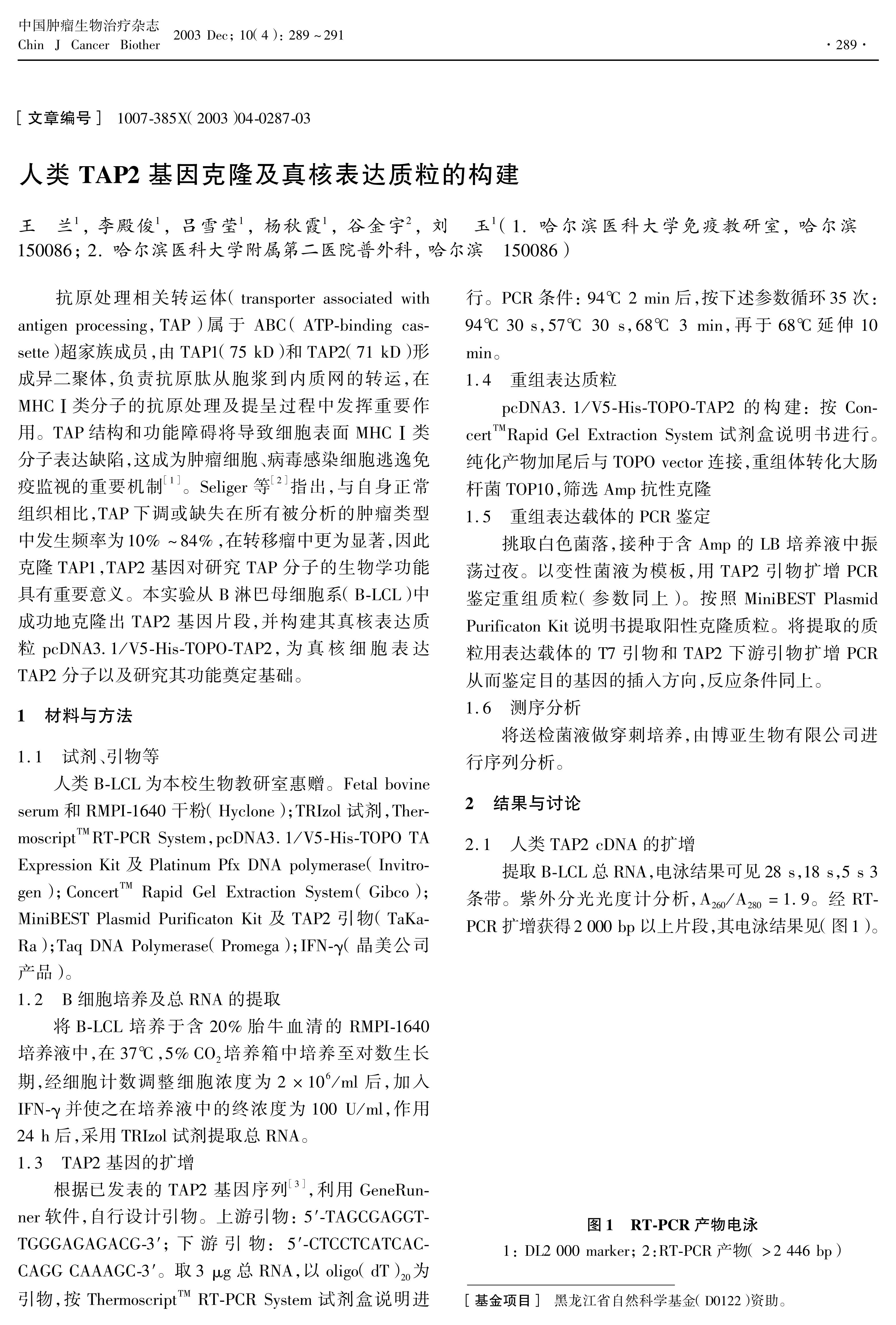 王 兰,李殿俊,吕雪莹,等, et al. 人类TAP2基因克隆及真核表达质粒的构建[J].中国肿瘤生物治疗杂志, 2003, 10(4): 289-291. DOI:10.3872/j. issn.1007-385X.2003.4.014.
