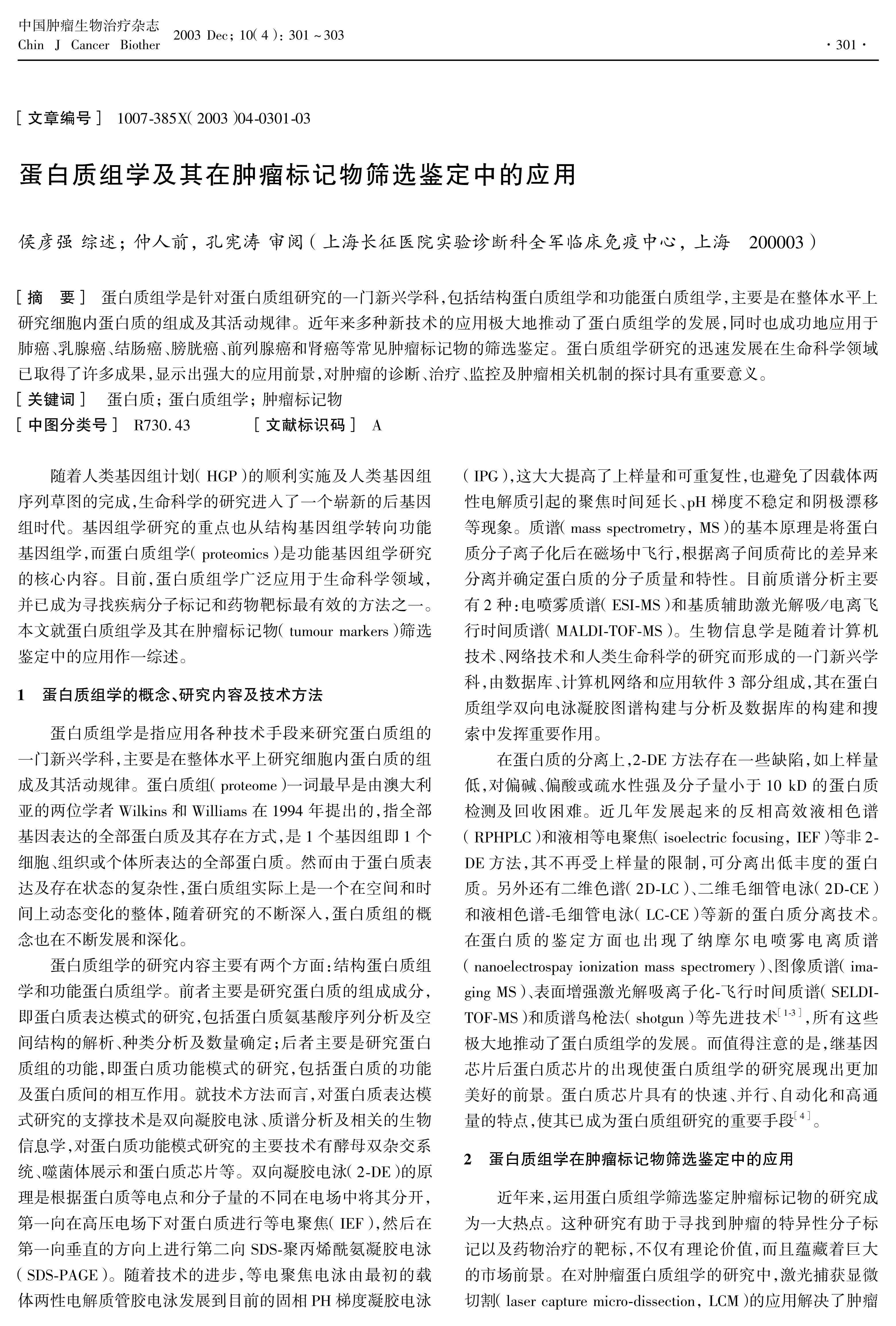 蛋白质组学是针对蛋白质组研究的一门新兴学科,包括结构蛋白质组学和功能蛋白质组学,主要是在整体水平上研究细胞内蛋白质的组成及其活动规律。近年来多种新技术的应用极大地推动了蛋白质组学的发展,同时也成功地应用于肺癌、乳腺癌、结肠癌、膀胱癌、前列腺癌和肾癌等常见肿瘤标记物的筛选鉴定。蛋白质组学研究的迅速发展在生命科学领域已取得了许多成果,显示出强大的应用前景,对肿瘤的诊断、治疗、监控及肿瘤相关机制的探讨具有重要意义。