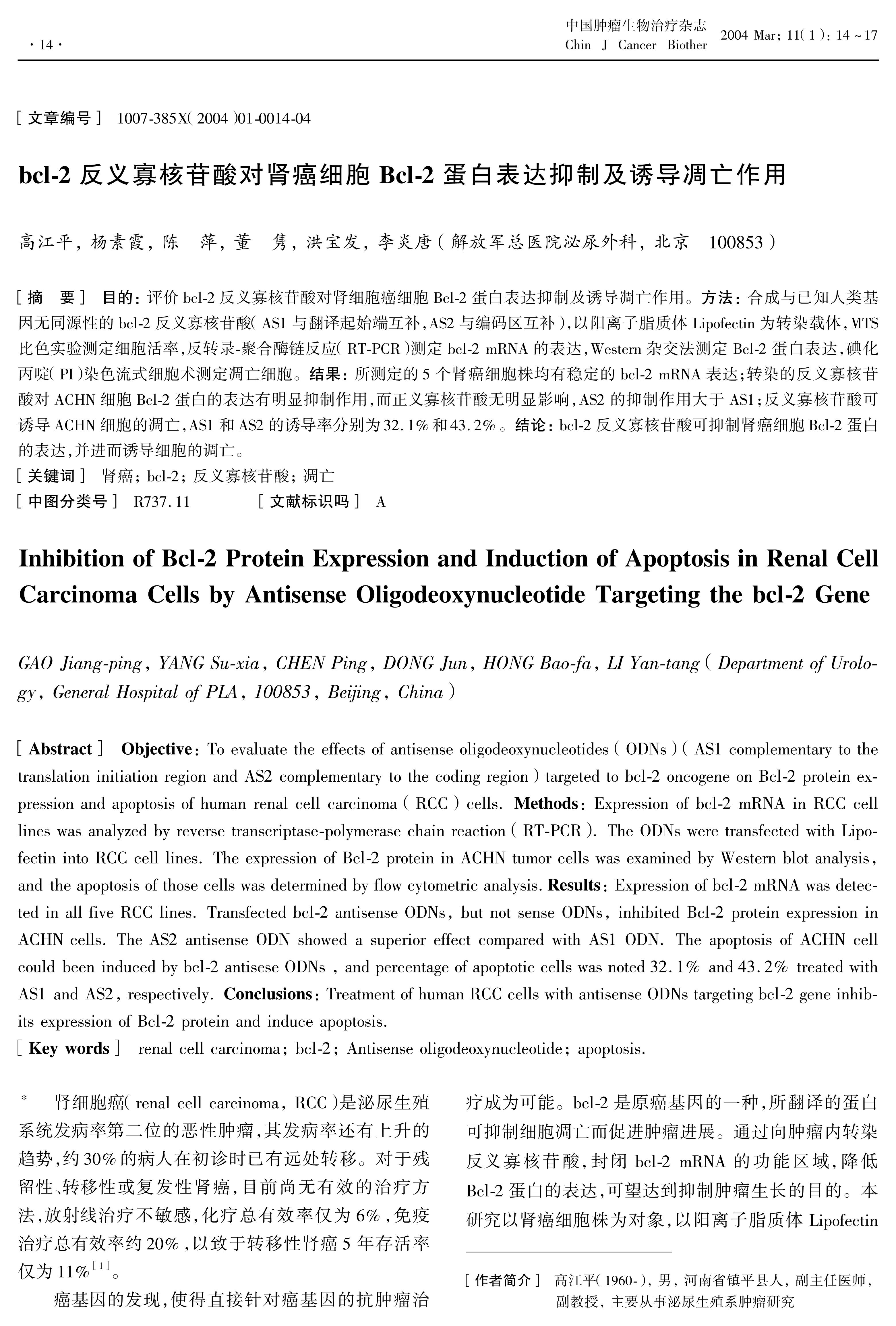 Objective:To evaluate the effects of antisense oligodeoxynucleotides (ODNs) (AS1 complementary to the translation initiation region and AS2 complementary to the coding region) targeted to bcl-2 oncogene on Bcl-2 protein expression and apoptosis of human renal cell carcinoma (RCC) cells.Methods:Expression of bcl-2 mRNA in RCC cell lines was analyzed by reverse transcriptase-polymerase chain reaction (RT-PCR). The ODNs were transfected with Lipofectin into RCC cell lines. The expression of Bcl-2 protein in ACHN tumor cells was examined by Western blot analysis, and the apoptosis of those cells was determined by flow cytometric analysis.Results: Expression of bcl-2 mRNA was detected in all five RCC lines. Transfected bcl-2 antisense ODNs, but not sense ODNs, inhibited Bcl-2 protein expression in ACHN cells. The AS2 antisense ODN showed a superior effect compared with AS1 ODN. The apoptosis of ACHN cell could been induced by bcl-2 antisese ODNs , and percentage of apoptotic cells was noted 32.1% and 43.2% treated with AS1 and AS2, respectively. Conclusions:Treatment of human RCC cells with antisense ODNs targeting bcl-2 gene inhibits expression of Bcl-2 protein and induce apoptosis.