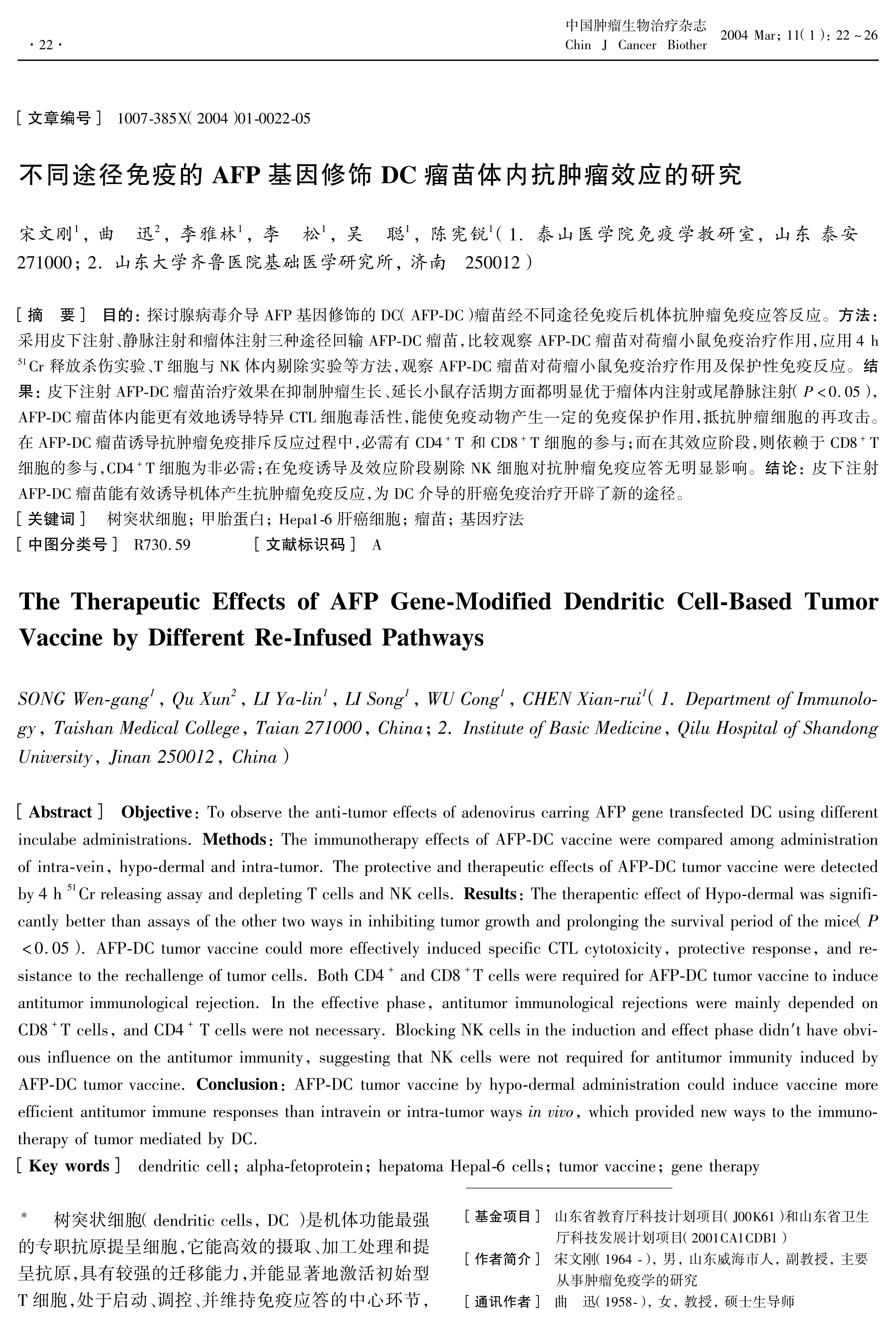 bjective:To observe the anti-tumor effects of adenovirus carring AFP gene transfected DC using different inculabe administrations.Methods:The immunotherapy effects of AFP-DC vaccine were compared among administration of intra-vein, hypo-dermal and intra-tumor. The protective and therapeutic effects of AFP-DC tumor vaccine were detected by 4 h 51 Cr releasing assay and depleting T cells and NK cells. Results: The therapentic effect of Hypo-dermal was significantly better than assays of the other two ways in inhibiting tumor growth and prolonging the survival period of the mice(P<0.05). AFP-DC tumor vaccine could more effectively induced specific CTL cytotoxicity, protective response, and resistance to the rechallenge of tumor cells. Both CD4+ and CD8+T cells were required for AFP-DC tumor vaccine to induce antitumor immunological rejection. In the effective phase, antitumor immunological rejections were mainly depended on CD8+T cells, and CD4+ T cells were not necessary. Blocking NK cells in the induction and effect phase didn′t have obvious influence on the antitumor immunity, suggesting that NK cells were not required for antitumor immunity induced by AFP-DC tumor vaccine. Conclusion: AFP-DC tumor vaccine by hypo-dermal administration could induce vaccine more efficient antitumor immune responses than intravein or intra-tumor ways in vivo, which provided new ways to the immunotherapy of tumor mediated by DC.
