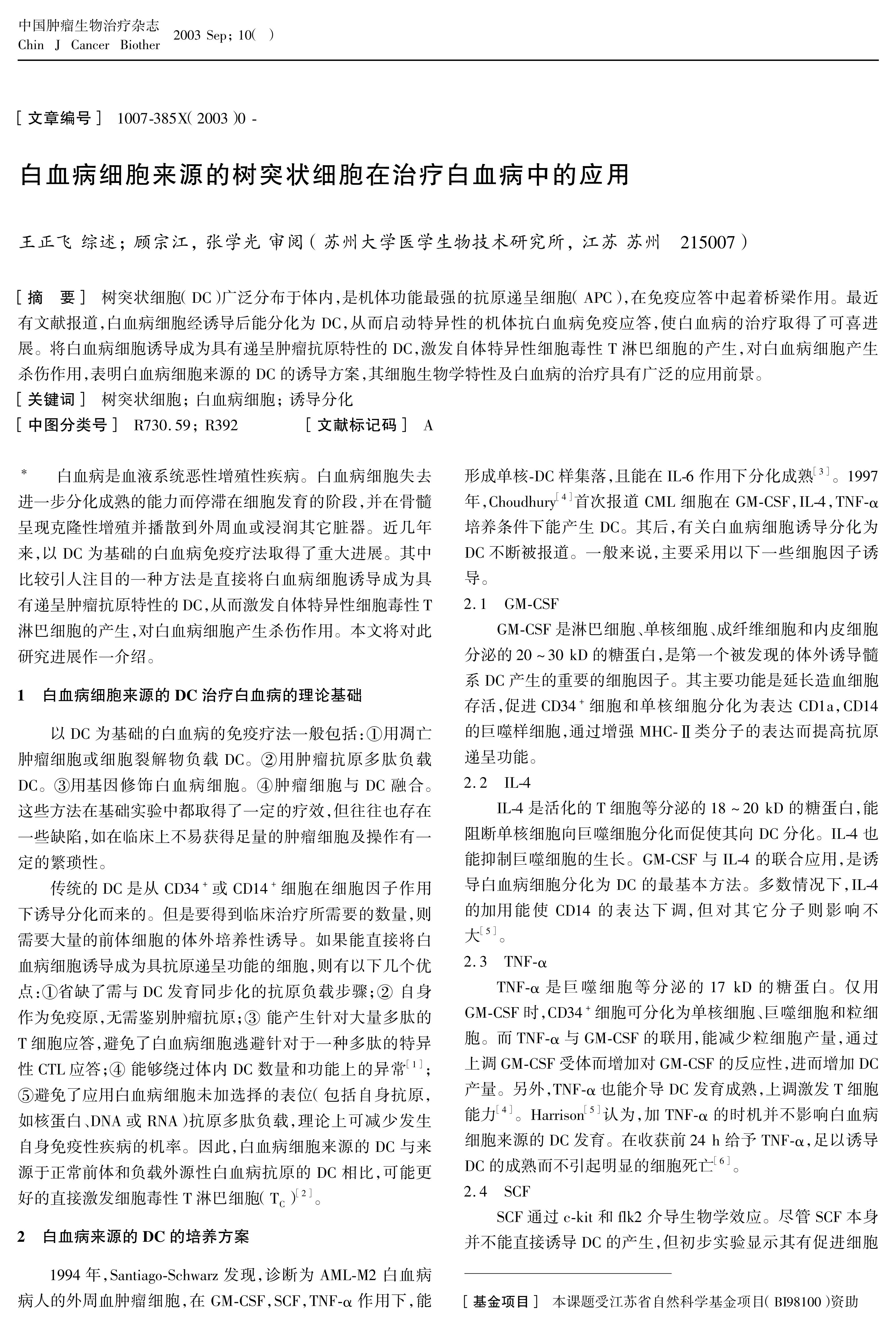 树突状细胞(DC)广泛分布于体内,是机体功能最强的抗原递呈细胞(APC),在免疫应答中起着桥梁作用。最近有文献报道,白血病细胞经诱导后能分化为DC,从而启动特异性的机体抗白血病免疫应答,使白血病的治疗取得了可喜进展。将白血病细胞诱导成为具有递呈肿瘤抗原特性的DC,激发自体特异性细胞毒性T淋巴细胞的产生,对白血病细胞产生杀伤作用,表明白血病细胞来源的DC的诱导方案,其细胞生物学特性及白血病的治疗具有广泛的应用前景。