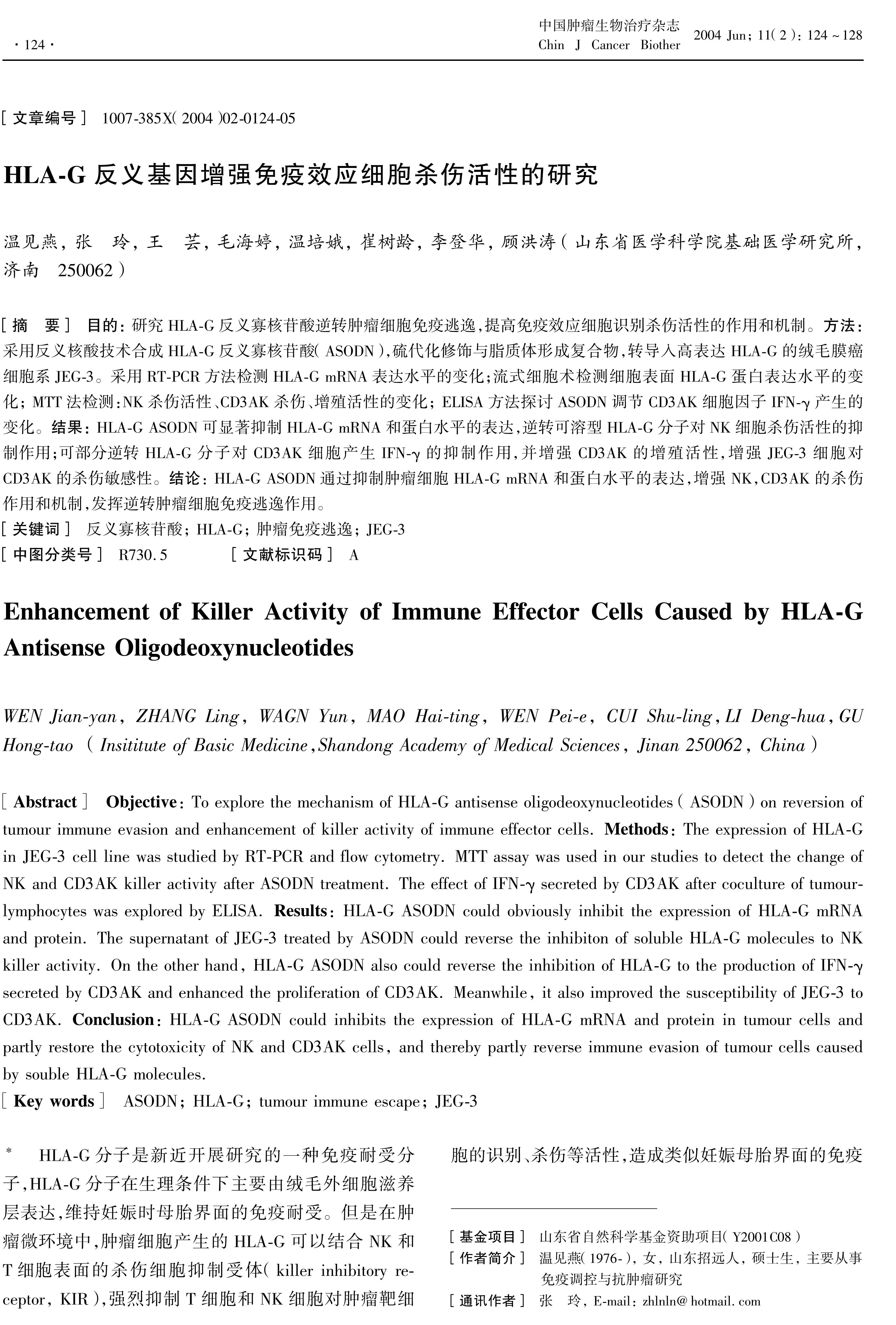 Objective: To explore the mechanism of HLA-G antisense oligodeoxynucleotides (ASODN) on reversion of tumour immune evasion and enhancement of killer activity of immune effector cells. Methods: The expression of HLA-G in JEG-3 cell line was studied by RT-PCR and flow cytometry. MTT assay was used in our studies to detect the change of NK and CD3AK killer activity after ASODN treatment. The effect of IFN-γ secreted by CD3AK after coculture of tumour-lymphocytes was explored by ELISA.Results: HLA-G ASODN could obviously inhibit the expression of HLA-G mRNA and protein. The supernatant of JEG-3 treated by ASODN could reverse the inhibiton of soluble HLA-G molecules to NK killer activity. On the other hand, HLA-G ASODN also could reverse the inhibition of HLA-G to the production of IFN-γ secreted by CD3AK and enhanced the proliferation of CD3AK. Meanwhile, it also improved the susceptibility of JEG-3 to CD3AK.Conclusion:HLA-G ASODN could inhibits the expression of HLA-G mRNA and protein in tumour cells and partly restore the cytotoxicity of NK and CD3AK cells, and thereby partly reverse immune evasion of tumour cells caused by souble HLA-G molecules.