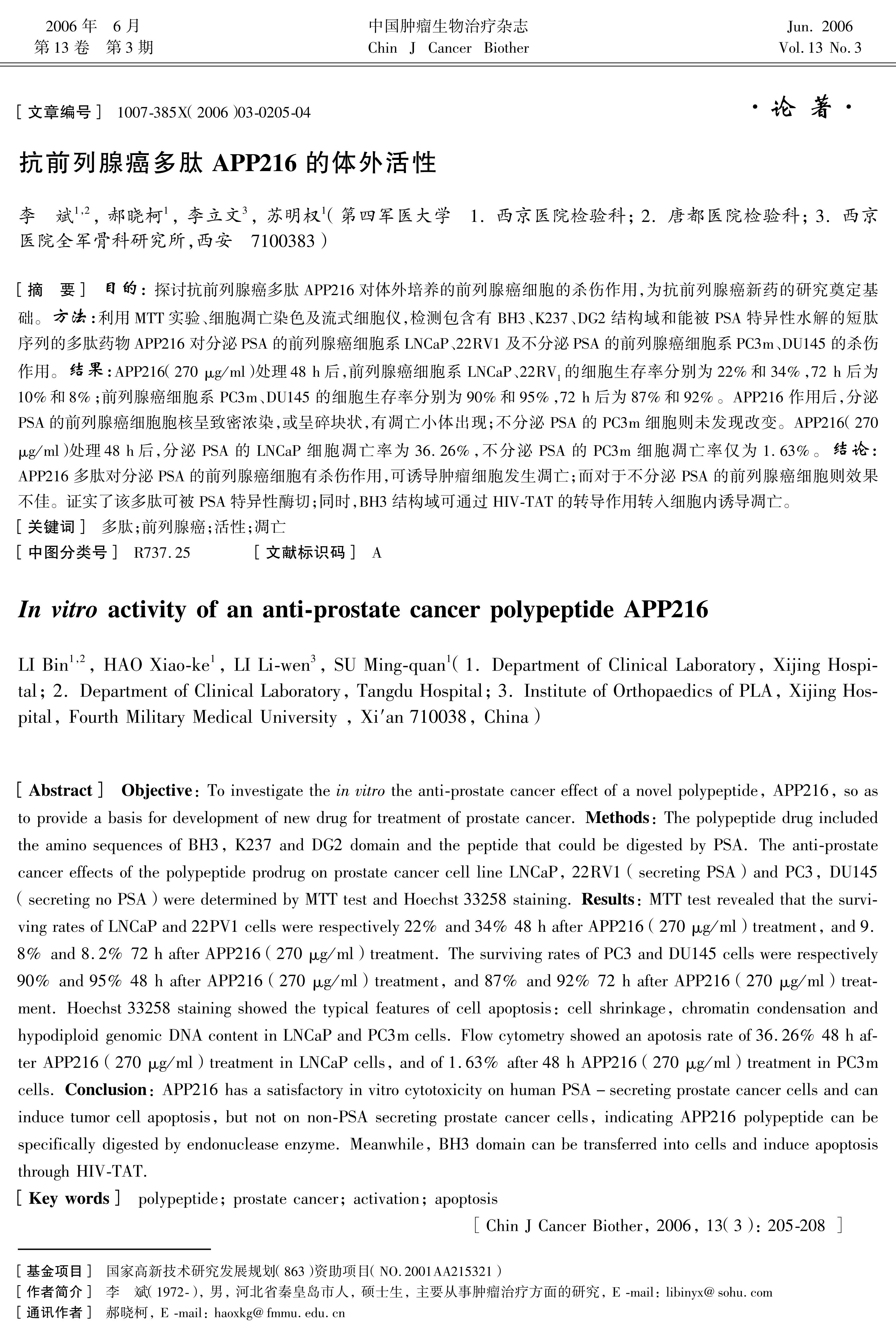 目的: 探讨抗前列腺癌多肽APP216对体外培养的前列腺癌细胞的杀伤作用,为抗前列腺癌新药的研究奠定基础。方法:利用MTT实验、细胞凋亡染色及流式细胞仪,检测包含有BH3、K237、DG2结构域和能被PSA特异性水解的短肽序列的多肽药物APP216对分泌PSA的前列腺癌细胞系LNCaP、22RV1及不分泌PSA的前列腺癌细胞系PC3m、DU145的杀伤作用。结果:APP216(270 μg/ml)处理48 h后,前列腺癌细胞系LNCaP、22RV1的细胞生存率分别为22%和34%,72 h后为10%和8%;前列腺癌细胞系PC3m、DU145的细胞生存率分别为90%和95%,72 h后为87%和92%。APP216作用后,分泌PSA的前列腺癌细胞胞核呈致密浓染,或呈碎块状,有凋亡小体出现;不分泌PSA的PC3m细胞则未发现改变。APP216(270 μg/ml)处理48 h后,分泌PSA的LNCaP细胞凋亡率为36.26%,不分泌PSA的PC3m细胞凋亡率仅为1.63%。结论:APP216多肽对分泌PSA的前列腺癌细胞有杀伤作用,可诱导肿瘤细胞发生凋亡;而对于不分泌PSA的前列腺癌细胞则效果不佳。证实了该多肽可被PSA特异性酶切;同时,BH3结构域可通过HIV-TAT的转导作用转入细胞内诱导凋亡。