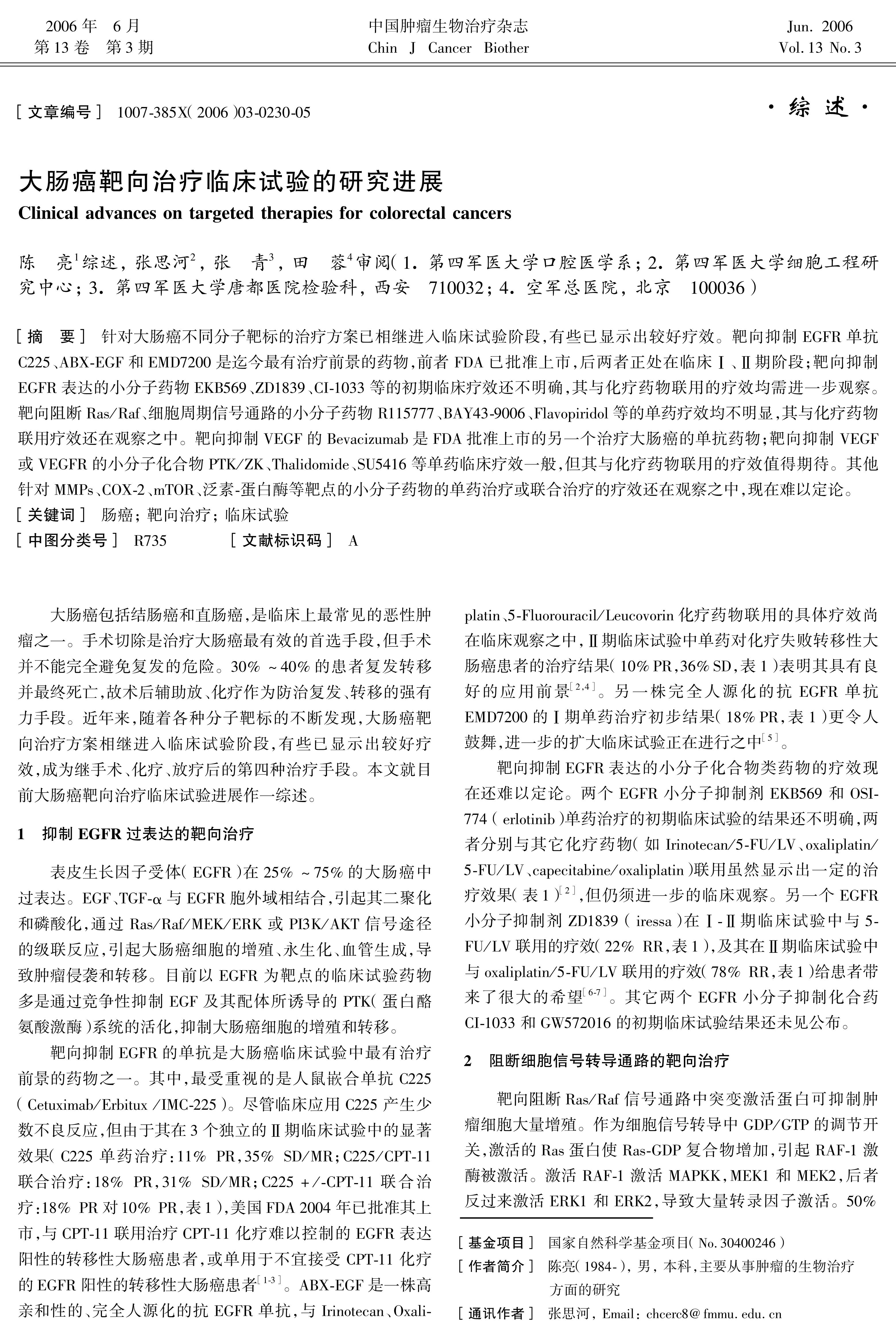 针对大肠癌不同分子靶标的治疗方案已相继进入临床试验阶段,有些已显示出较好疗效。靶向抑制EGFR单抗C225、ABX-EGF和EMD7200是迄今最有治疗前景的药物,前者FDA已批准上市,后两者正处在临床Ⅰ、Ⅱ期阶段;靶向抑制EGFR表达的小分子药物EKB569、ZD1839、CI-1033等的初期临床疗效还不明确,其与化疗药物联用的疗效均需进一步观察。靶向阻断Ras/Raf、细胞周期信号通路的小分子药物R115777、BAY43-9006、Flavopiridol等的单药疗效均不明显,其与化疗药物联用疗效还在观察之中。靶向抑制VEGF的Bevacizumab是FDA批准上市的另一个治疗大肠癌的单抗药物;靶向抑制VEGF或VEGFR的小分子化合物PTK/ZK、Thalidomide、SU5416等单药临床疗效一般,但其与化疗药物联用的疗效值得期待。其他针对MMPs、COX-2、mTOR、泛素-蛋白酶等靶点的小分子药物的单药治疗或联合治疗的疗效还在观察之中,现在难以定论。
