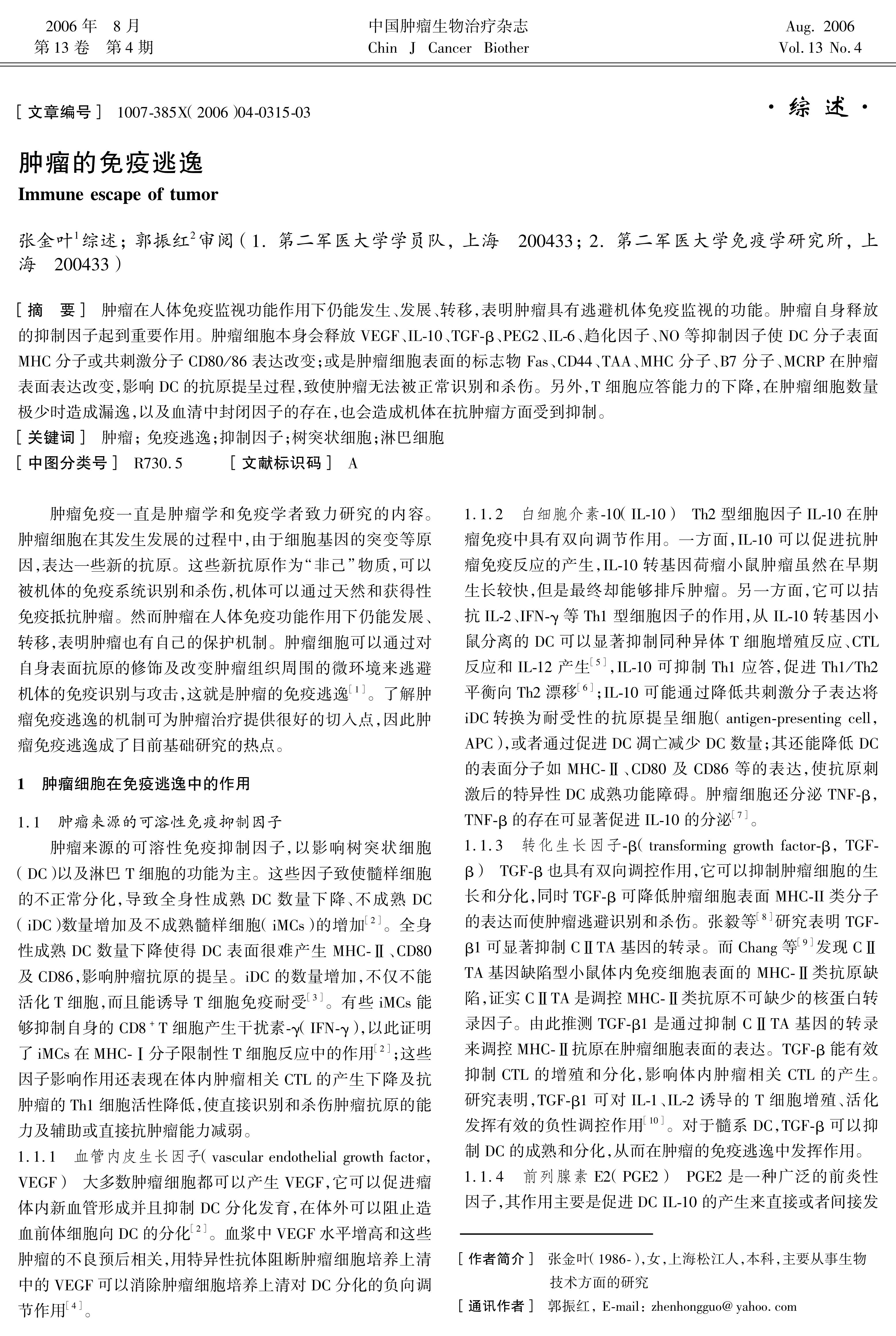 肿瘤在人体免疫监视功能作用下仍能发生、发展、转移,表明肿瘤具有逃避机体免疫监视的功能。肿瘤自身释放的抑制因子起到重要作用。肿瘤细胞本身会释放VEGF、IL-10、TGF-β、PEG2、IL-6、趋化因子、NO等抑制因子使DC分子表面MHC分子或共刺激分子CD80/86表达改变;或是肿瘤细胞表面的标志物Fas、CD44、TAA、MHC分子、B7分子、MCRP在肿瘤表面表达改变,影响DC的抗原提呈过程,致使肿瘤无法被正常识别和杀伤。另外,T细胞应答能力的下降,在肿瘤细胞数量极少时造成漏逸,以及血清中封闭因子的存在,也会造成机体在抗肿瘤方面受到抑制。