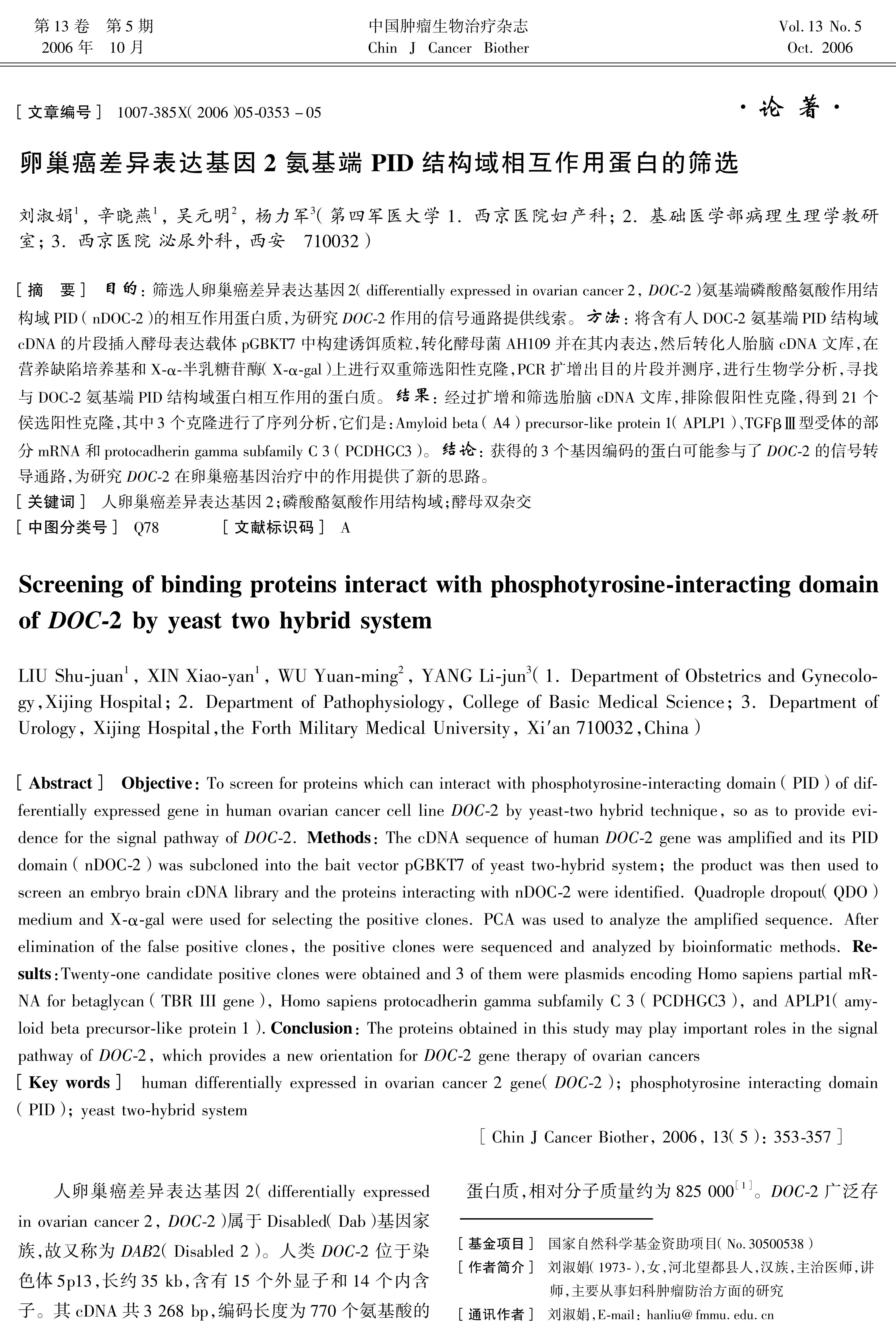 Objective: To screen for proteins which can interact with phosphotyrosine-interacting domain (PID) of differentially expressed gene in human ovarian cancer cell line DOC-2 by yeast-two hybrid technique, so as to provide evidence for the signal pathway of DOC-2. Methods: The cDNA sequence of human DOC-2 gene was amplified and its PID domain (nDOC-2) was subcloned into the bait vector pGBKT7 of yeast two-hybrid system; the product was then used to screen an embryo brain cDNA library and the proteins interacting with nDOC-2 were identified. Quadrople dropout(QDO) medium and X-α-gal were used for selecting the positive clones. PCA was used to analyze the amplified sequence. After elimination of the false positive clones, the positive clones were sequenced and analyzed by bioinformatic methods. Results:Twenty-one candidate positive clones were obtained and 3 of them were plasmids encoding Homo sapiens partial mRNA for betaglycan (TBR III gene), Homo sapiens protocadherin gamma subfamily C 3 (PCDHGC3), and APLP1(amyloid beta precursor-like protein 1).Conclusion: The proteins obtained in this study may play important roles in the signal pathway of DOC-2, which provides a new orientation for DOC-2 gene therapy of ovarian cancers