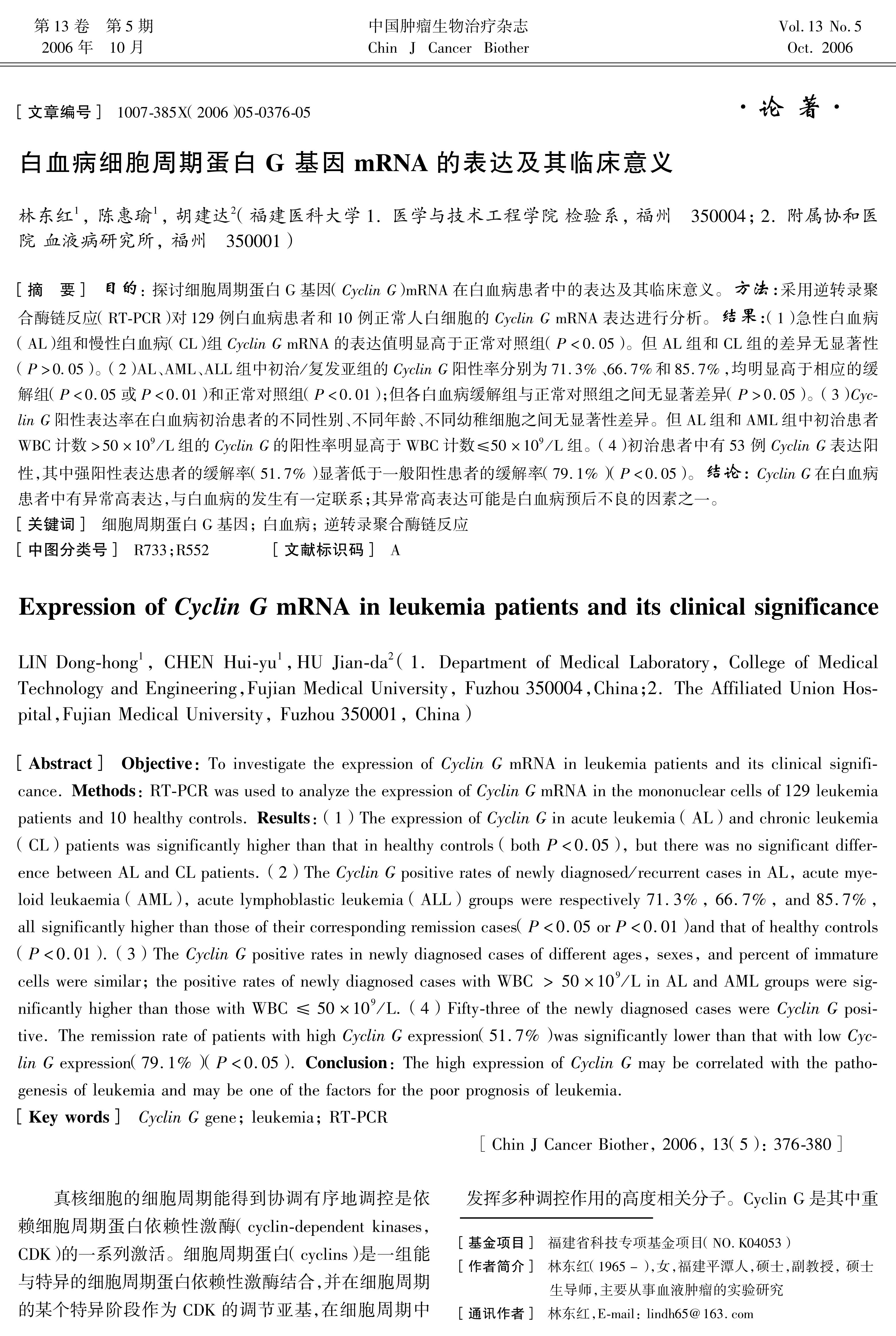 目的: 探讨细胞周期蛋白G基因(Cyclin G)mRNA在白血病患者中的表达及其临床意义。方法:采用逆转录聚合酶链反应(RT-PCR)对129例白血病患者和10例正常人白细胞的Cyclin G mRNA表达进行分析。结果:(1)急性白血病(AL)组和慢性白血病(CL)组Cyclin G mRNA的表达值明显高于正常对照组(P<0.05)。但AL组和CL组的差异无显著性(P>005)。(2)AL、AML、ALL组中初治/复发亚组的Cyclin G阳性率分别为71.3%、66.7%和85.7%,均明显高于相应的缓解组(P<0.05或P<0.01)和正常对照组(P<0.01);但各白血病缓解组与正常对照组之间无显著差异(P>0.05)。(3)Cyclin G阳性表达率在白血病初治患者的不同性别、不同年龄、不同幼稚细胞之间无显著性差异。但AL组和AML组中初治患者WBC计数>50×109/L组的Cyclin G的阳性率明显高于WBC计数≤50×109/L组。(4)初治患者中有53例Cyclin G表达阳性,其中强阳性表达患者的缓解率(51.7%)显著低于一般阳性患者的缓解率(79.1%)(P<0.05)。结论: Cyclin G在白血病患者中有异常高表达,与白血病的发生有一定联系;其异常高表达可能是白血病预后不良的因素之一。