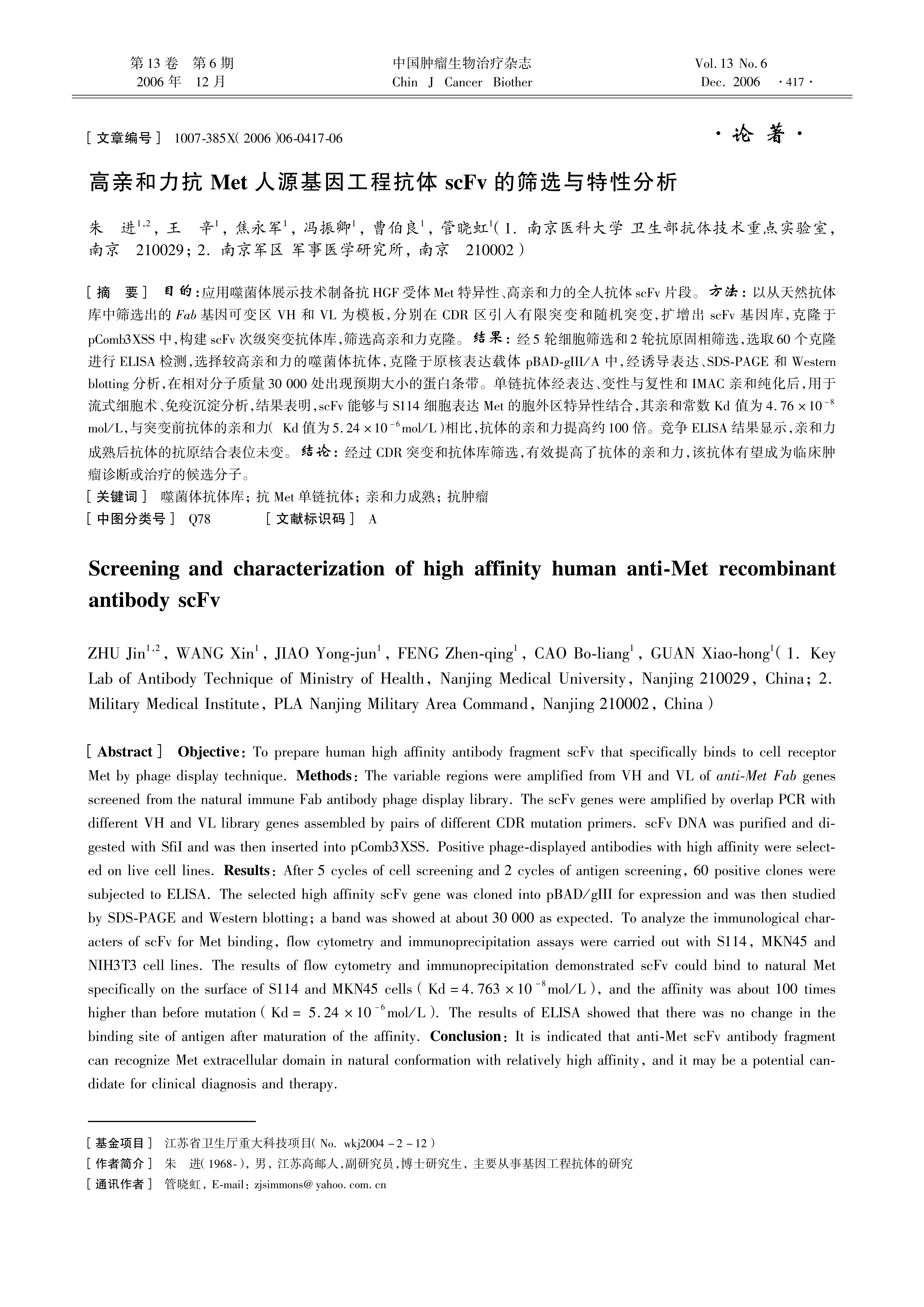 应用噬菌体展示技术制备抗HGF受体Met特异性、高亲和力的全人抗体scFv片段。方法: 以从天然抗体库中筛选出的 Fab 基因可变区VH和VL为模板,分别在CDR区引入有限突变和随机突变,扩增出scFv基因库,克隆于pComb3XSS中,构建scFv次级突变抗体库,筛选高亲和力克隆。结果:经5轮细胞筛选和2轮抗原固相筛选,选取60个克隆进行ELISA检测,选择较高亲和力的噬菌体抗体,克隆于原核表达载体pBAD-gIII/A中,经诱导表达、SDS-PAGE和Western blotting分析,在相对分子质量30 000处出现预期大小的蛋白条带。单链抗体经表达、变性与复性和IMAC亲和纯化后,用于流式细胞术、免疫沉淀分析,结果表明,scFv能够与S114细胞表达Met的胞外区特异性结合,其亲和常数Kd 值为4.76×10 -8 mol/L,与突变前抗体的亲和力( Kd值为5.24×10 -6 mol/L)相比,抗体的亲和力提高约100倍。竞争ELISA结果显示,亲和力成熟后抗体的抗原结合表位未变。 结论: 经过CDR突变和抗体库筛选,有效提高了抗体的亲和力,该抗体有望成为临床肿瘤诊断或治疗的候选分子。