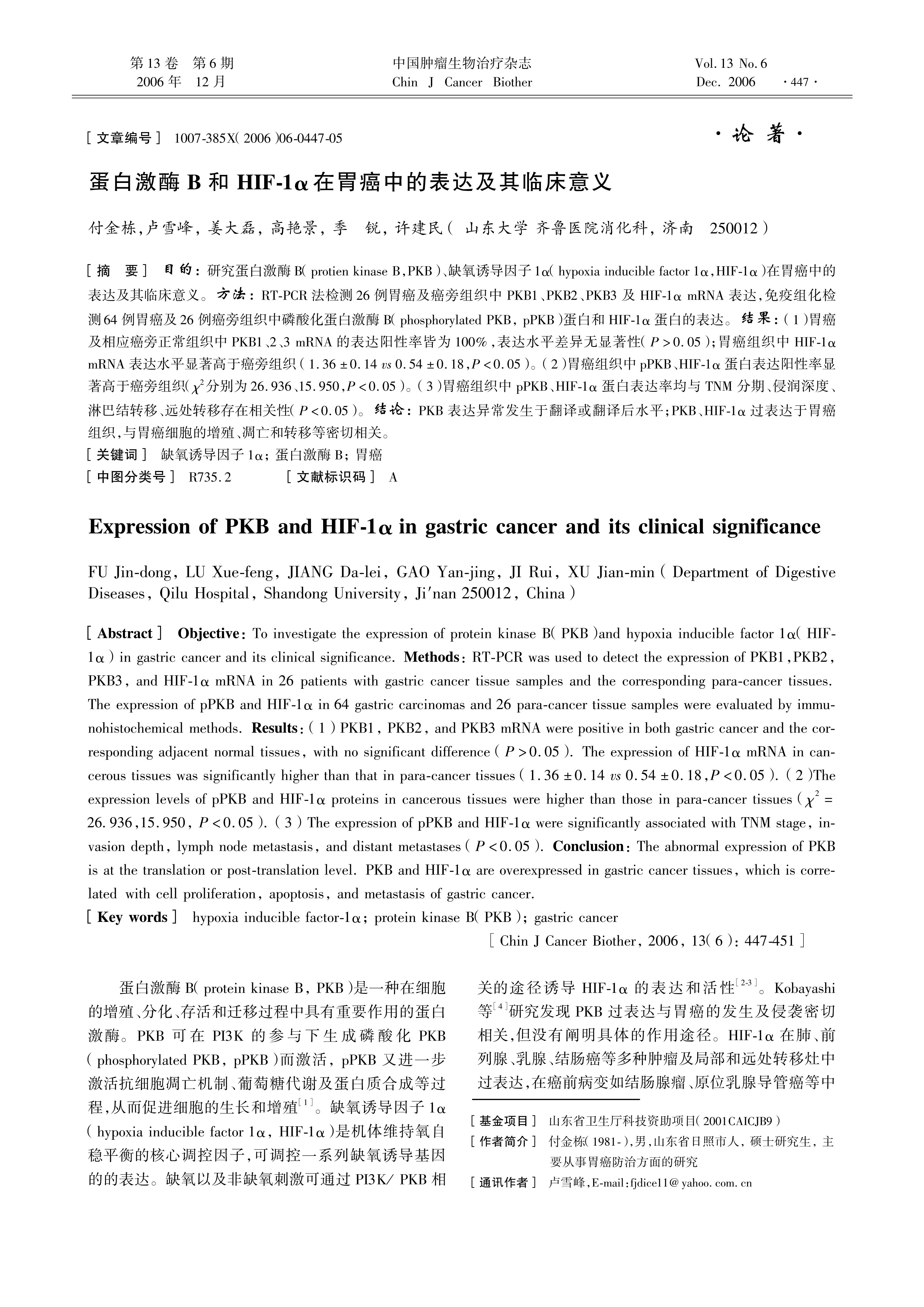 To investigate the expression of protein kinase B(PKB)and hypoxia inducible factor 1α(HIF-1α) in gastric cancer and its clinical significance. Methods: RT-PCR was used to detect the expression of PKB1,PKB2,PKB3, and HIF-1α mRNA in 26 patients with gastric cancer tissue samples and the corresponding para-cancer tissues. The expression of pPKB and HIF-1α in 64 gastric carcinomas and 26 para-cancer tissue samples were evaluated by immunohistochemical methods. Results: (1) PKB1, PKB2, and PKB3 mRNA were positive in both gastric cancer and the corresponding adjacent normal tissues, with no significant difference ( P >0.05). The expression of HIF-1α mRNA in cancerous tissues was significantly higher than that in para-cancer tissues (1.36±0.14 vs 0.54±0.18,P<0.05). (2)The expression levels of pPKB and HIF-1α proteins in cancerous tissues were higher than those in para-cancer tissues (χ2=26936,15.950, P<0.05). (3) The expression of pPKB and HIF-1α were significantly associated with TNM stage, invasion depth, lymph node metastasis, and distant metastases (P<0.05). Conclusion: The abnormal expression of PKB is at the translation or post-translation level. PKB and HIF-1α are overexpressed in gastric cancer tissues, which is correlatedwith cell proliferation, apoptosis, and metastasis of gastric cancer.