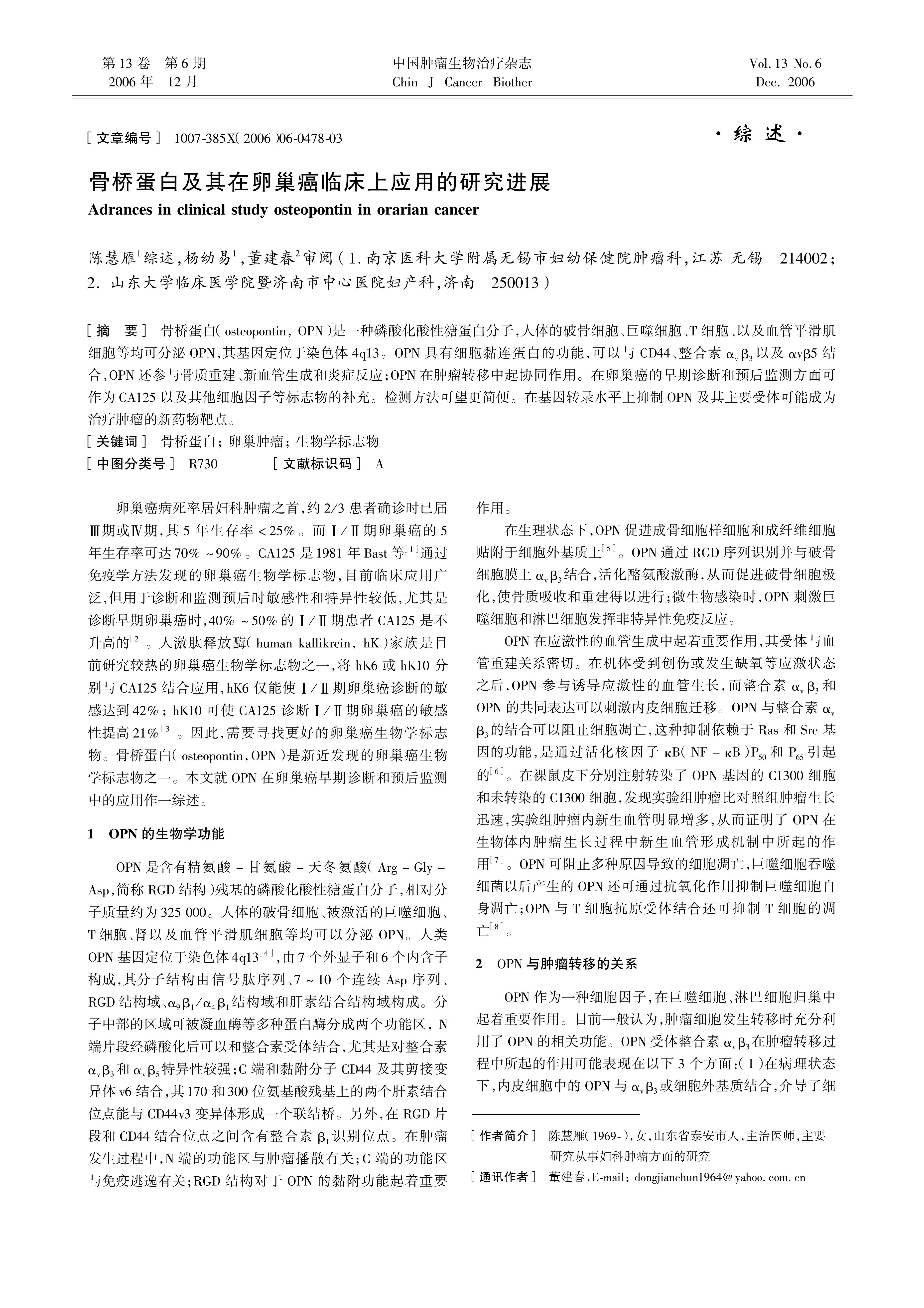 骨桥蛋白(osteopontin, OPN)是一种磷酸化酸性糖蛋白分子,人体的破骨细胞、巨噬细胞、T细胞、以及血管平滑肌细胞等均可分泌OPN,其基因定位于染色体4q13。OPN具有细胞黏连蛋白的功能,可以与CD44、整合素α v β 3 以及αvβ5结合,OPN还参与骨质重建、新血管生成和炎症反应;OPN在肿瘤转移中起协同作用。在卵巢癌的早期诊断和预后监测方面可作为CA125以及其他细胞因子等标志物的补充。检测方法可望更简便。在基因转录水平上抑制OPN及其主要受体可能成为治疗肿瘤的新药物靶点。