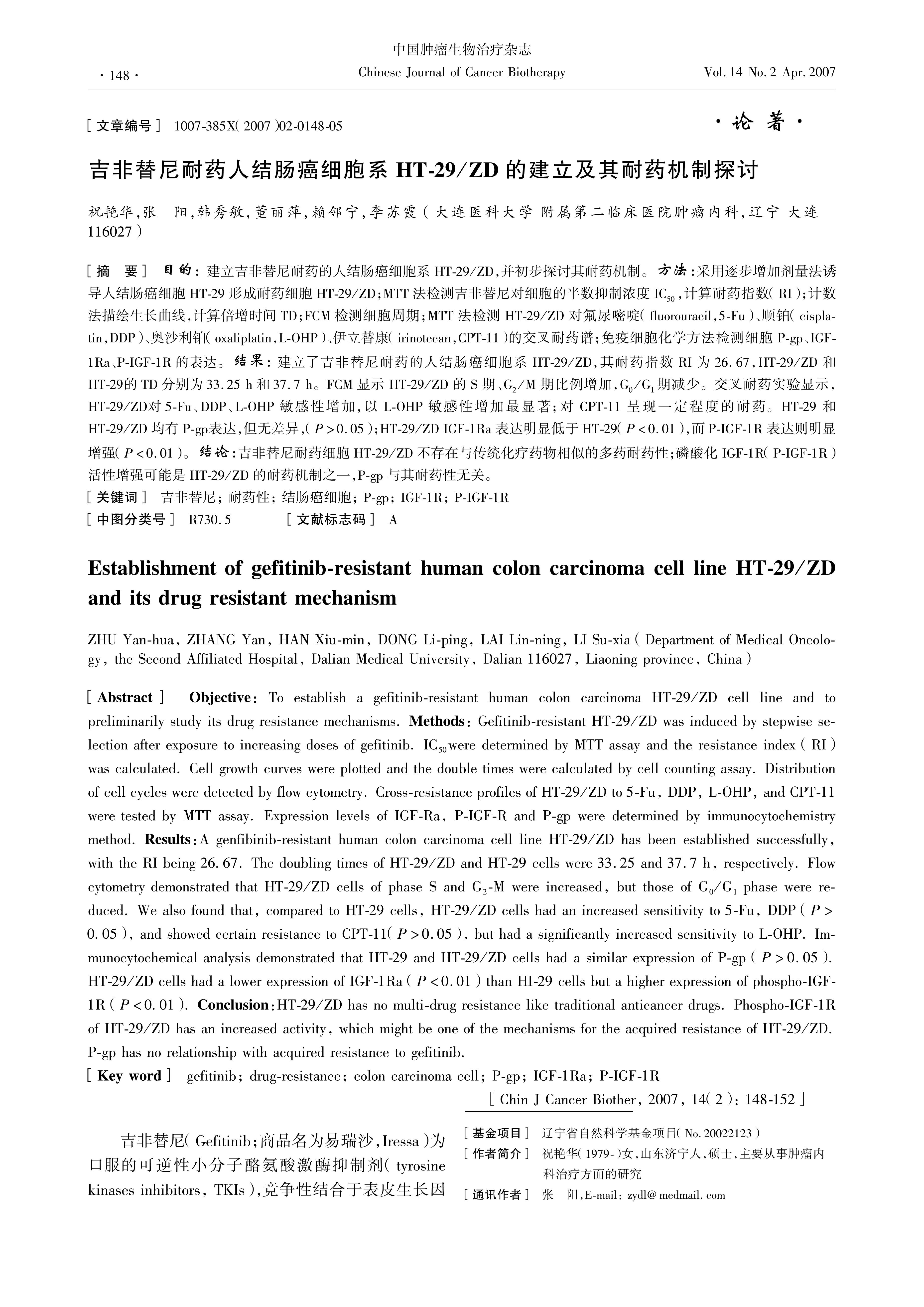 To establish a gefitinibresistant human colon carcinoma HT29/ZD cell line and to preliminarily study its drug resistance mechanisms. Methods: Gefitinibresistant HT29/ZD was induced by stepwise selection after exposure to increasing doses of gefitinib. IC50were determined by MTT assay and the resistance index (RI) was calculated. Cell growth curves were plotted and the double times were calculated by cell counting assay. Distribution of cell cycles were detected by flow cytometry. Crossresistance profiles of HT29/ZD to 5Fu, DDP, LOHP, and CPT11 were tested by MTT assay. Expression levels of IGFRa, PIGFR and Pgp were determined by immunocytochemistry method. Results: A genfibinibresistant human colon carcinoma cell line HT29/ZD has been established successfully, with the RI being 2667. The doubling times of HT29/ZD and HT29 cells were 33.25 and 37.7 h, respectively. Flow cytometry demonstrated that HT29/ZD cells of phase S and G2M were increased, but those of G0/G1 phase were reduced. We also found that, compared to HT29 cells, HT29/ZD cells had an increased sensitivity to 5Fu, DDP (P>005), and showed certain resistance to CPT11(P>0.05), but had a significantly increased sensitivity to LOHP. Immunocytochemical analysis demonstrated that HT29 and HT29/ZD cells had a similar expression of Pgp (P>0.05). HT29/ZD cells had a lower expression of IGF1Ra (P<0.01) than HI29 cells but a higher expression of phosphoIGF1R (P<001). Conclusion:HT29/ZD has no multidrug resistance like traditional anticancer drugs. PhosphoIGF1R of HT29/ZD has an increased activity, which might be one of the mechanisms for the acquired resistance of HT29/ZD. Pgp has no relationship with acquired resistance to gefitinib.