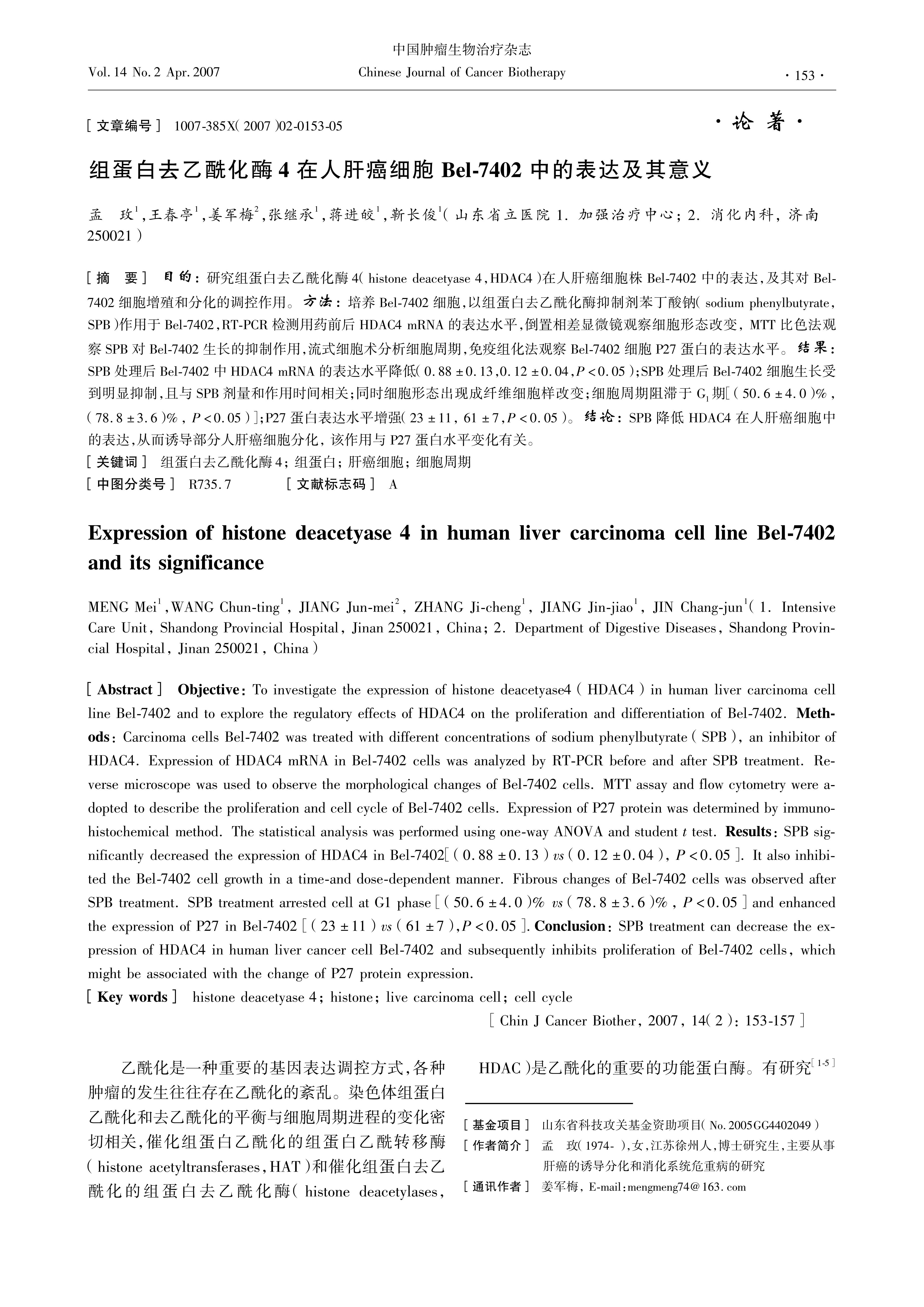 To investigate the expression of histone deacetyase4 (HDAC4) in human liver carcinoma cell line Bel7402 and to explore the regulatory effects of HDAC4 on the proliferation and differentiation of Bel7402. Methods: Carcinoma cells Bel7402 was treated with different concentrations of sodium phenylbutyrate (SPB), an inhibitor of HDAC4. Expression of HDAC4 mRNA in Bel7402 cells was analyzed by RTPCR before and after SPB treatment. Reverse microscope was used to observe the morphological changes of Bel7402 cells. MTT assay and flow cytometry were adopted to describe the proliferation and cell cycle of Bel7402 cells. Expression of P27 protein was determined by immunohistochemical method. The statistical analysis was performed using oneway ANOVA and student t test. Results: SPB significantly decreased the expression of HDAC4 in Bel7402\[(0.88±0.13) vs (0.12±0.04), P<0.05\]. It also inhibited the Bel7402 cell growth in a timeand dosedependent manner. Fibrous changes of Bel7402 cells was observed after SPB treatment. SPB treatment arrested cell at G1 phase \[(50.6±4.0)% vs (78.8±3.6)%, P<0.05\] and enhanced the expression of P27 in Bel7402 \[(23±11) vs (61±7),P<0.05\].Conclusion: SPB treatment can decrease the expression of HDAC4 in human liver cancer cell Bel7402 and subsequently inhibits proliferation of Bel7402 cells, which might be associated with the change of P27 protein expression.