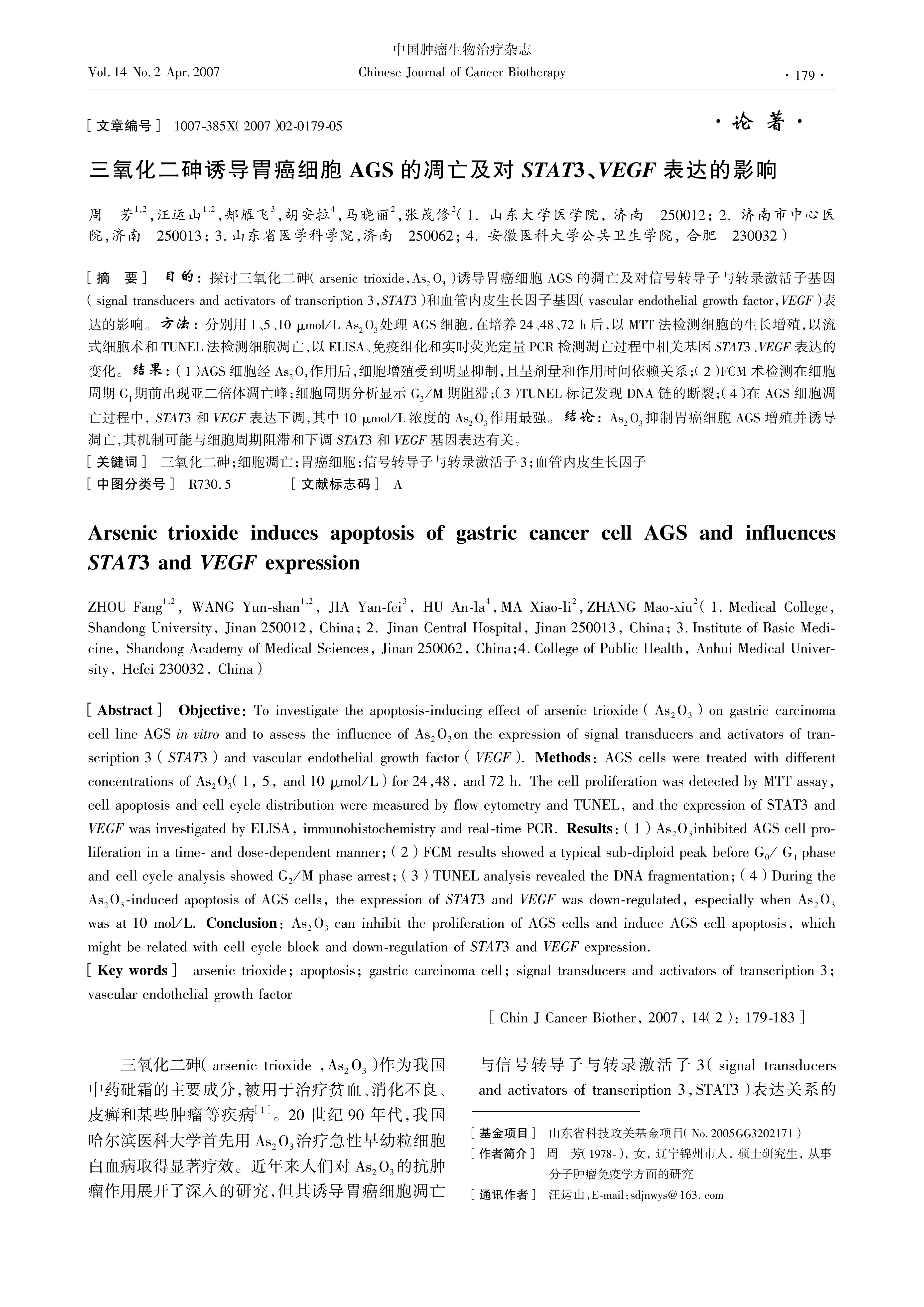 To investigate the apoptosisinducing effect of arsenic trioxide (As2O3) on gastric carcinoma cell line AGS in vitro and to assess the influence of As2O3 on the expression of signal transducers and activators of transcription 3 (STAT3) and vascular endothelial growth factor (VEGF). Methods: AGS cells were treated with different concentrations of As2O3 (1, 5, and 10 μmol/L) for 24,48, and 72 h. The cell proliferation was detected by MTT assay, cell apoptosis and cell cycle distribution were measured by flow cytometry and TUNEL, and the expression of STAT3 and VEGF was investigated by ELISA, immunohistochemistry and realtime PCR. Results: (1) As2O3 inhibited AGS cell proliferation in a time and dosedependent manner; (2) FCM results showed a typical subdiploid peak before G0/ G1 phase and cell cycle analysis showed G2/M phase arrest; (3) TUNEL analysis revealed the DNA fragmentation; (4) During the As2O3induced apoptosis of AGS cells, the expression of STAT3 and VEGF was downregulated, especially when As2O3 was at 10 mol/L. Conclusion: As2O3 can inhibit the proliferation of AGS cells and induce AGS cell apoptosis, which might be related with cell cycle block and downregulation of STAT3 and VEGF expression.
