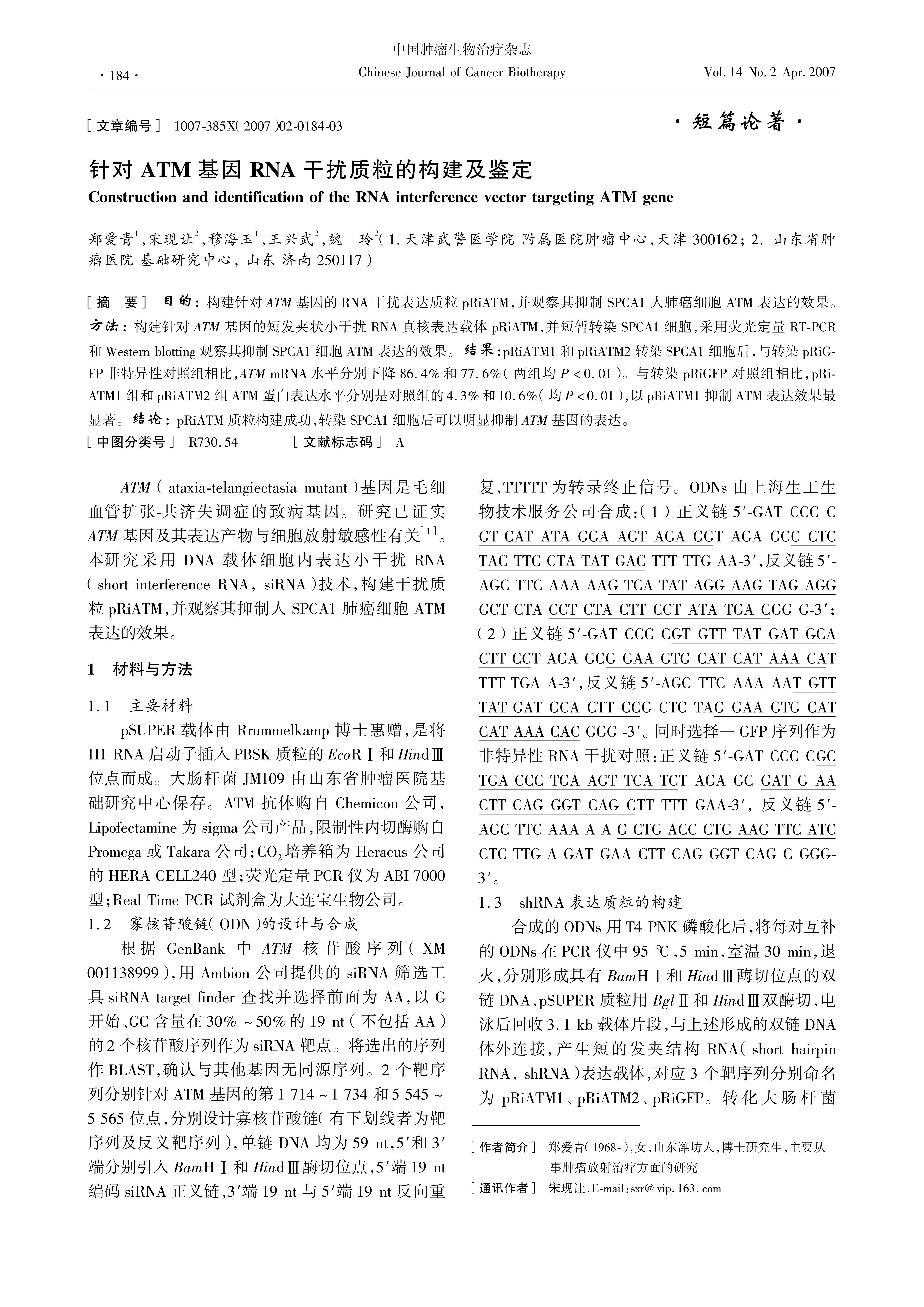 构建针对ATM基因的RNA干扰表达质粒pRiATM,并观察其抑制SPCA1人肺癌细胞ATM表达的效果。方法: 构建针对ATM基因的短发夹状小干扰RNA真核表达载体pRiATM,并短暂转染SPCA1细胞,采用荧光定量RTPCR和Western blotting观察其抑制SPCA1细胞ATM表达的效果。结果:pRiATM1和pRiATM2转染SPCA1细胞后,与转染pRiGFP非特异性对照组相比,ATM mRNA水平分别下降86.4%和77.6%(两组均P<0.01)。与转染pRiGFP对照组相比,pRiATM1组和pRiATM2组ATM蛋白表达水平分别是对照组的4.3%和10.6%(均P<0.01),以pRiATM1抑制ATM表达效果最显著。结论: pRiATM质粒构建成功,转染SPCA1细胞后可以明显抑制ATM基因的表达。