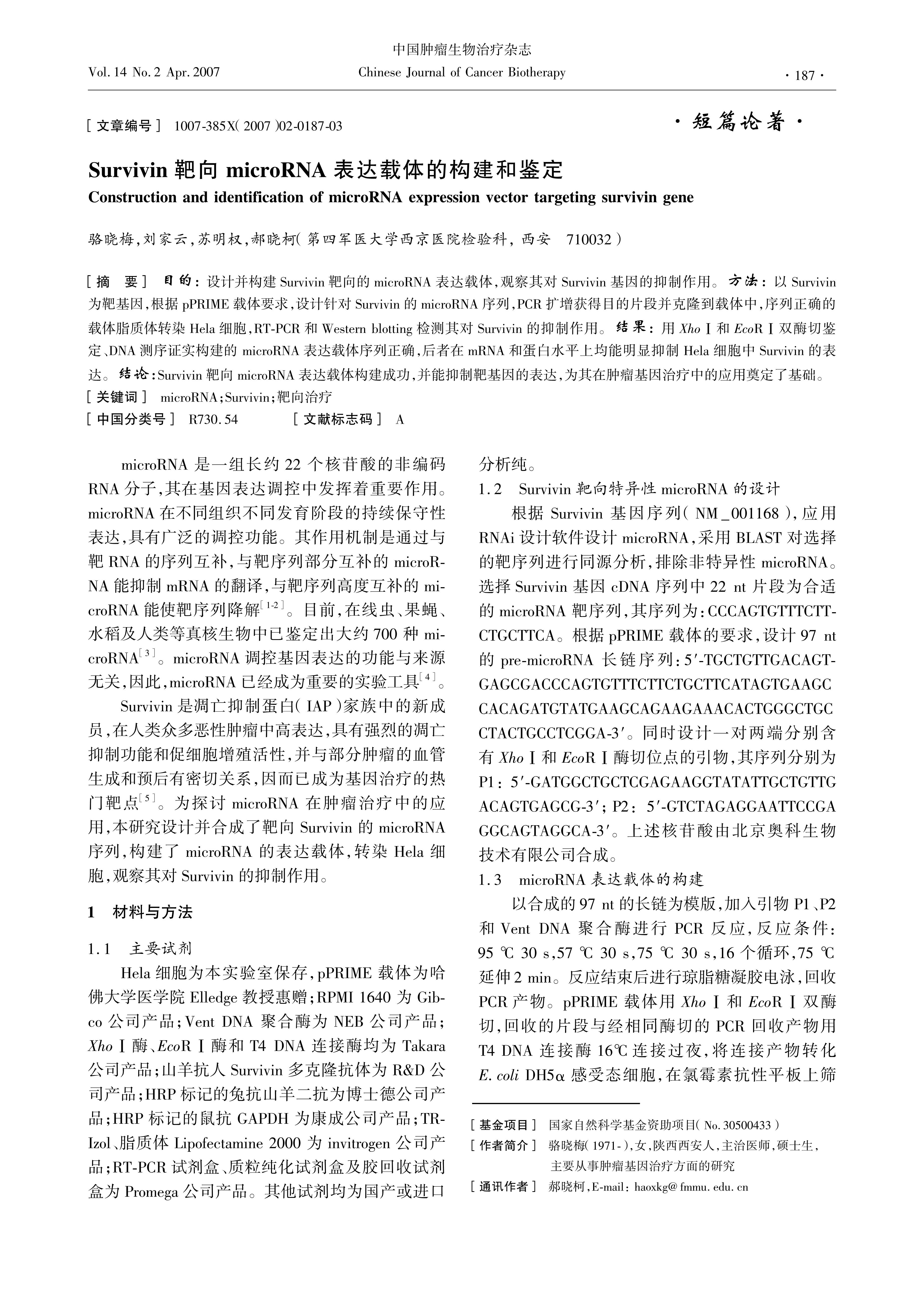 设计并构建Survivin靶向的microRNA表达载体,观察其对Survivin基因的抑制作用。方法: 以Survivin为靶基因,根据pPRIME载体要求,设计针对Survivin的microRNA序列,PCR扩增获得目的片段并克隆到载体中,序列正确的载体脂质体转染Hela细胞,RTPCR和Western blotting检测其对Survivin的抑制作用。结果: 用XhoⅠ和EcoRⅠ双酶切鉴定、DNA测序证实构建的 microRNA表达载体序列正确,后者在mRNA和蛋白水平上均能明显抑制Hela细胞中Survivin的表达。结论:Survivin靶向microRNA表达载体构建成功,并能抑制靶基因的表达,为其在肿瘤基因治疗中的应用奠定了基础。