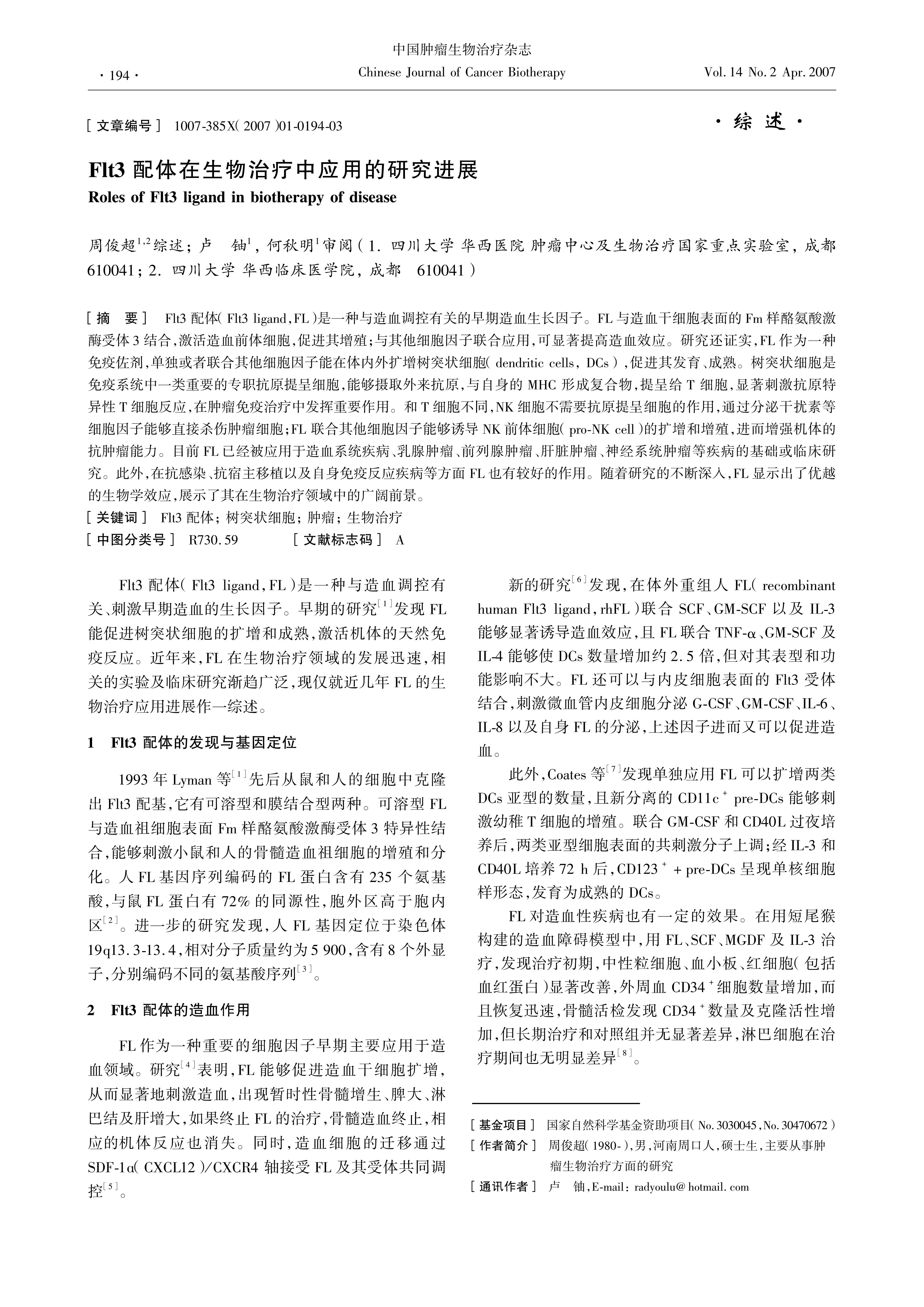 Flt3配体(Flt3 ligand,FL)是一种与造血调控有关的早期造血生长因子。FL与造血干细胞表面的Fm样酪氨酸激酶受体3结合,激活造血前体细胞,促进其增殖;与其他细胞因子联合应用,可显著提高造血效应。研究还证实,FL作为一种免疫佐剂,单独或者联合其他细胞因子能在体内外扩增树突状细胞(dendritic cells, DCs) ,促进其发育、成熟。树突状细胞是免疫系统中一类重要的专职抗原提呈细胞,能够摄取外来抗原,与自身的MHC 形成复合物,提呈给T 细胞,显著刺激抗原特异性T细胞反应,在肿瘤免疫治疗中发挥重要作用。和T细胞不同,NK细胞不需要抗原提呈细胞的作用,通过分泌干扰素等细胞因子能够直接杀伤肿瘤细胞;FL 联合其他细胞因子能够诱导NK前体细胞(proNK cell)的扩增和增殖,进而增强机体的抗肿瘤能力。目前FL已经被应用于造血系统疾病、乳腺肿瘤、前列腺肿瘤、肝脏肿瘤、神经系统肿瘤等疾病的基础或临床研究。此外,在抗感染、抗宿主移植以及自身免疫反应疾病等方面FL也有较好的作用。随着研究的不断深入,FL显示出了优越的生物学效应,展示了其在生物治疗领域中的广阔前景。