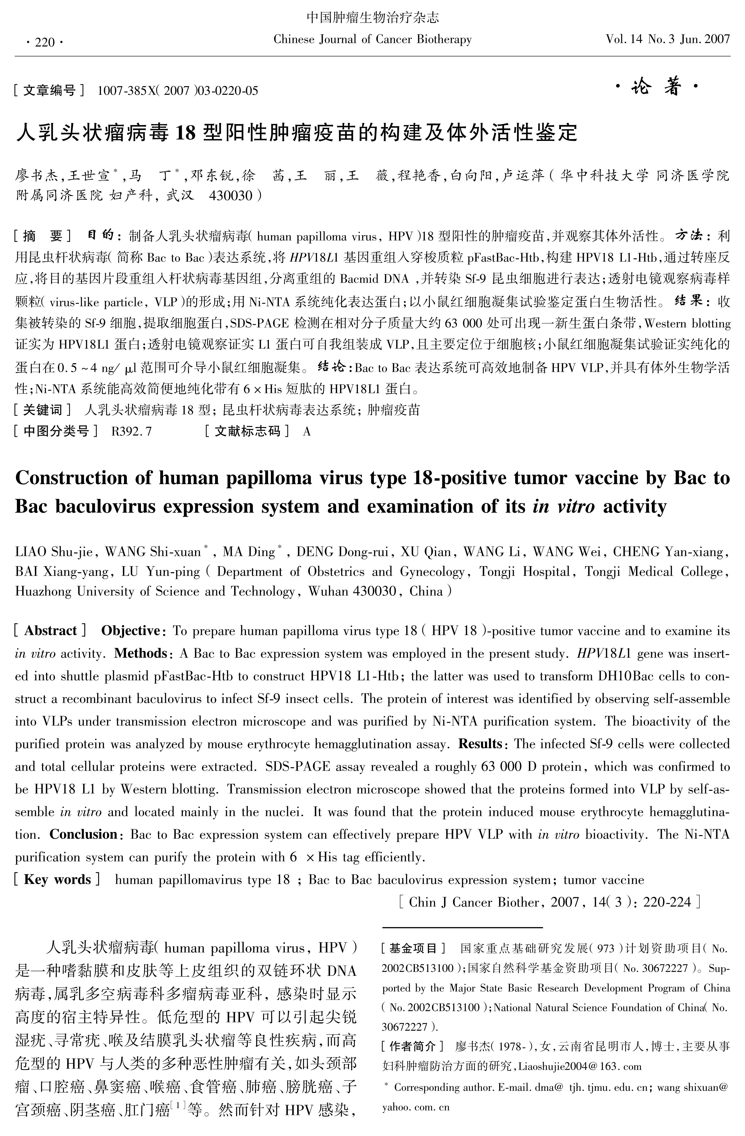 目的:制备人乳头状瘤病毒(human papilloma virus,HPV)18型阳性的肿瘤疫苗,并观察其体外活性。方法:利用昆虫杆状病毒(简称Bac to Bac)表达系统,将HPV18L1基因重组入穿梭质粒pFastBac-Htb,构建HPV18L1-Htb,通过转座反应,将目的基因片段重组入杆状病毒基因组,分离重组的Bacmid DNA,并转染Sf-9昆虫细胞进行表达;透射电镜观察病毒样颗粒(virus-like particle,VLP)的形成;用Ni-NTA系统纯化表达蛋白;以小鼠红细胞凝集试验鉴定蛋白生物活性。结果:收集被转染的Sf-9细胞,提取细胞蛋白,SDS-PAGE检测在相对分子质量大约63000处可出现一新生蛋白条带,Western blotting证实为HPV18L1蛋白;透射电镜观察证实L1蛋白可自我组装成VLP,且主要定位于细胞核;小鼠红细胞凝集试验证实纯化的蛋白在0.5~4ng/μl范围可介导小鼠红细胞凝集。结论:Bac to Bac表达系统可高效地制备HPVVLP,并具有体外生物学活性;Ni-NTA系统能高效简便地纯化带有6×His短肽的HPV18L1蛋白。