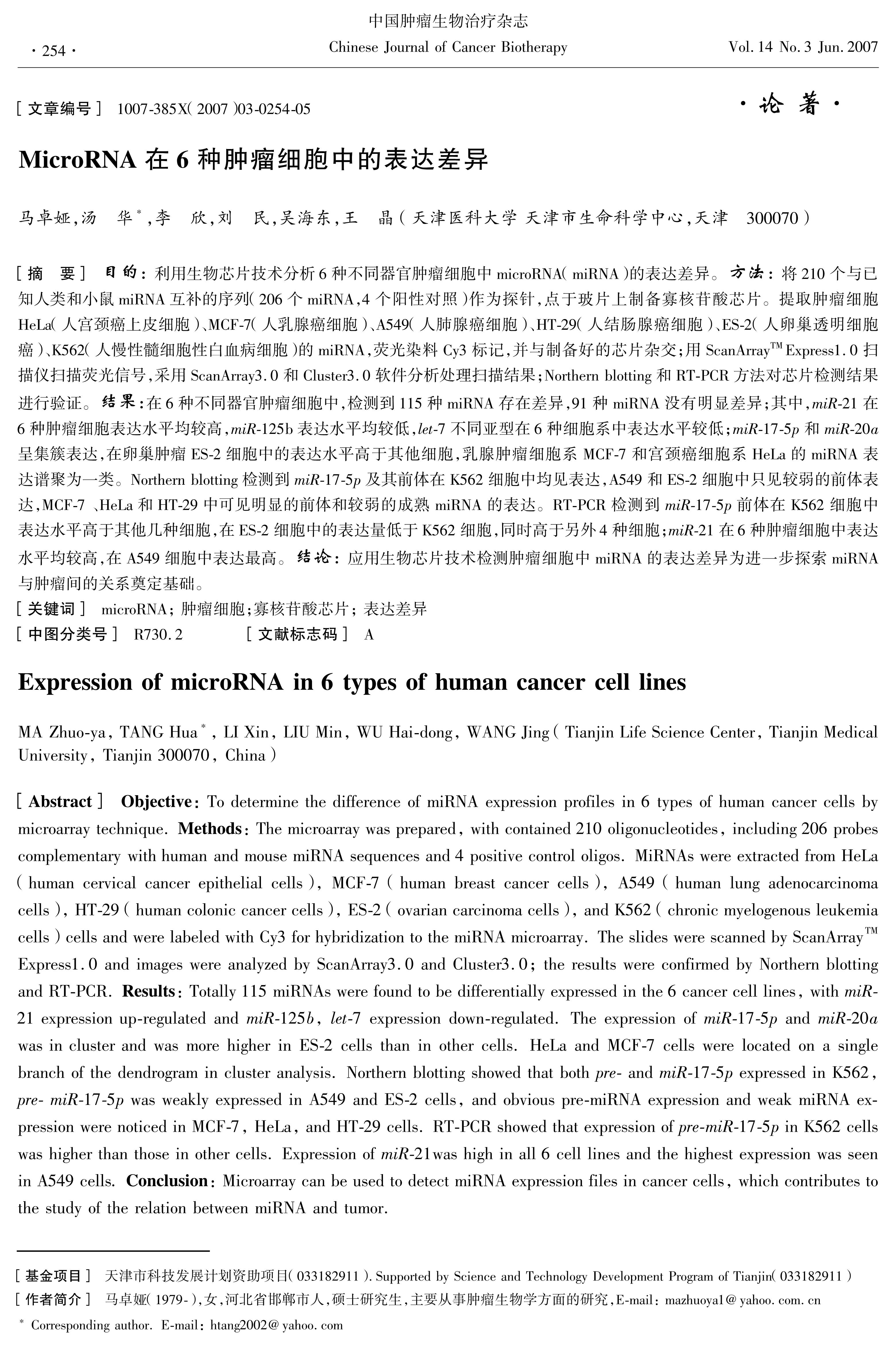 目的:利用生物芯片技术分析6种不同器官肿瘤细胞中microRNA(miRNA)的表达差异。方法:将210个与已知人类和小鼠miRNA互补的序列(206个miRNA,4个阳性对照)作为探针,点于玻片上制备寡核苷酸芯片。提取肿瘤细胞HeLa(人宫颈癌上皮细胞)、MCF-7(人乳腺癌细胞)、A549(人肺腺癌细胞)、HT-29(人结肠腺癌细胞)、ES-2(人卵巢透明细胞癌)、K562(人慢性髓细胞性白血病细胞)的miRNA,荧光染料Cy3标记,并与制备好的芯片杂交;用ScanArrayTM Express1.0扫描仪扫描荧光信号,采用ScanArray3.0和Cluster3.0软件分析处理扫描结果;Northern blotting和RT-PCR方法对芯片检测结果进行验证。结果:在6种不同器官肿瘤细胞中,检测到115种miRNA存在差异,91种miRNA没有明显差异;其中,miR-21在6种肿瘤细胞表达水平均较高,miR-125b表达水平均较低,let-7不同亚型在6种细胞系中表达水平较低;miR-17-5p和miR-20a呈集簇表达,在卵巢肿瘤ES-2细胞中的表达水平高于其他细胞,乳腺肿瘤细胞系MCF-7和宫颈癌细胞系HeLa的miRNA表达谱聚为一类。Northern blotting检测到miR-17-5p及其前体在K562细胞中均见表达,A549和ES-2细胞中只见较弱的前体表达,MCF-7、HeLa和HT-29中可见明显的前体和较弱的成熟miRNA的表达。RT-PCR检测到miR-17-5p前体在K562细胞中表达水平高于其他几种细胞,在ES-2细胞中的表达量低于K562细胞,同时高于另外4种细胞;miR-21在6种肿瘤细胞中表达水平均较高,在A549细胞中表达最高。结论:应用生物芯片技术检测肿瘤细胞中miRNA的表达差异为进一步探索miRNA与肿瘤间的关系奠定基础。