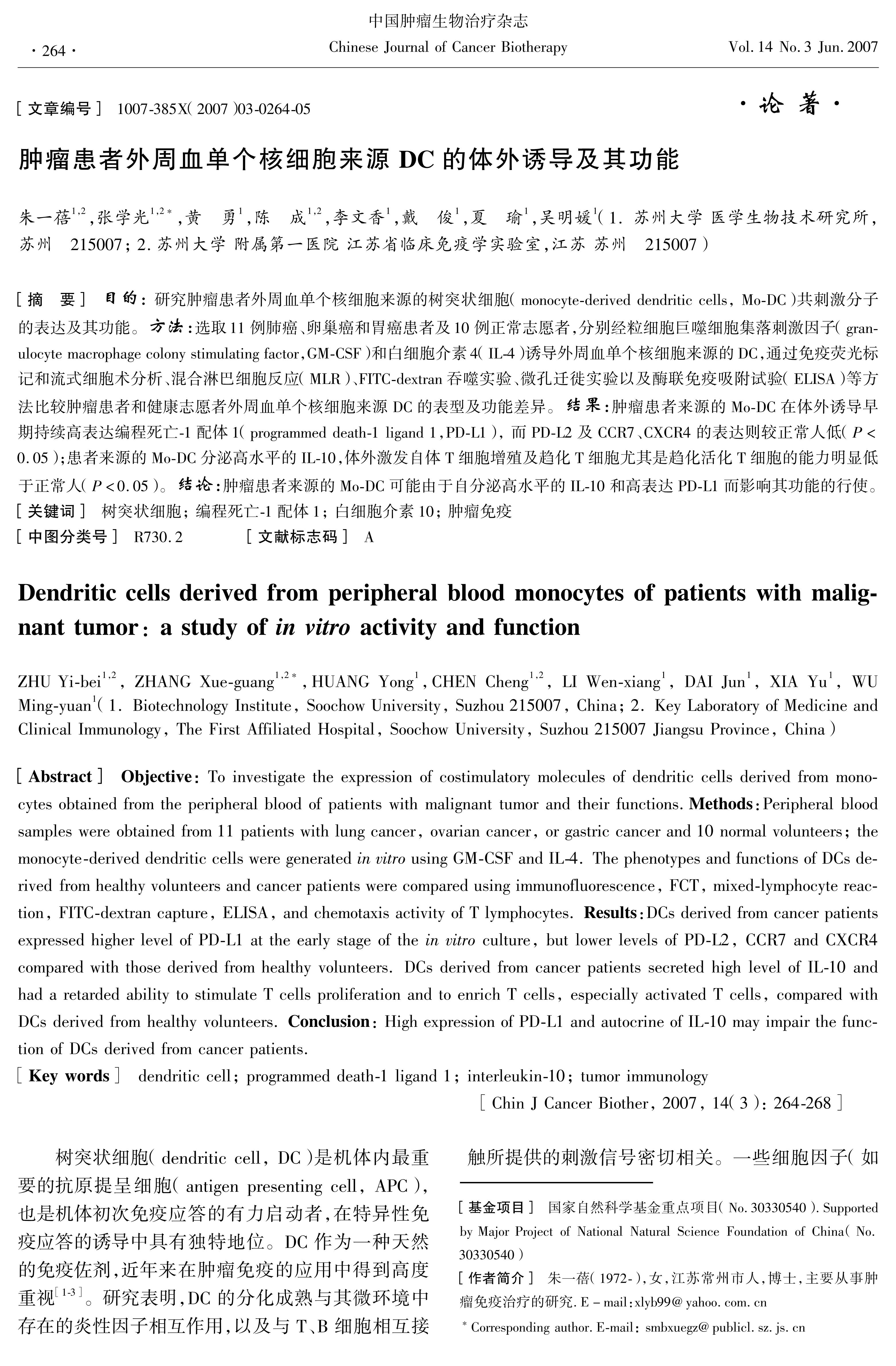 目的:研究肿瘤患者外周血单个核细胞来源的树突状细胞(monocyte-deriveddendriticcells,Mo-DC)共刺激分子的表达及其功能。方法:选取11例肺癌、卵巢癌和胃癌患者及10例正常志愿者,分别经粒细胞巨噬细胞集落刺激因子(gran-ulocytemacrophagecolonystimulatingfactor,GM-CSF)和白细胞介素4(IL-4)诱导外周血单个核细胞来源的DC,通过免疫荧光标记和流式细胞术分析、混合淋巴细胞反应(MLR)、FITC-dextran吞噬实验、微孔迁徙实验以及酶联免疫吸附试验(ELISA)等方法比较肿瘤患者和健康志愿者外周血单个核细胞来源DC的表型及功能差异。结果:肿瘤患者来源的Mo-DC在体外诱导早期持续高表达编程死亡-1配体1(programmeddeath-1ligand1,PD-L1),而PD-L2及CCR7、CXCR4的表达则较正常人低(P<0.05);患者来源的Mo-DC分泌高水平的IL-10,体外激发自体T细胞增殖及趋化T细胞尤其是趋化活化T细胞的能力明显低于正常人(P<0.05)。结论:肿瘤患者来源的Mo-DC可能由于自分泌高水平的IL-10和高表达PD-L1而影响其功能的行使。
