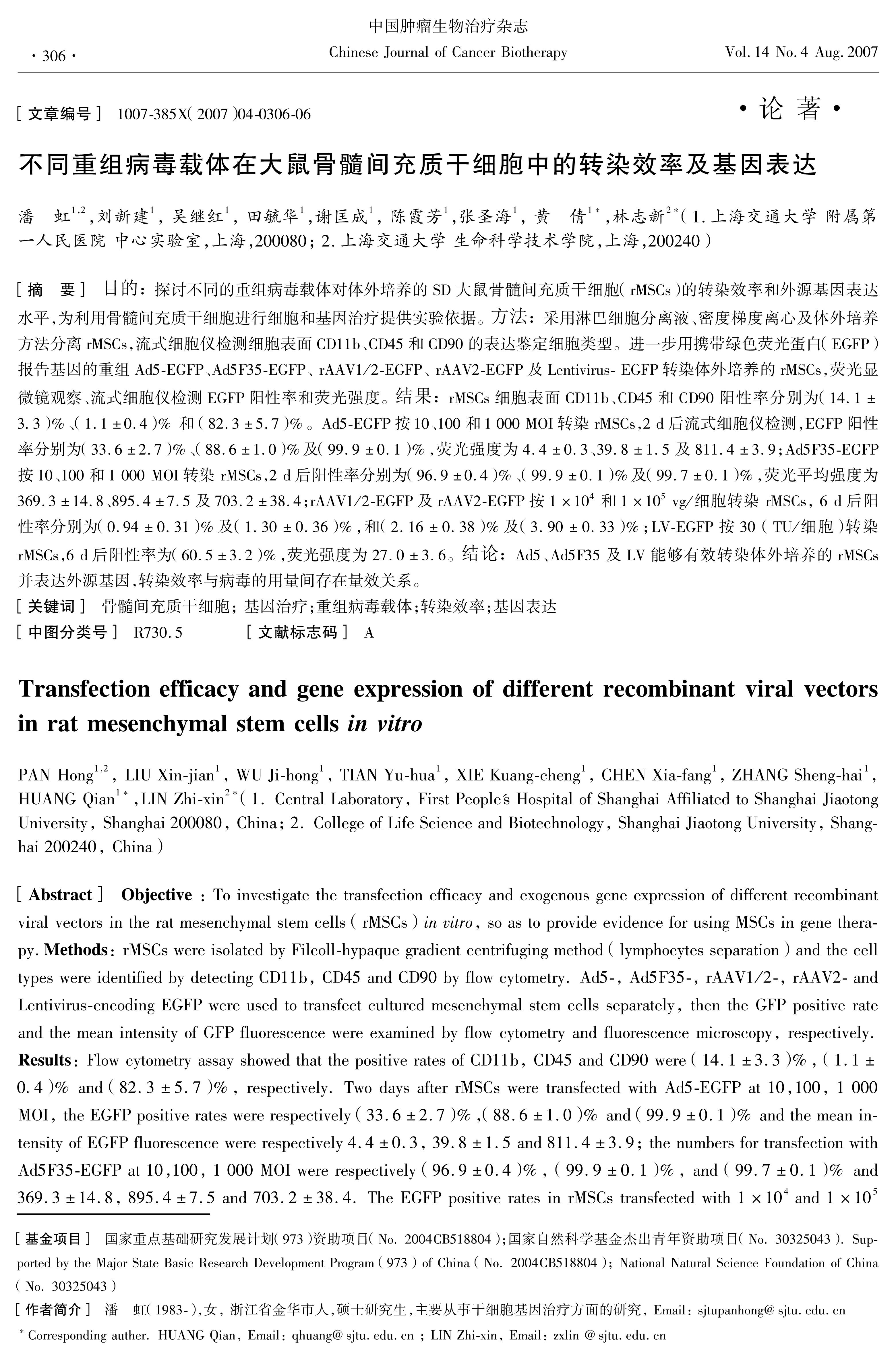 探讨不同的重组病毒载体对体外培养的SD大鼠骨髓间充质干细胞(rMSCs)的转染效率和外源基因表达水平,为利用骨髓间充质干细胞进行细胞和基因治疗提供实验依据。方法:采用淋巴细胞分离液、密度梯度离心及体外培养方法分离rMSCs,流式细胞仪检测细胞表面CD11b、CD45和CD90的表达鉴定细胞类型。进一步用携带绿色荧光蛋白(EGFP)报告基因的重组Ad5-EGFP、Ad5F35-EGFP、rAAV1/2-EGFP、rAAV2-EGFP及Lentivirus-EGFP转染体外培养的rMSCs,荧光显微镜观察、流式细胞仪检测EGFP阳性率和荧光强度。结果:rMSCs细胞表面CD11b、CD45和CD90阳性率分别为(14.1±3.3)%、(1.1±0.4)%和(82.3±5.7)%。Ad5-EGFP按10、100和1000MOI转染rMSCs,2d后流式细胞仪检测,EGFP阳性率分别为(33.6±2.7)%、(88.6±1.0)%及(99.9±0.1)%,荧光强度为4.4±0.3、39.8±1.5及811.4±3.9;Ad5F35-EGFP按10、100和1000MOI转染rMSCs,2d后阳性率分别为(96.9±0.4)%、(99.9±0.1)%及(99.7±0.1)%,荧光平均强度为369.3±14.8、895.4±7.5及703.2±38.4;rAAV1/2-EGFP及rAAV2-EGFP按1×104和1×105vg/细胞转染rMSCs,6d后阳性率分别为(0.94±0.31)%及(1.30±0.36)%,和(2.16±0.38)%及(3.90±0.33)%;LV-EGFP按30(TU/细胞)转染rMSCs,6d后阳性率为(60.5±3.2)%,荧光强度为27.0±3.6。结论:Ad5、Ad5F35及LV能够有效转染体外培养的rMSCs并表达外源基因,转染效率与病毒的用量间存在量效关系。