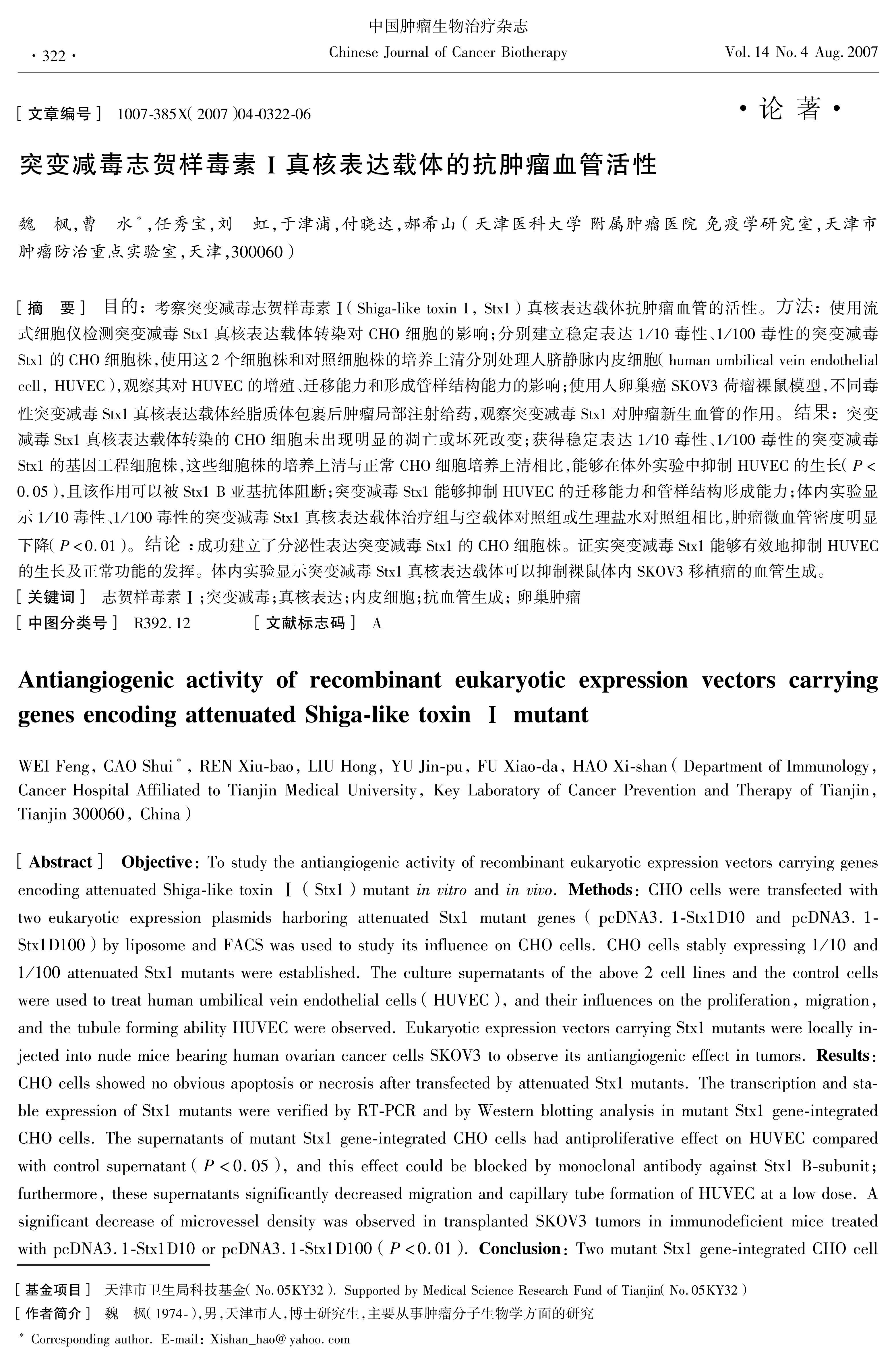 考察突变减毒志贺样毒素Ⅰ(Shiga-like toxin 1,Stx1)真核表达载体抗肿瘤血管的活性。方法:使用流式细胞仪检测突变减毒Stx1真核表达载体转染对CHO细胞的影响;分别建立稳定表达1/10毒性、1/100毒性的突变减毒Stx1的CHO细胞株,使用这2个细胞株和对照细胞株的培养上清分别处理人脐静脉内皮细胞(human umbilical vein endothelial cell,HUVEC),观察其对HUVEC的增殖、迁移能力和形成管样结构能力的影响;使用人卵巢癌SKOV3荷瘤裸鼠模型,不同毒性突变减毒Stx1真核表达载体经脂质体包裹后肿瘤局部注射给药,观察突变减毒Stx1对肿瘤新生血管的作用。结果:突变减毒Stx1真核表达载体转染的CHO细胞未出现明显的凋亡或坏死改变;获得稳定表达1/10毒性、1/100毒性的突变减毒Stx1的基因工程细胞株,这些细胞株的培养上清与正常CHO细胞培养上清相比,能够在体外实验中抑制HUVEC的生长(P<0.05),且该作用可以被Stx1B亚基抗体阻断;突变减毒Stx1能够抑制HUVEC的迁移能力和管样结构形成能力;体内实验显示1/10毒性、1/100毒性的突变减毒Stx1真核表达载体治疗组与空载体对照组或生理盐水对照组相比,肿瘤微血管密度明显下降(P<0.01)。结论:成功建立了分泌性表达突变减毒Stx1的CHO细胞株。证实突变减毒Stx1能够有效地抑制HUVEC的生长及正常功能的发挥。体内实验显示突变减毒Stx1真核表达载体可以抑制裸鼠体内SKOV3移植瘤的血管生成。