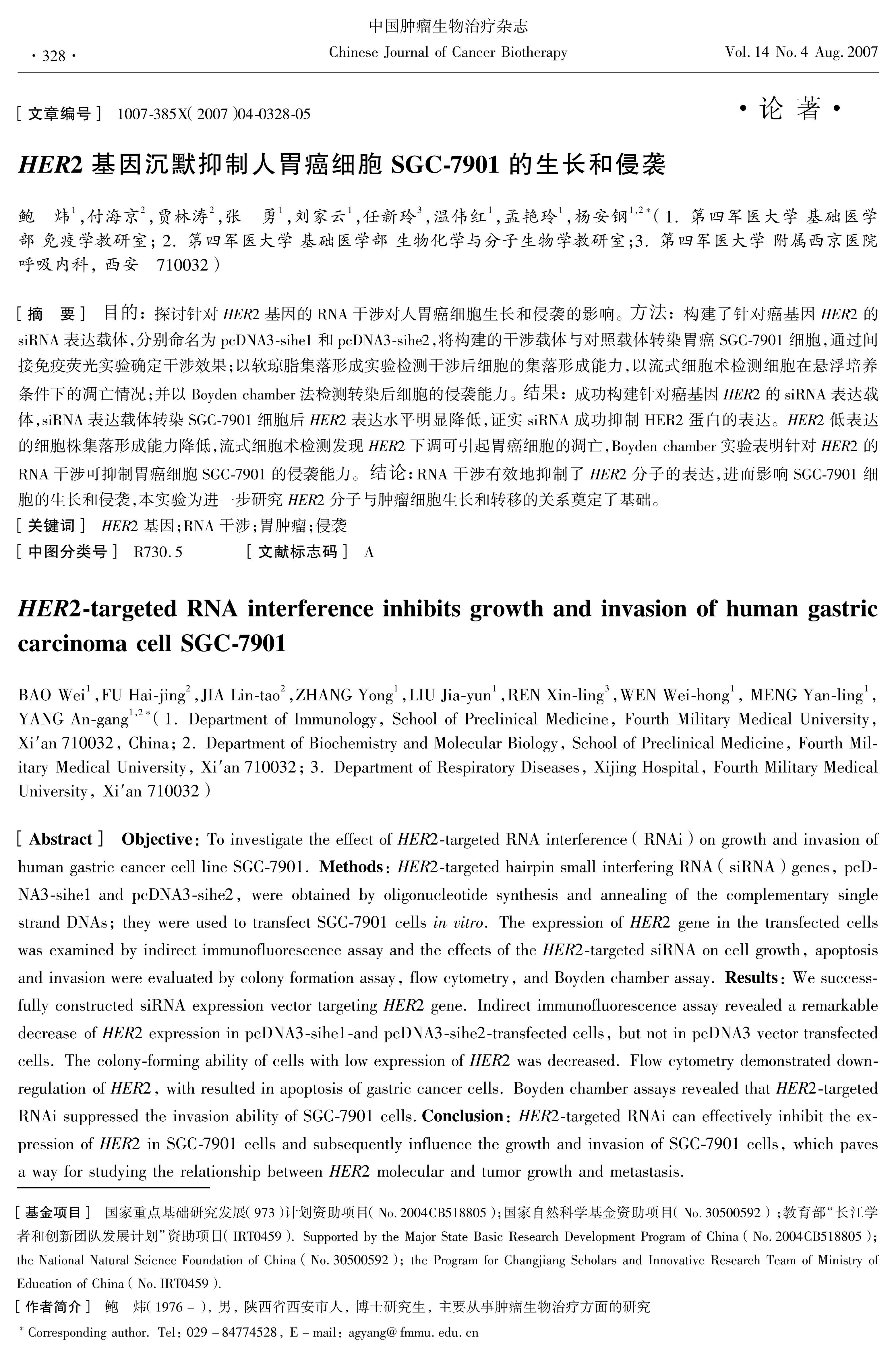 探讨针对HER2基因的RNA干涉对人胃癌细胞生长和侵袭的影响。方法:构建了针对癌基因HER2的siRNA表达载体,分别命名为pcDNA3-sihe1和pcDNA3-sihe2,将构建的干涉载体与对照载体转染胃癌SGC-7901细胞,通过间接免疫荧光实验确定干涉效果;以软琼脂集落形成实验检测干涉后细胞的集落形成能力,以流式细胞术检测细胞在悬浮培养条件下的凋亡情况;并以Boyden chamber法检测转染后细胞的侵袭能力。结果:成功构建针对癌基因HER2的siRNA表达载体,siRNA表达载体转染SGC-7901细胞后HER2表达水平明显降低,证实siRNA成功抑制HER2蛋白的表达。HER2低表达的细胞株集落形成能力降低,流式细胞术检测发现HER2下调可引起胃癌细胞的凋亡,Boydenchamber实验表明针对HER2的RNA干涉可抑制胃癌细胞SGC-7901的侵袭能力。结论:RNA干涉有效地抑制了HER2分子的表达,进而影响SGC-7901细胞的生长和侵袭,本实验为进一步研究HER2分子与肿瘤细胞生长和转移的关系奠定了基础。