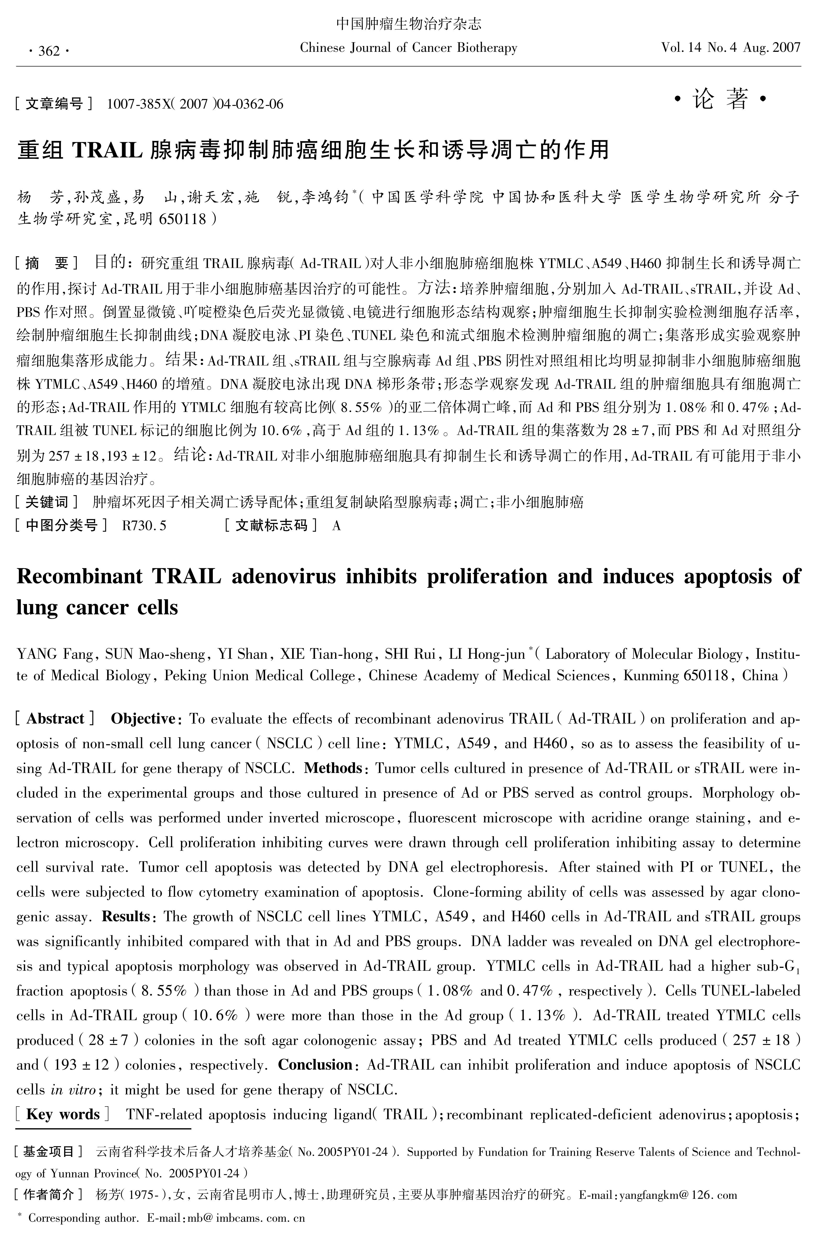 研究重组TRAIL腺病毒(Ad-TRAIL)对人非小细胞肺癌细胞株YTMLC、A549、H460抑制生长和诱导凋亡的作用,探讨Ad-TRAIL用于非小细胞肺癌基因治疗的可能性。方法:培养肿瘤细胞,分别加入Ad-TRAIL、sTRAIL,并设Ad、PBS作对照。倒置显微镜、吖啶橙染色后荧光显微镜、电镜进行细胞形态结构观察;肿瘤细胞生长抑制实验检测细胞存活率,绘制肿瘤细胞生长抑制曲线;DNA凝胶电泳、PI染色、TUNEL染色和流式细胞术检测肿瘤细胞的凋亡;集落形成实验观察肿瘤细胞集落形成能力。结果:Ad-TRAIL组、sTRAIL组与空腺病毒Ad组、PBS阴性对照组相比均明显抑制非小细胞肺癌细胞株YTMLC、A549、H460的增殖。DNA凝胶电泳出现DNA梯形条带;形态学观察发现Ad-TRAIL组的肿瘤细胞具有细胞凋亡的形态;Ad-TRAIL作用的YTMLC细胞有较高比例(8.55%)的亚二倍体凋亡峰,而Ad和PBS组分别为1.08%和0.47%;Ad-TRAIL组被TUNEL标记的细胞比例为10.6%,高于Ad组的1.13%。Ad-TRAIL组的集落数为28±7,而PBS和Ad对照组分别为257±18,193±12。结论:Ad-TRAIL对非小细胞肺癌细胞具有抑制生长和诱导凋亡的作用,Ad-TRAIL有可能用于非小细胞肺癌的基因治疗。