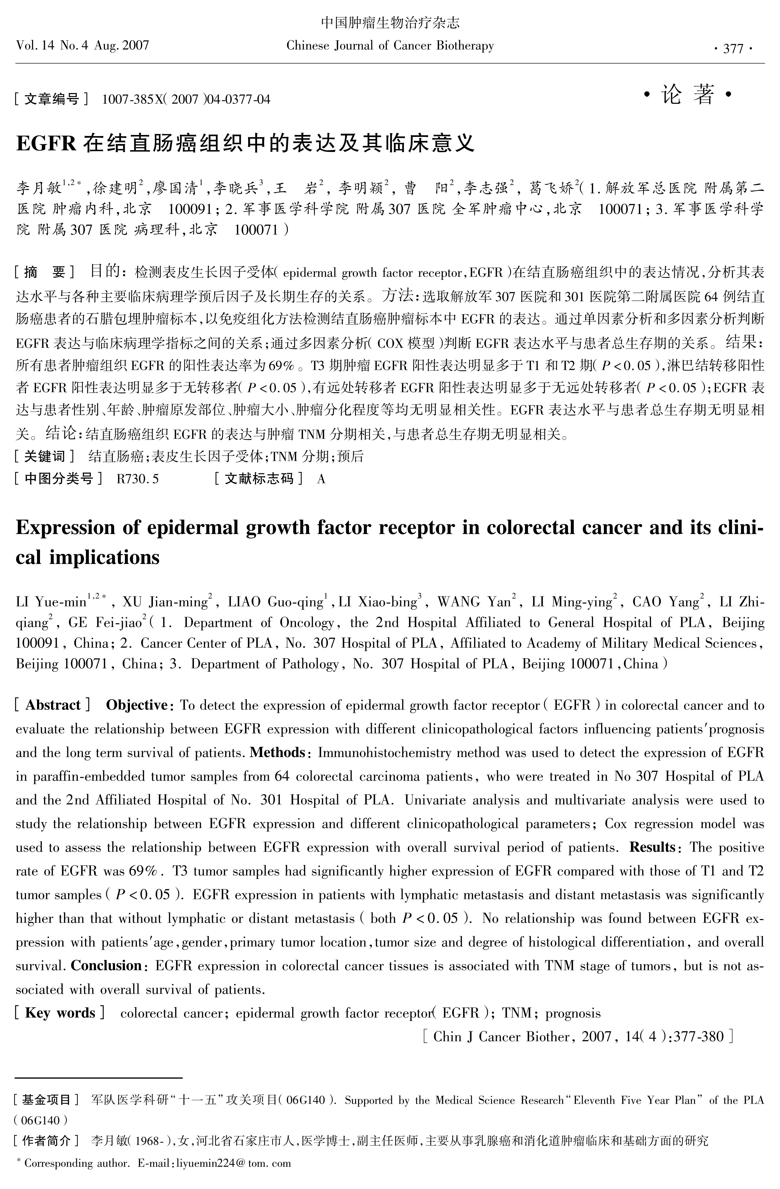 检测表皮生长因子受体(epidermal growth factor receptor,EGFR)在结直肠癌组织中的表达情况,分析其表达水平与各种主要临床病理学预后因子及长期生存的关系。方法:选取解放军307医院和301医院第二附属医院64例结直肠癌患者的石腊包埋肿瘤标本,以免疫组化方法检测结直肠癌肿瘤标本中EGFR的表达。通过单因素分析和多因素分析判断EGFR表达与临床病理学指标之间的关系;通过多因素分析(COX模型)判断EGFR表达水平与患者总生存期的关系。结果:所有患者肿瘤组织EGFR的阳性表达率为69%。T3期肿瘤EGFR阳性表达明显多于T1和T2期(P<0.05),淋巴结转移阳性者EGFR阳性表达明显多于无转移者(P<0.05),有远处转移者EGFR阳性表达明显多于无远处转移者(P<0.05);EGFR表达与患者性别、年龄、肿瘤原发部位、肿瘤大小、肿瘤分化程度等均无明显相关性。EGFR表达水平与患者总生存期无明显相关。结论:结直肠癌组织EGFR的表达与肿瘤TNM分期相关,与患者总生存期无明显相关。