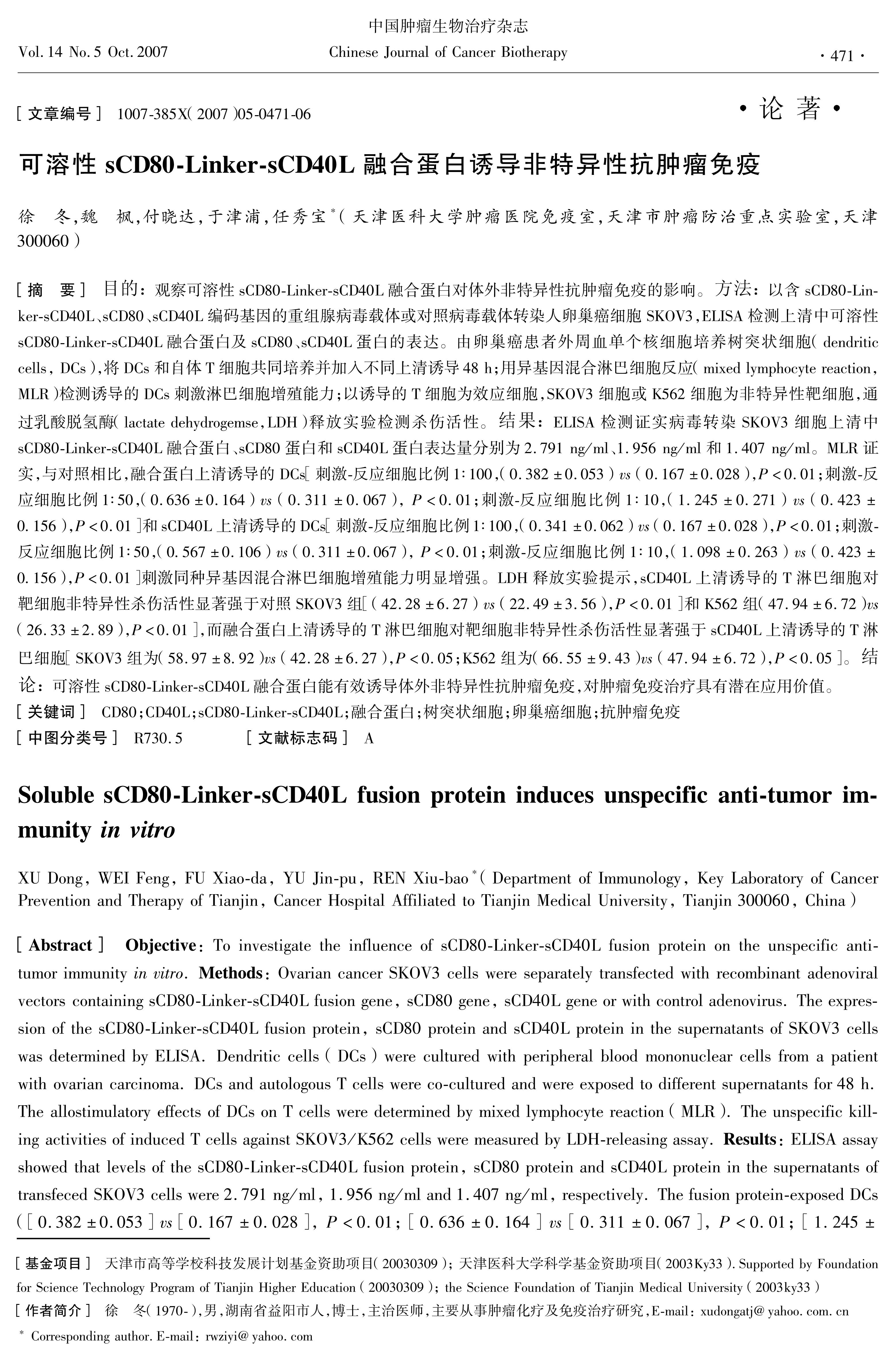 观察可溶性sCD80-Linker-sCD40L融合蛋白对体外非特异性抗肿瘤免疫的影响。方法:以含sCD80-Lin- ker-sCD40L、sCD80、sCD40L编码基因的重组腺病毒载体或对照病毒载体转染人卵巢癌细胞SKOV3,ELISA检测上清中可溶性sCD80-Linker-sCD40L融合蛋白及sCD80、sCD40L蛋白的表达。由卵巢癌患者外周血单个核细胞培养树突状细胞(dendritic cells,DCs),将DCs和自体T细胞共同培养并加入不同上清诱导48h;用异基因混合淋巴细胞反应(mixed lymphocyte reaction,MLR)检测诱导的DCs刺激淋巴细胞增殖能力;以诱导的T细胞为效应细胞,SKOV3细胞或K562细胞为非特异性靶细胞,通过乳酸脱氢酶(lactate dehydrogemse,LDH)释放实验检测杀伤活性。结果:ELISA检测证实病毒转染SKOV3细胞上清中sCD80-Linker-sCD40L融合蛋白、sCD80蛋白和sCD40L蛋白表达量分别为2.791 ng/ml、1.956 ng/ml和1.407 ng/ml。MLR证实,与对照相比,融合蛋白上清诱导的DCs[刺激-反应细胞比例1:100,(0.382±0.053)vs(0.167±0.028),P<0.01;刺激-反应细胞比例1:50,(0.636±0.164)vs(0.311±0.067),P<0.01;刺激-反应细胞比例1:10,(1.245±0.271)vs(0.423±0.156),P<0.01]和sCD40L上清诱导的DCs[刺激-反应细胞比例1:100,(0.341±0.062)vs(0.167±0.028),P<0.01;刺激-反应细胞比例1:50,(0.567±0.106)vs(0.311±0.067),P<0.01;刺激-反应细胞比例1:10,(1.098±0.263)vs(0.423±0.156),P<0.01]刺激同种异基因混合淋巴细胞增殖能力明显增强。LDH释放实验提示,sCD40L上清诱导的T淋巴细胞对靶细胞非特异性杀伤活性显著强于对照SKOV3组[(42.28±6.27)vs(22.49±3.56),P<0.01]和K562组(47.94±6.72)vs (26.33±2.89),P<0.01],而融合蛋白上清诱导的T淋巴细胞对靶细胞非特异性杀伤活性显著强于sCD40L上清诱导的T淋巴细胞[sKOV3组为(58.97±8.92)vs(42.28±6.27),P<0.05;K562组为(66.55±9.43)vs(47.94±6.72),P<0.05]。结论:可溶性sCD80-Linker-sCD40L融合蛋白能有效诱导体外非特异性抗肿瘤免疫,对肿瘤免疫治疗具有潜在应用价值。