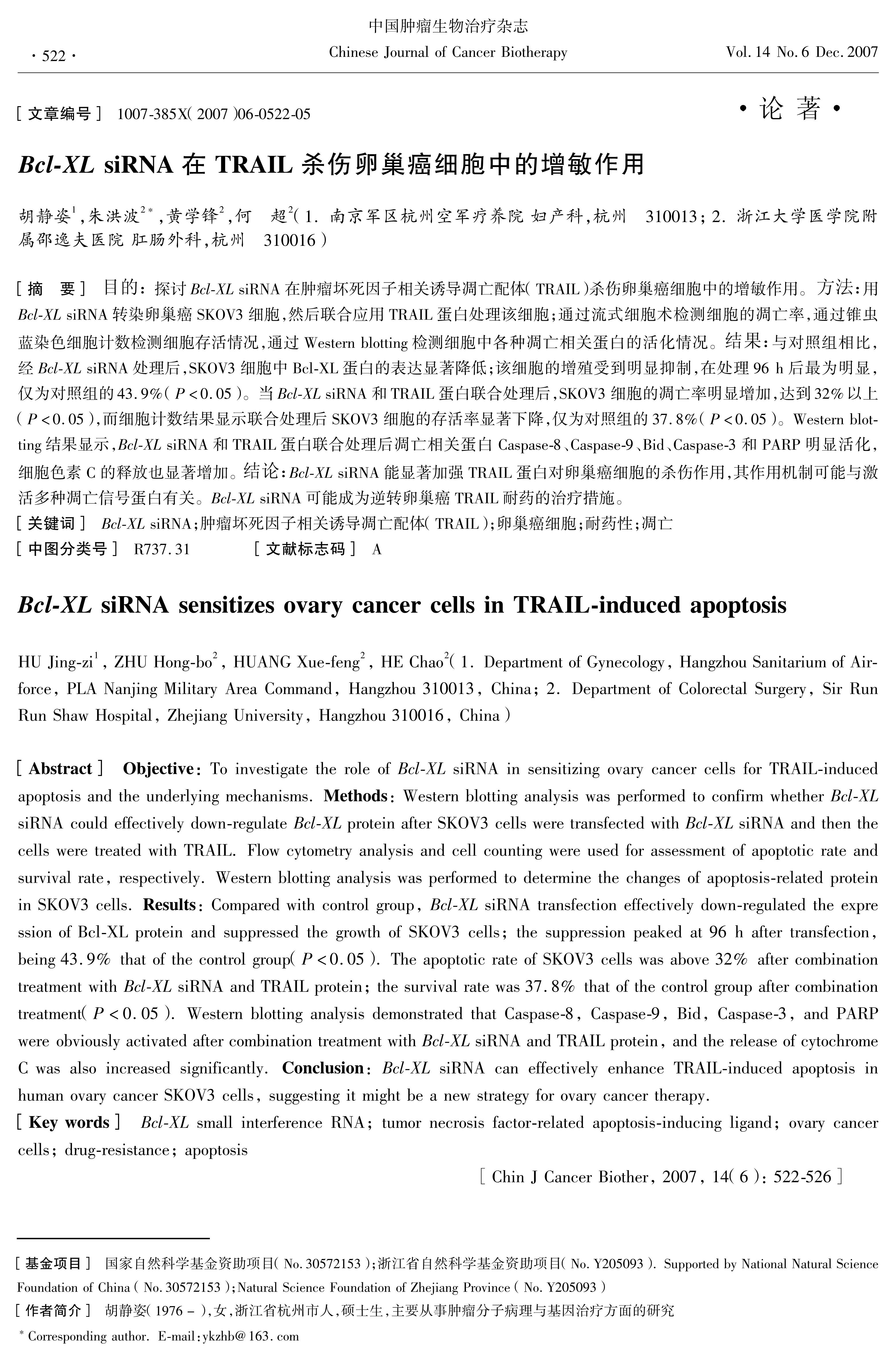 探讨Bcl-XL siRNA在肿瘤坏死因子相关诱导凋亡配体(TRAIL)杀伤卵巢癌细胞中的增敏作用。方法:用Bcl-XL siRNA转染卵巢癌SKOV3细胞,然后联合应用TRAIL蛋白处理该细胞;通过流式细胞术检测细胞的凋亡率,通过锥虫蓝染色细胞计数检测细胞存活情况,通过Western blotting检测细胞中各种凋亡相关蛋白的活化情况。结果:与对照组相比,经Bcl-XL siRNA处理后,SKOV3细胞中Bcl-XL蛋白的表达显著降低;该细胞的增殖受到明显抑制,在处理96 h后最为明显,仅为对照组的43.9%(P<0.05)。当Bcl-XL siRNA和TRAIL蛋白联合处理后,SKOV3细胞的凋亡率明显增加,达到32%以上(P<0.05),而细胞计数结果显示联合处理后SKOV3细胞的存活率显著下降,仅为对照组的37.8%(P<0.05)。Western blotting结果显示,Bcl-XL siRNA和TRAIL蛋白联合处理后凋亡相关蛋白Caspase-8、Caspase-9、Bid、Caspase-3和PARP明显活化,细胞色素C的释放也显著增加。结论:Bcl-XL siRNA能显著加强TRAIL蛋白对卵巢癌细胞的杀伤作用,其作用机制可能与激活多种凋亡信号蛋白有关。Bcl-XL siRNA可能成为逆转卵巢癌TRAIL耐药的治疗措施。