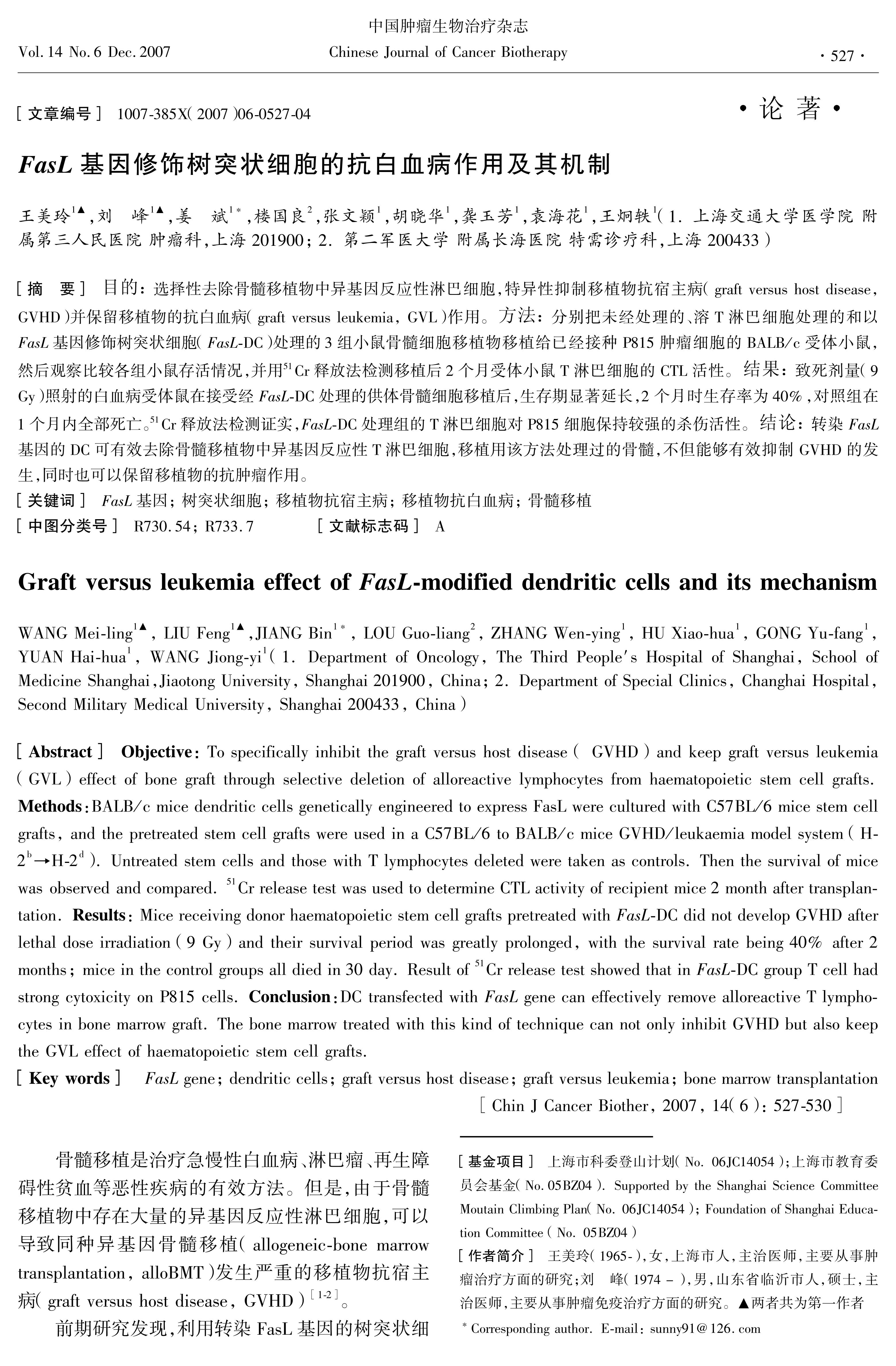 选择性去除骨髓移植物中异基因反应性淋巴细胞,特异性抑制移植物抗宿主病(graft versus host disease,GVHD)并保留移植物的抗白血病(graft versus leukemia,GVL)作用。方法:分别把未经处理的、溶T淋巴细胞处理的和以FasL基因修饰树突状细胞(FasL-DC)处理的3组小鼠骨髓细胞移植物移植给已经接种P815肿瘤细胞的BALB/c受体小鼠,然后观察比较各组小鼠存活情况,并用51Cr释放法检测移植后2个月受体小鼠T淋巴细胞的CTL活性。结果:致死剂量(9Gy)照射的白血病受体鼠在接受经FasL-DC处理的供体骨髓细胞移植后,生存期显著延长,2个月时生存率为40%,对照组在1个月内全部死亡。51Cr释放法检测证实,FasL-DC处理组的T淋巴细胞对P815细胞保持较强的杀伤活性。结论:转染FasL基因的DC可有效去除骨髓移植物中异基因反应性T淋巴细胞,移植用该方法处理过的骨髓,不但能够有效抑制GVHD的发生,同时也可以保留移植物的抗肿瘤作用。