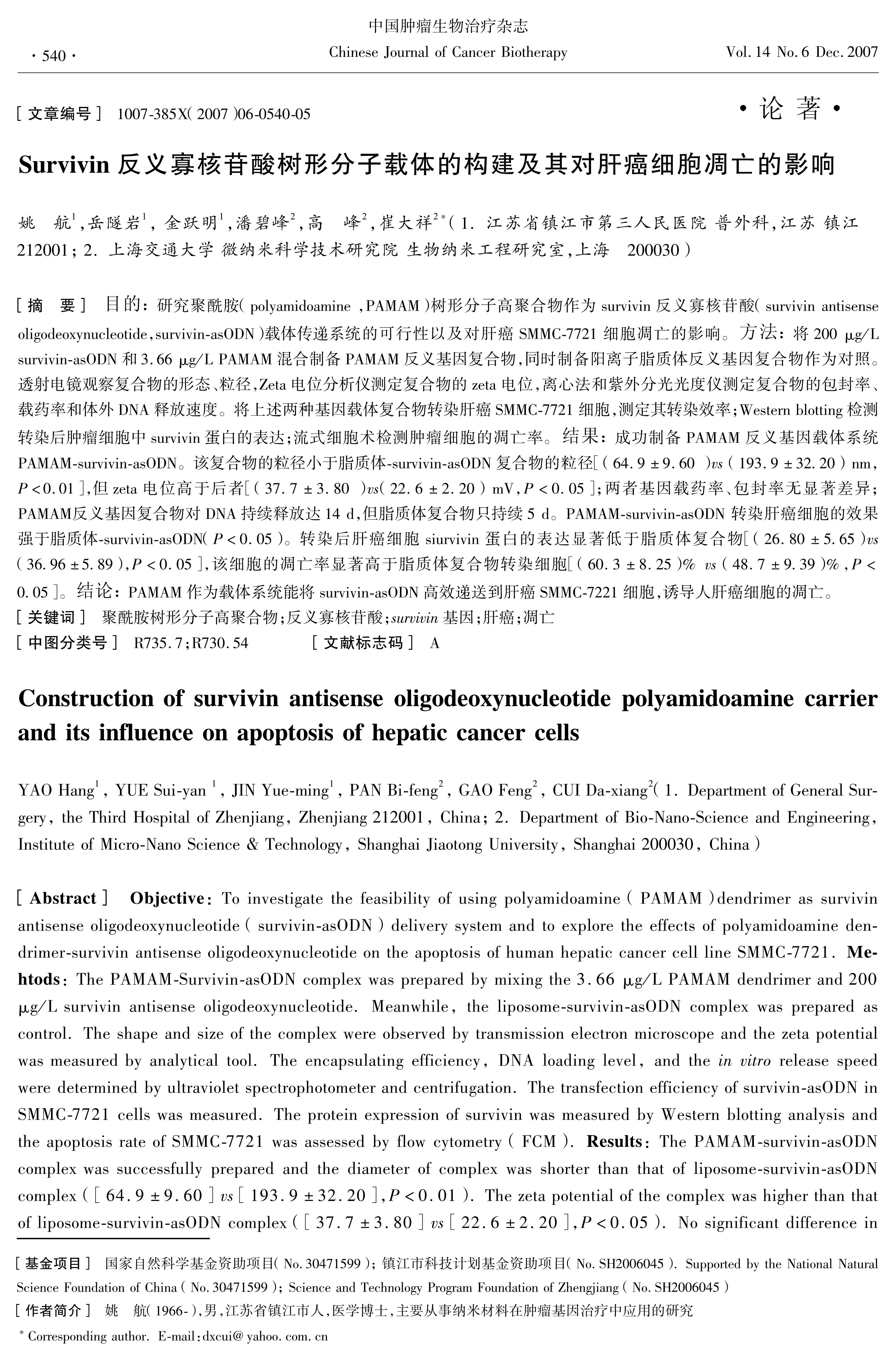 研究聚酰胺(polyamidoamine,PAMAM)树形分子高聚合物作为survivin反义寡核苷酸(survivin antisense oligodeoxynucleotide,survivin-asODN)载体传递系统的可行性以及对肝癌SMMC-7721细胞凋亡的影响。方法:将200μg/Lsurvivin-asODN和3.66μg/L PAMAM混合制备PAMAM反义基因复合物,同时制备阳离子脂质体反义基因复合物作为对照。透射电镜观察复合物的形态、粒径,Zeta电位分析仪测定复合物的zeta电位,离心法和紫外分光光度仪测定复合物的包封率、载药率和体外DNA释放速度。将上述两种基因载体复合物转染肝癌SMMC-7721细胞,测定其转染效率;Western blotting检测转染后肿瘤细胞中survivin蛋白的表达;流式细胞术检测肿瘤细胞的凋亡率。结果:成功制备PAMAM反义基因载体系统PAMAM-survivin-asODN。该复合物的粒径小于脂质体-survivin-asODN复合物的粒径[(64.9±9.60)vs(193.9±32.20)nm,P<0.01],但zeta电位高于后者[(37.7±3.80)vs(22.6±2.20)mV,P<0.05];两者基因载药率、包封率无显著差异;PAMAM反义基因复合物对DNA持续释放达14 d,但脂质体复合物只持续5 d。PAMAM-survivin-asODN转染肝癌细胞的效果强于脂质体-survivin-asODN(P<0.05)。转染后肝癌细胞siurvivin蛋白的表达显著低于脂质体复合物[(26.80±5.65)vs(36.96±5.89),P<0.05],该细胞的凋亡率显著高于脂质体复合物转染细胞[(60.3±8.25)%vs(48.7±9.39)%,P<0.05]。结论:PAMAM作为载体系统能将survivin-asODN高效递送到肝癌SMMC-7221细胞,诱导人肝癌细胞的凋亡。