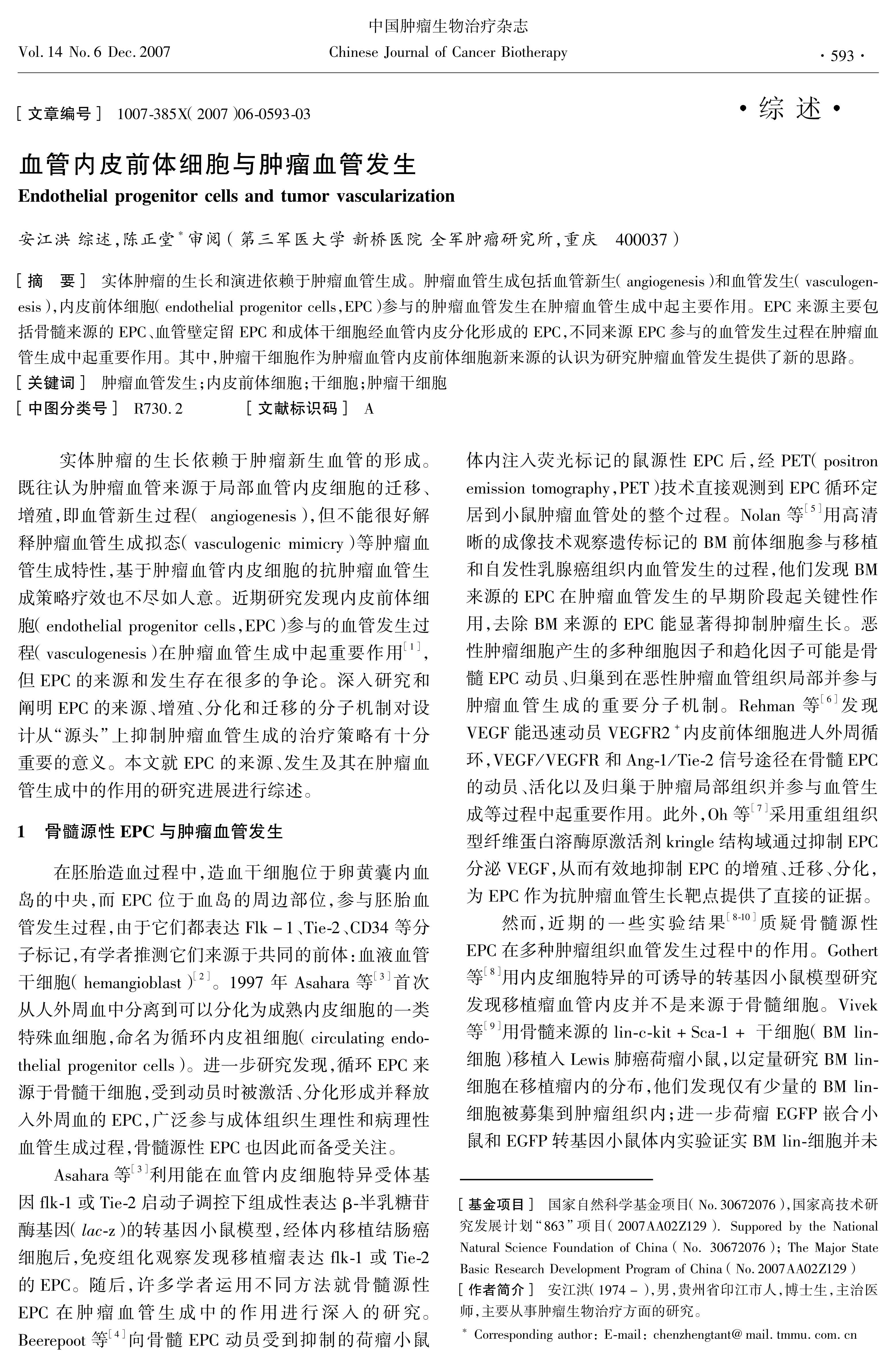 实体肿瘤的生长和演进依赖于肿瘤血管生成。肿瘤血管生成包括血管新生(angiogenesis)和血管发生(vasculogenesis),内皮前体细胞(endothelial progenitor cells,EPC)参与的肿瘤血管发生在肿瘤血管生成中起主要作用。EPC来源主要包括骨髓来源的EPC、血管壁定留EPC和成体干细胞经血管内皮分化形成的EPC,不同来源EPC参与的血管发生过程在肿瘤血管生成中起重要作用。其中,肿瘤干细胞作为肿瘤血管内皮前体细胞新来源的认识为研究肿瘤血管发生提供了新的思路。