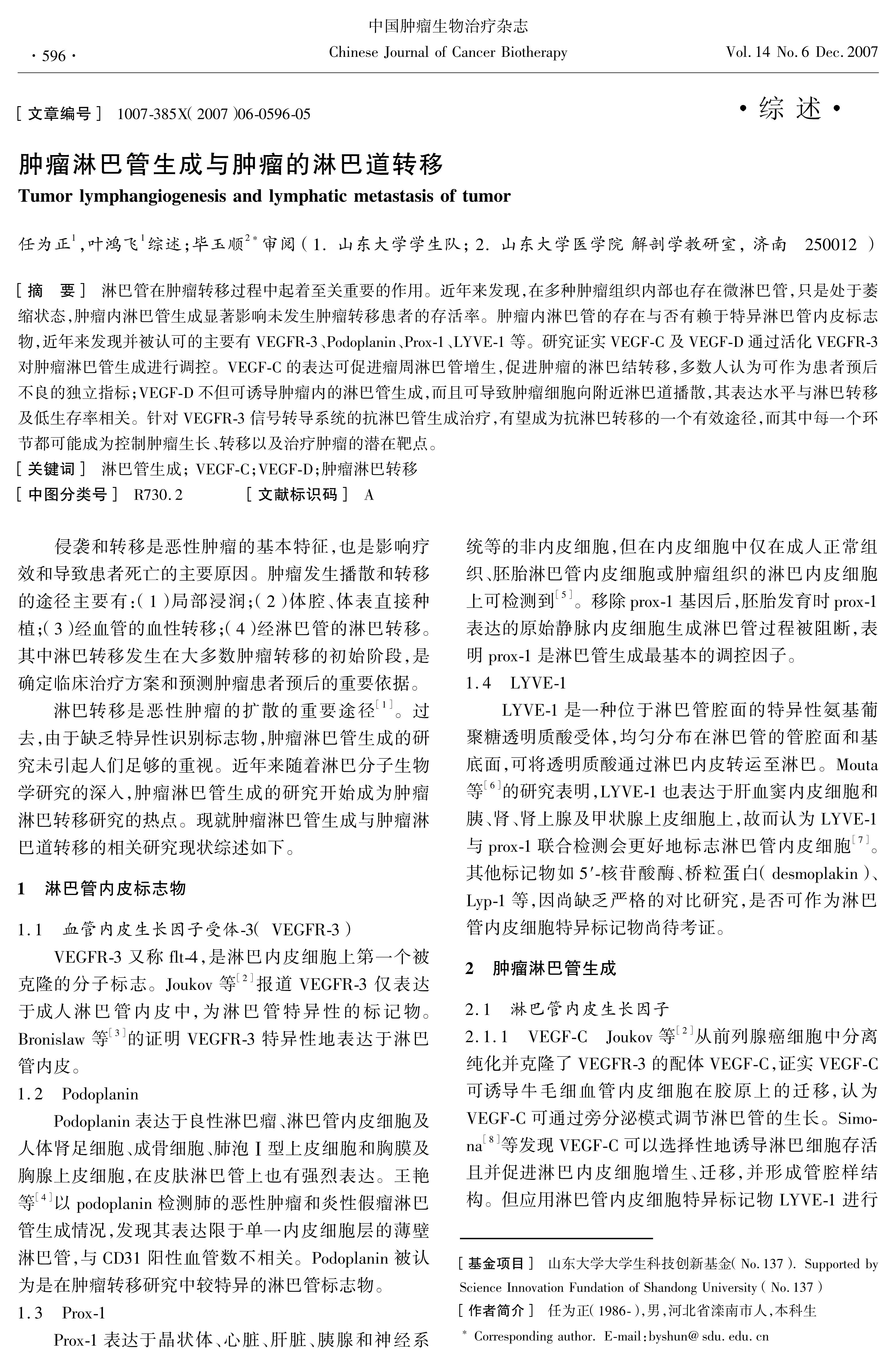 淋巴管在肿瘤转移过程中起着至关重要的作用。近年来发现,在多种肿瘤组织内部也存在微淋巴管,只是处于萎缩状态,肿瘤内淋巴管生成显著影响未发生肿瘤转移患者的存活率。肿瘤内淋巴管的存在与否有赖于特异淋巴管内皮标志物,近年来发现并被认可的主要有VEGFR-3、Podoplanin、Prox-1、LYVE-1等。研究证实VEGF-C及VEGF-D通过活化VEGFR-3对肿瘤淋巴管生成进行调控。VEGF-C的表达可促进瘤周淋巴管增生,促进肿瘤的淋巴结转移,多数人认为可作为患者预后不良的独立指标;VEGF-D不但可诱导肿瘤内的淋巴管生成,而且可导致肿瘤细胞向附近淋巴道播散,其表达水平与淋巴转移及低生存率相关。针对VEGFR-3信号转导系统的抗淋巴管生成治疗,有望成为抗淋巴转移的一个有效途径,而其中每一个环节都可能成为控制肿瘤生长、转移以及治疗肿瘤的潜在靶点。