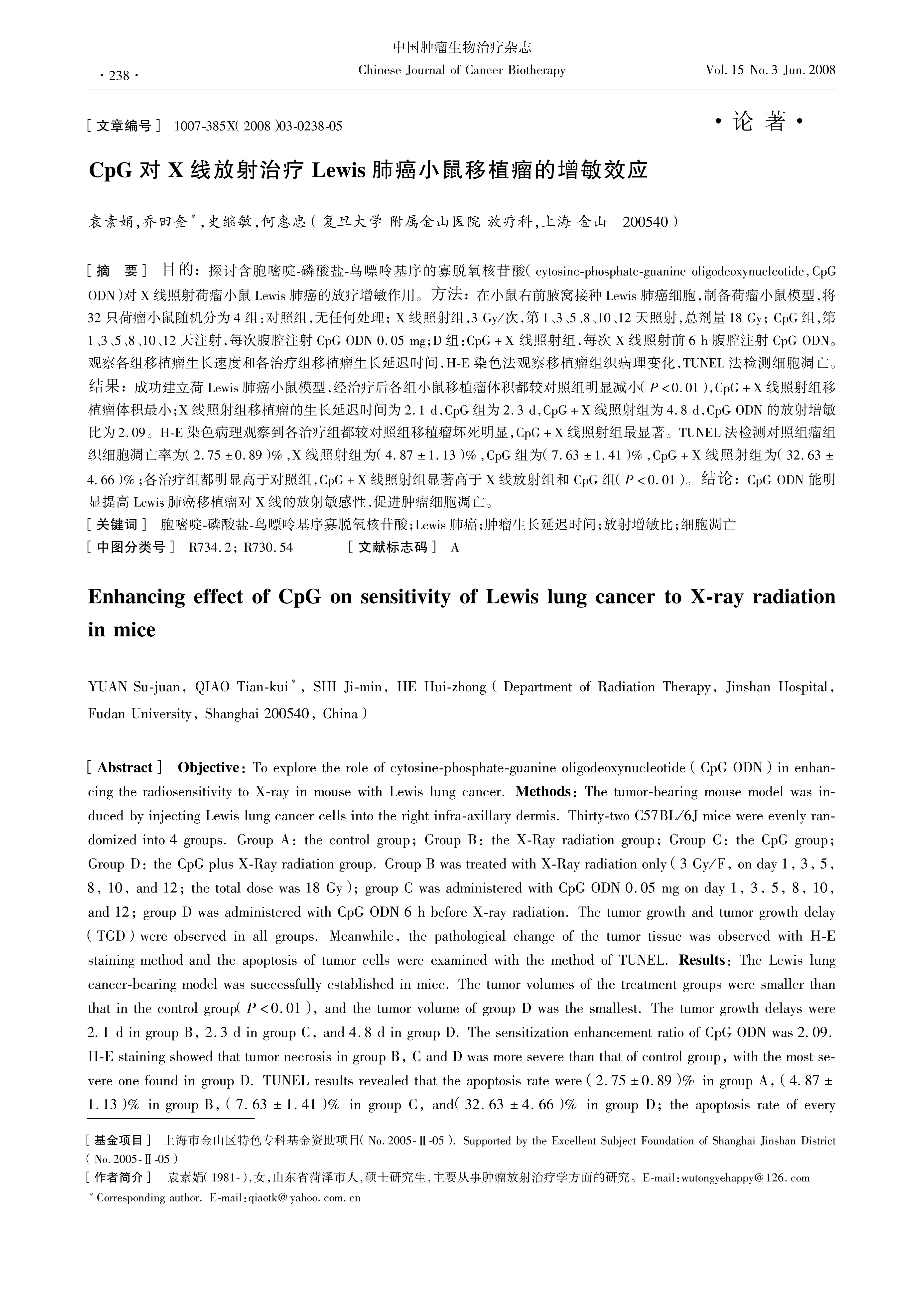 目的:探讨含胞嘧啶-磷酸盐-鸟嘌呤基序的寡脱氧核苷酸(cytosine-phosphate-guanine oligodeoxynucleotide,CpG ODN)对X线照射荷瘤小鼠Lewis肺癌的放疗增敏作用。方法:在小鼠右前腋窝接种Lewis肺癌细胞,制备荷瘤小鼠模型,将32只荷瘤小鼠随机分为4组:对照组,无任何处理;X线照射组,3 Gy/次,第1、3、5、8、10、12天照射,总剂量18Gy;CpG组,第1、3、5、8、10、12天注射,每次腹腔注射CpG ODN 0.05 mg;D组:CpG+X线照射组,每次X线照射前6 h腹腔注射CpG ODN观察各组移植瘤生长速度和各治疗组移植瘤生长延迟时间,H-E染色法观察移植瘤组织病理变化,TUNEL法检测细胞凋亡结果:成功建立荷Lewis肺癌小鼠模型,经治疗后各组小鼠移植瘤体积都较对照组明显减小(P<0.01),CpG+X线照射组移植瘤体积最小;X线照射组移植瘤的生长延迟时间为2.1 d,CpG组为2.3 d,CpG+X线照射组为4.8 d,CpG ODN的放射增敏比为2.09。H-E染色病理观察到各治疗组都较对照组移植瘤坏死明显,CpG+X线照射组最显著TUNEL法检测对照组瘤组织细胞凋亡率为(2.75±0.89)%,X线照射组为(4.87±1.13)%,CpG组为(7.63±1.41)%,CpG+X线照射组为(32.63±4.66)%;各治疗组都明显高于对照组,CpG+X线照射组显著高于X线放射组和CpG组(P<0.01)。结论:CpG OND能明显提高Lewis肺癌移植瘤对X线的放射敏感性,促进肿瘤细胞凋亡。