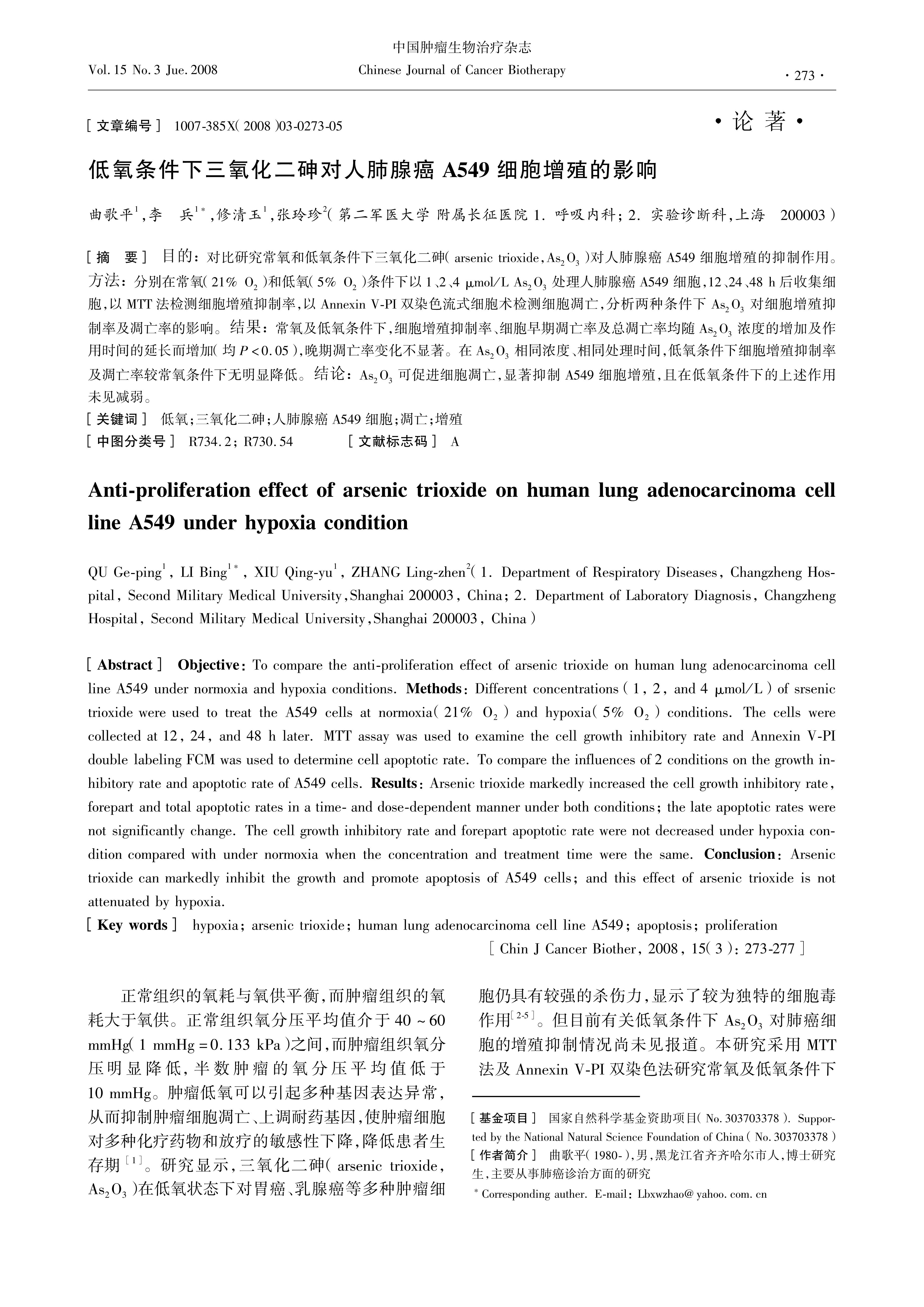 目的:对比研究常氧和低氧条件下三氧化二砷(arsenic trioxide,As2O3)对人肺腺癌A549细胞增殖的抑制作用。方法:分别在常氧(21%O2)和低氧(5%O2)条件下以1、2、4μmol/L As2O3处理人肺腺癌A549细胞,12、24、48 h后收集细胞,以MTT法检测细胞增殖抑制率,以Annexin V-PI双染色流式细胞术检测细胞凋亡,分析两种条件下As2O3对细胞增殖抑制率及凋亡率的影响。结果:常氧及低氧条件下,细胞增殖抑制率、细胞早期凋亡率及总凋亡率均随As2O3浓度的增加及作用时间的延长而增加(均P<0.05),晚期凋亡率变化不显著。在As2O3相同浓度、相同处理时间,低氧条件下细胞增殖抑制率及凋亡率较常氧条件下无明显降低。结论:As2O3可促进细胞凋亡,显著抑制A549细胞增殖,且在低氧条件下的上述作用未见减弱。
