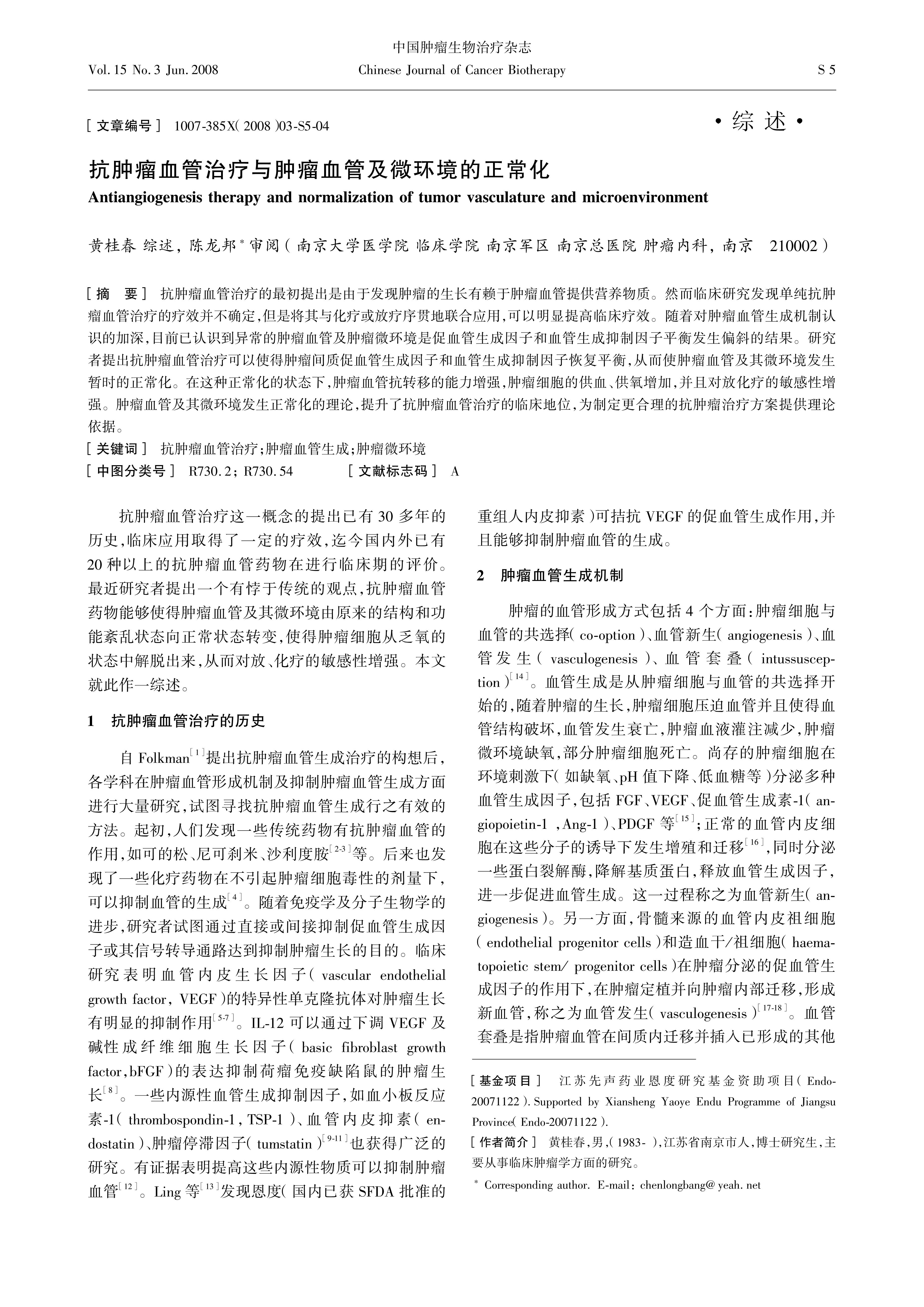 抗肿瘤血管治疗的最初提出是由于发现肿瘤的生长有赖于肿瘤血管提供营养物质,然而临床研究发现单纯抗肿瘤血管治疗的疗效并不确定,但是将其与化疗或放疗序贯地联合应用,可以明显提高临床疗效。随着对肿瘤血管生成机制认识的加深,目前已认识到异常的肿瘤血管及肿瘤微环境是促血管生成因子和血管生成抑制因子平衡发生偏斜的结果。研究者提出抗肿瘤血管治疗可以使得肿瘤间质促血管生成因子和血管生成抑制因子恢复平衡,从而使肿瘤血管及其微环境发生暂时的正常化。在这种正常化的状态下,肿瘤血管抗转移的能力增强,肿瘤细胞的供血、供氧增加,并且对放化疗的敏感性增强。肿瘤血管及其微环境发生正常化的理论,提升了抗肿瘤血管治疗的临床地位,为制定更合理的抗肿瘤治疗方案提供理论依据。