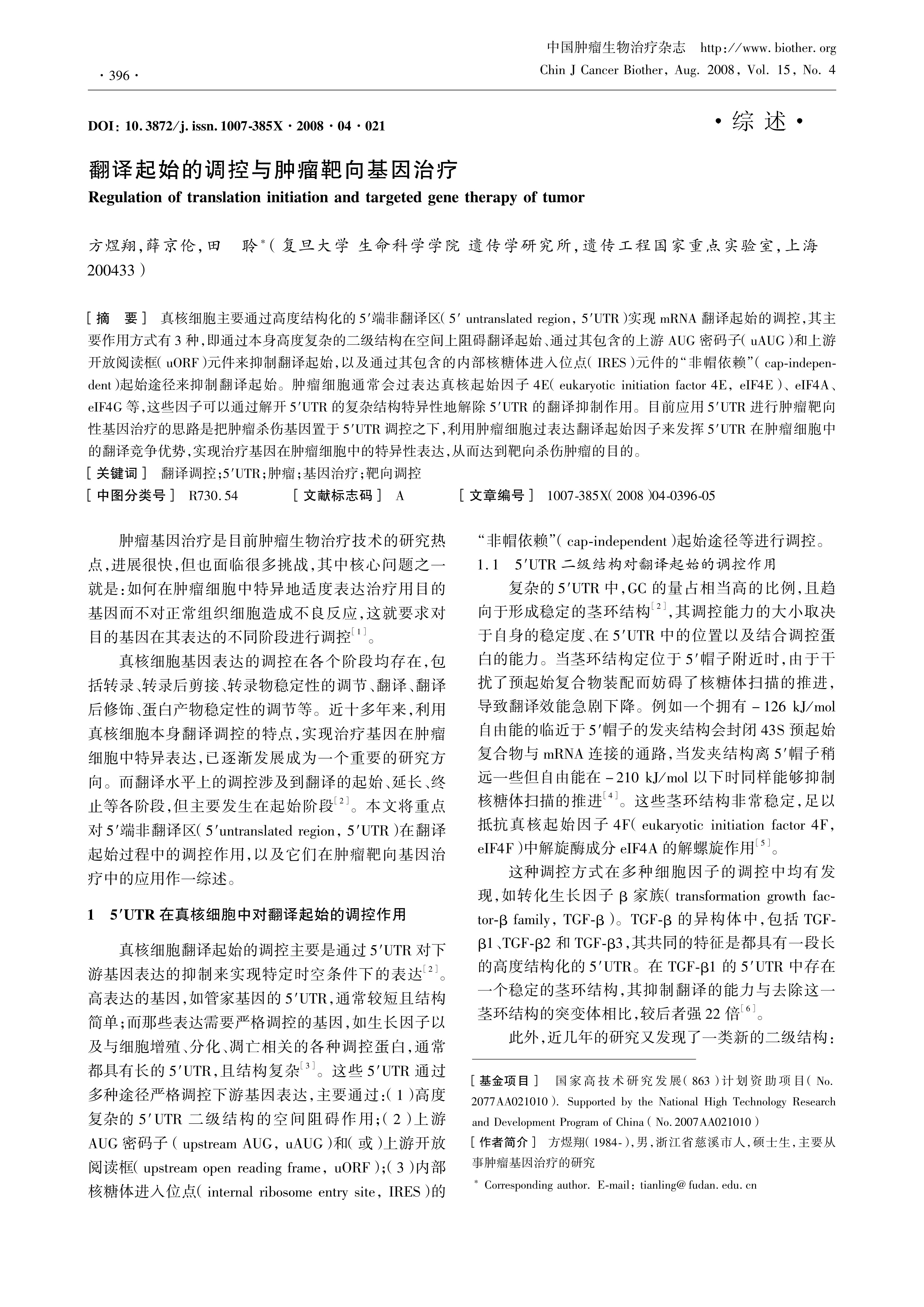 摘 要 真核细胞主要通过高度结构化的5′端非翻译区(5′ untranslated region, 5′UTR)实现mRNA翻译起始的调控,其主要作用方式有3种,即通过本身高度复杂的二级结构在空间上阻碍翻译起始、通过其包含的上游AUG密码子(uAUG)和上游开放阅读框(uORF)元件来抑制翻译起始,以及通过其包含的内部核糖体进入位点(IRES)元件的“非帽依赖”(cap-indepen-dent)起始途径来抑制翻译起始。肿瘤细胞通常会过表达真核起始因子4E(eukaryotic initiation factor 4E, eIF4E)、 eIF4A、eIF4G等,这些因子可以通过解开5′UTR的复杂结构特异性地解除5′UTR的翻译抑制作用。目前应用5′UTR进行肿瘤靶向性基因治疗的思路是把肿瘤杀伤基因置于5′UTR调控之下,利用肿瘤细胞过表达翻译起始因子来发挥5′UTR在肿瘤细胞中的翻译竞争优势,实现治疗基因在肿瘤细胞中的特异性表达,从而达到靶向杀伤肿瘤的目的。