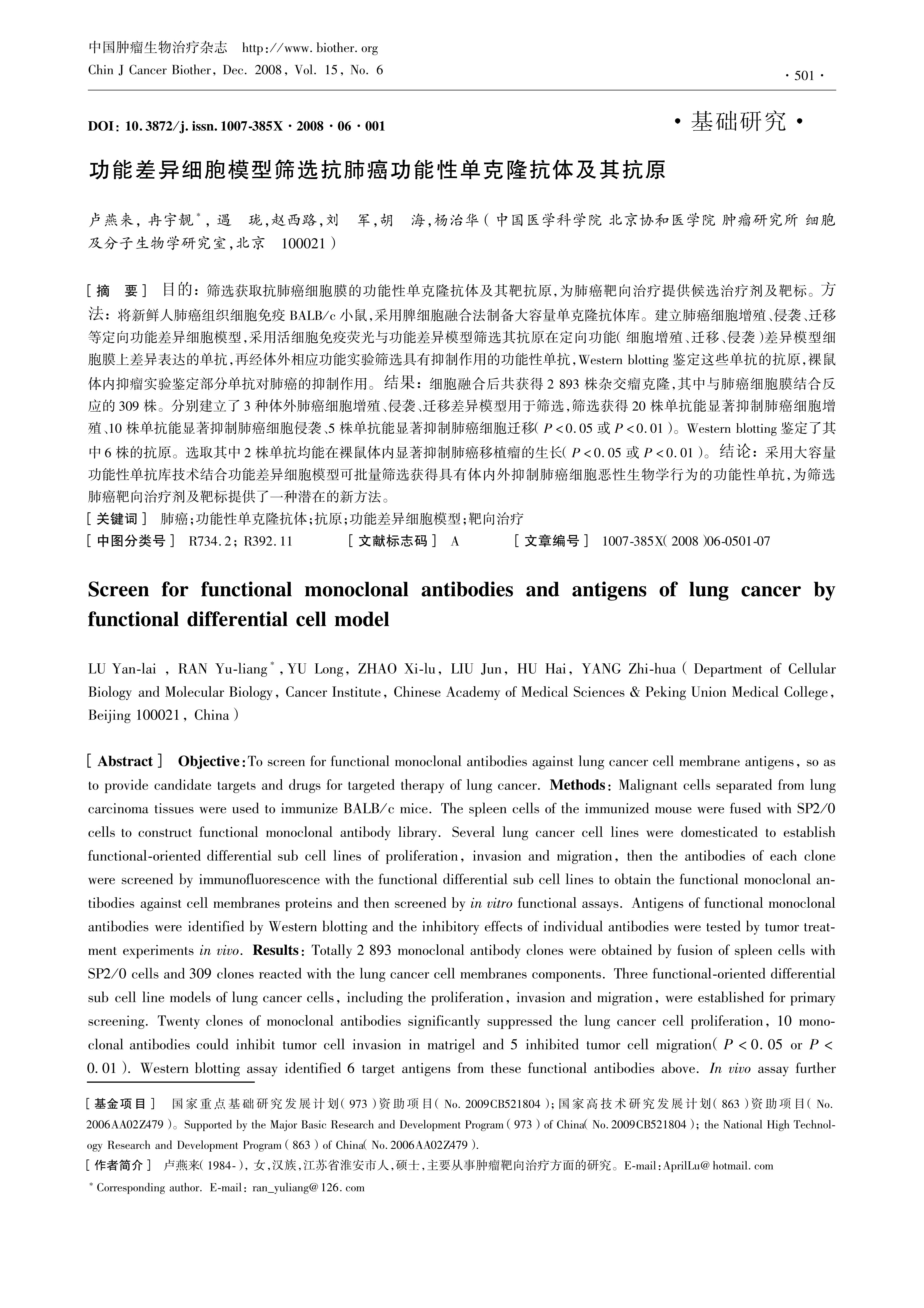 目的:筛选获取抗肺癌细胞膜的功能性单克隆抗体及其靶抗原,为肺癌靶向治疗提供候选治疗剂及靶标。方法: 将新鲜人肺癌组织细胞免疫BALB/c小鼠,采用脾细胞融合法制备大容量单克隆抗体库。建立肺癌细胞增殖、侵袭、迁移等定向功能差异细胞模型,采用活细胞免疫荧光与功能差异模型筛选其抗原在定向功能(细胞增殖、迁移、侵袭)差异模型细胞膜上差异表达的单抗,再经体外相应功能实验筛选具有抑制作用的功能性单抗,Western blotting鉴定这些单抗的抗原,裸鼠体内抑瘤实验鉴定部分单抗对肺癌的抑制作用。结果: 细胞融合后共获得2 893株杂交瘤克隆,其中与肺癌细胞膜结合反应的309株。分别建立了3种体外肺癌细胞增殖、侵袭、迁移差异模型用于筛选,筛选获得20株单抗能显著抑制肺癌细胞增殖、10株单抗能显著抑制肺癌细胞侵袭、5株单抗能显著抑制肺癌细胞迁移(P<0.05或P<0.01)。Western blotting鉴定了其中6株的抗原。选取其中2株单抗均能在裸鼠体内显著抑制肺癌移植瘤的生长(P<0.05或P<0.01)。结论: 采用大容量功能性单抗库技术结合功能差异细胞模型可批量筛选获得具有体内外抑制肺癌细胞恶性生物学行为的功能性单抗,为筛选肺癌靶向治疗剂及靶标提供了一种潜在的新方法。